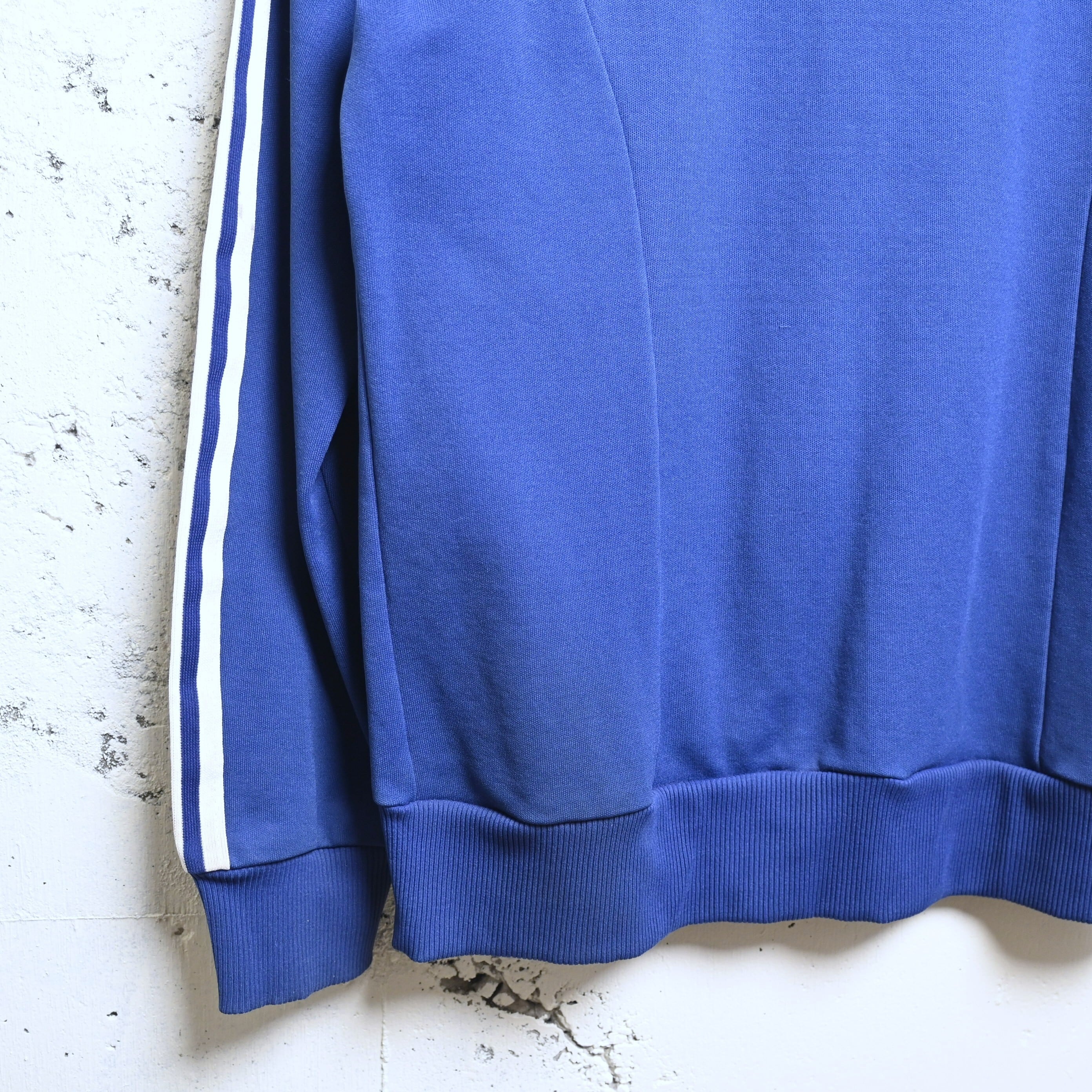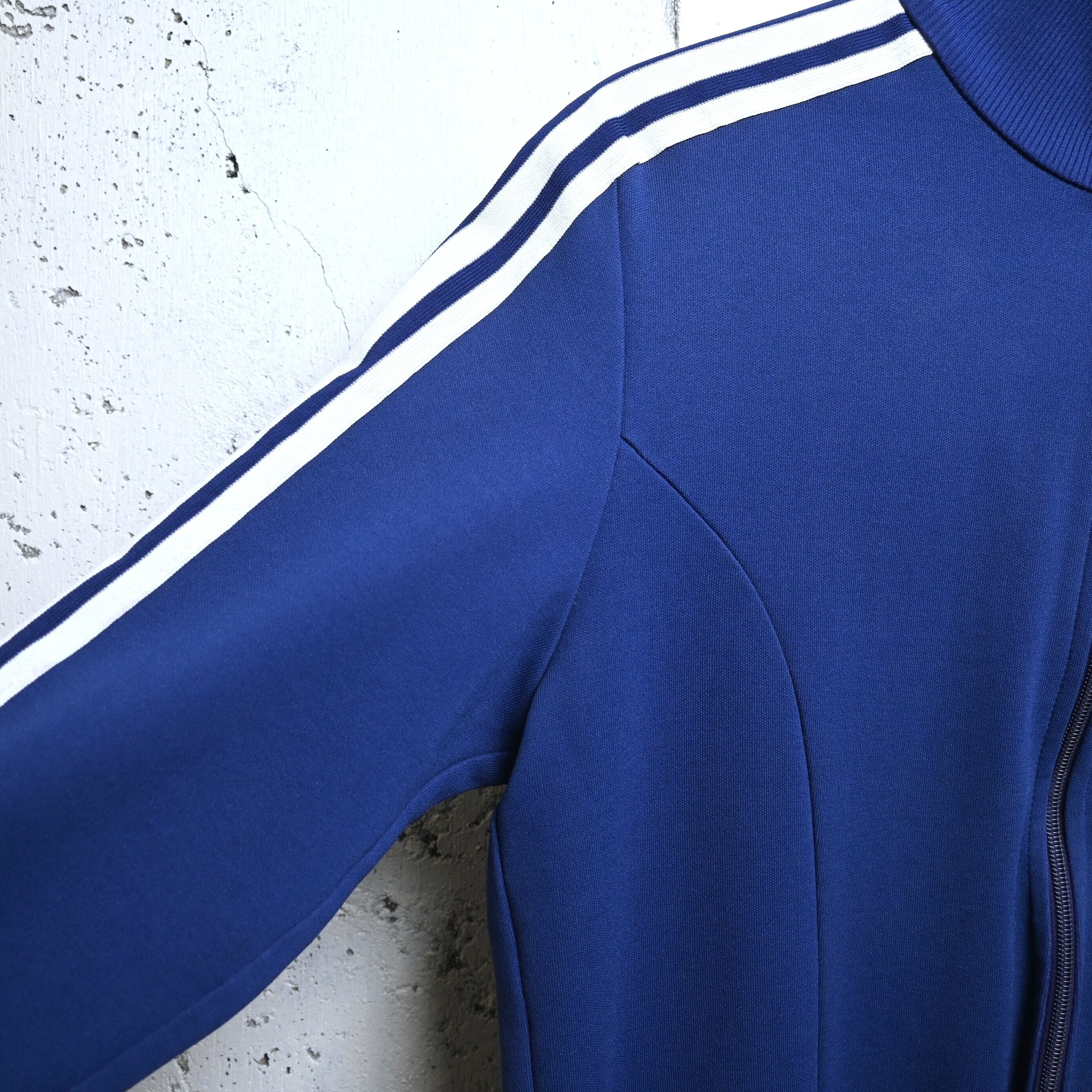 鮮やかなブルーボディにホワイトの3ラインを配した、adidasらしい王道カラーの一着。胸にロゴ刺繍を入れず、曲線的な切り替えのみで構成されたミニマルなデザインは、この年代特有の洗練された空気を感じさせます。