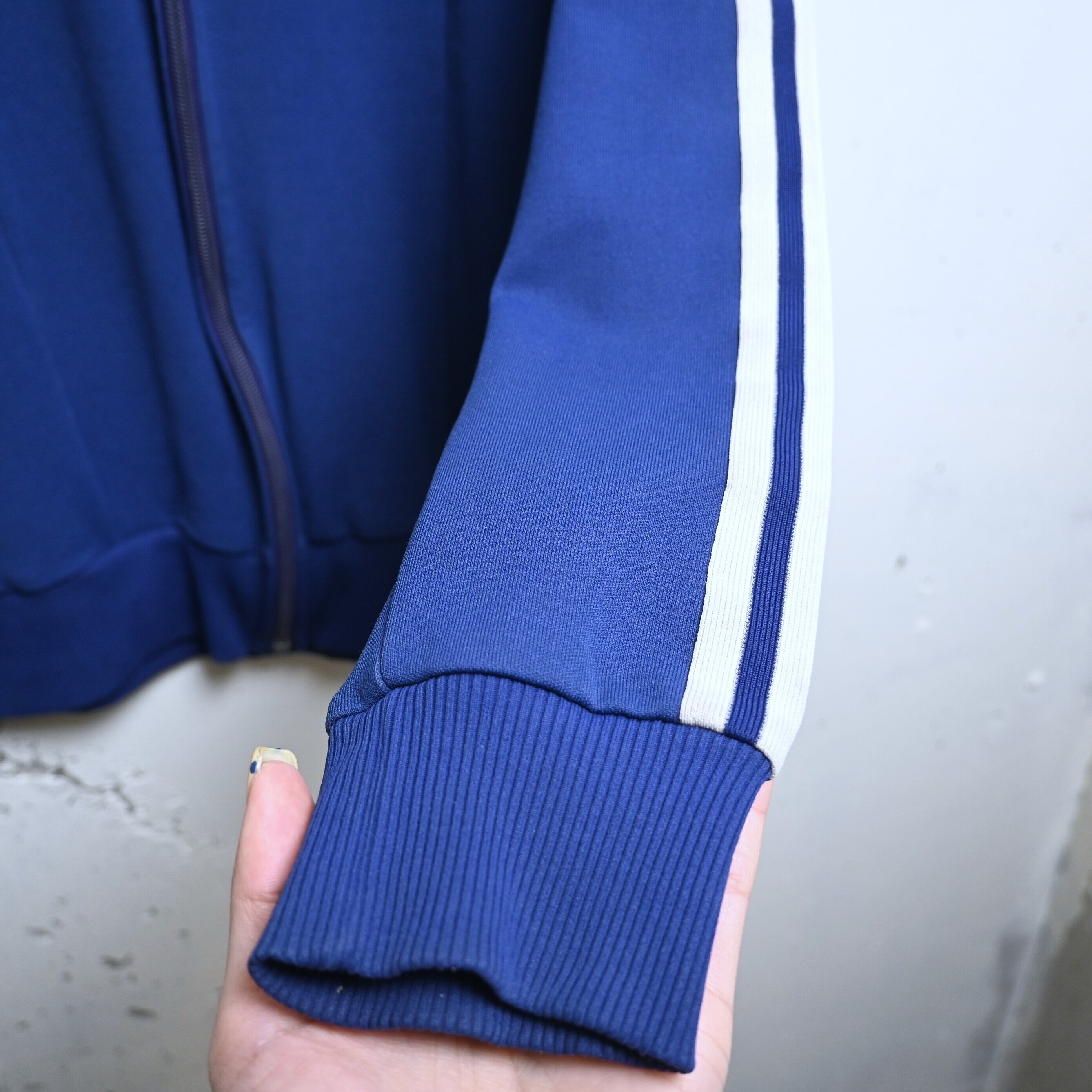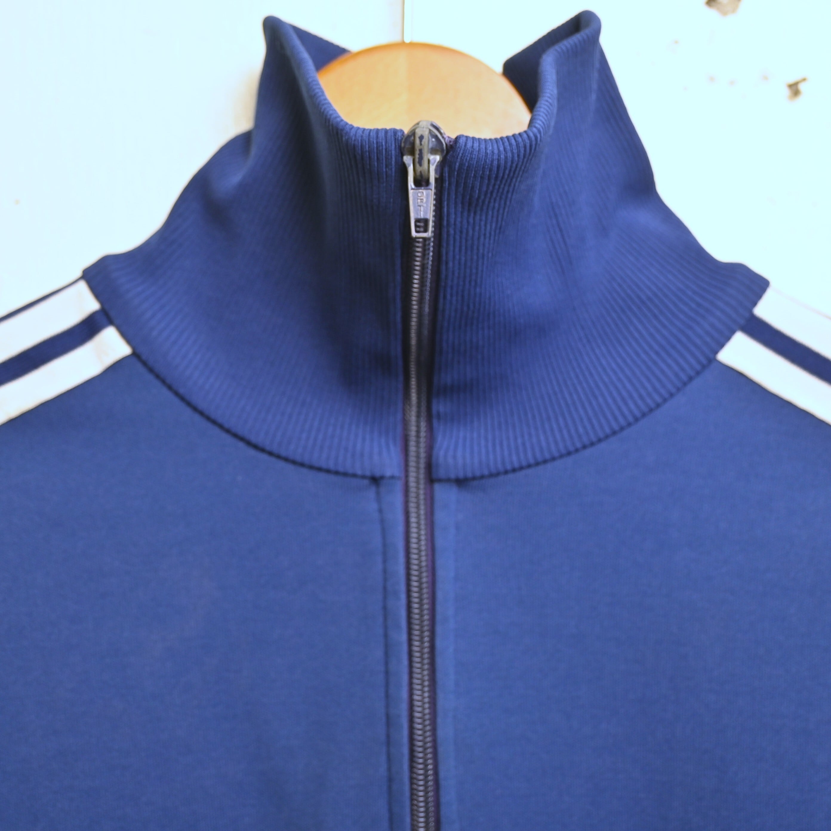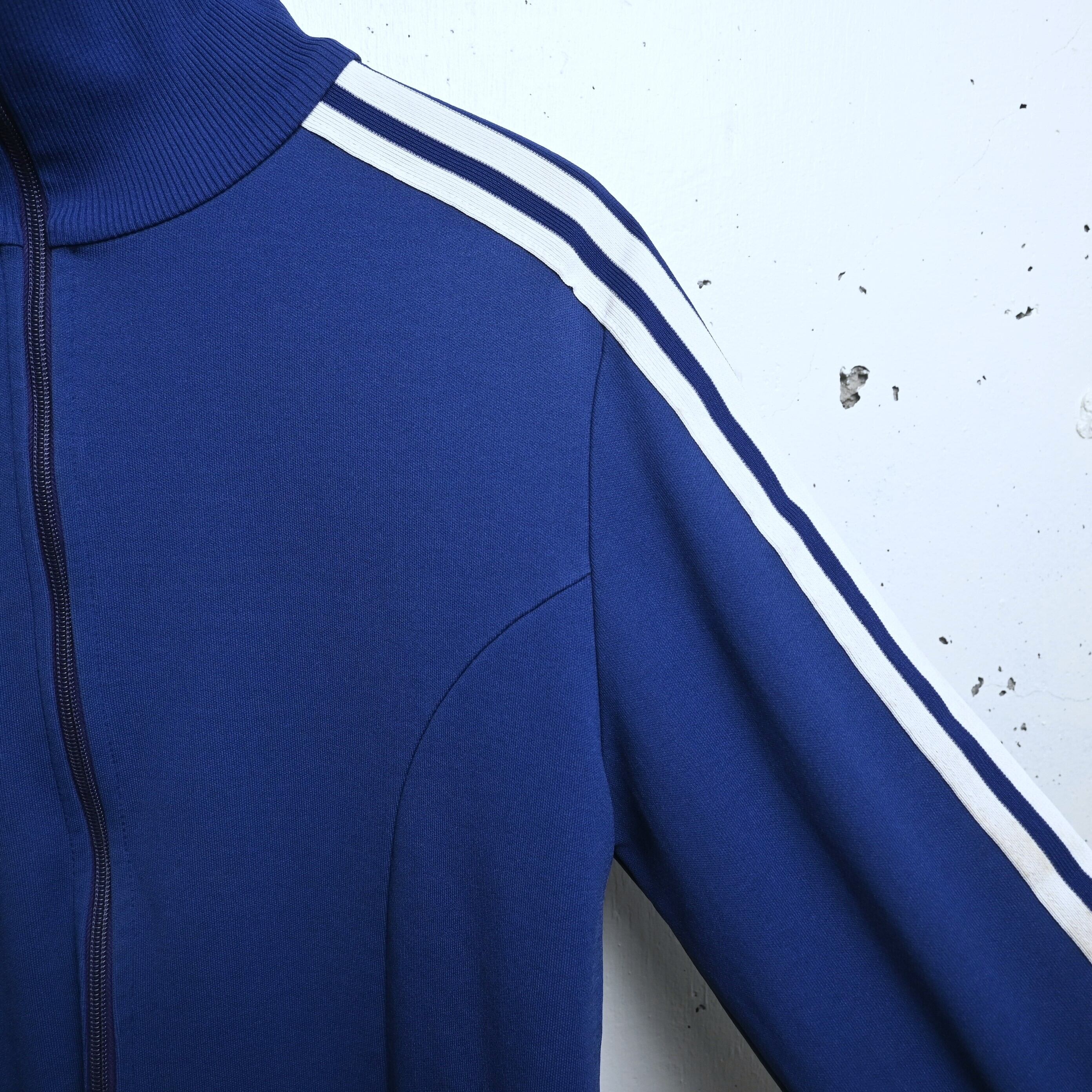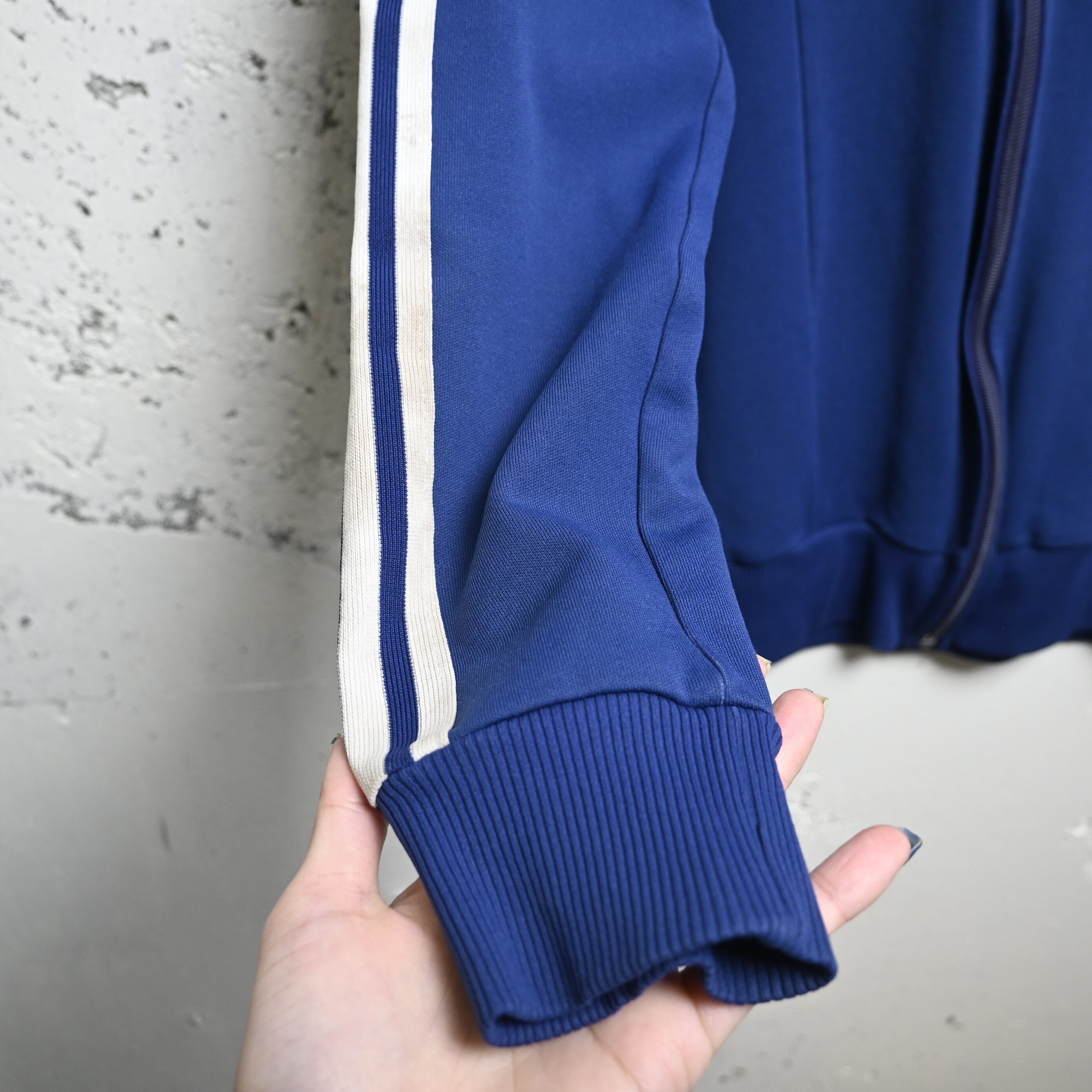 近年は西ドイツ〜ヨーロッパ生産期の無地系トラックジャケットも評価が高く、こうしたシンプルなブルー×ホワイト配色は年代問わず安定して人気があります。