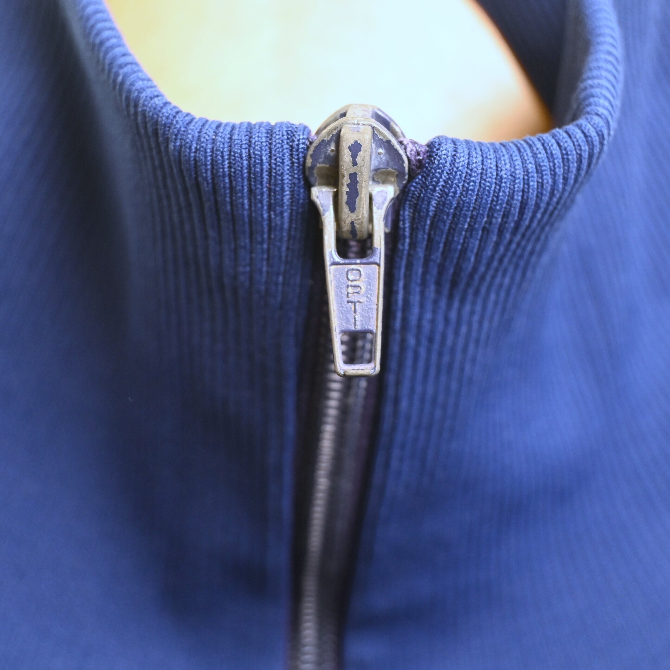 タグは旧トレフォイル表記で、「The trademark with the 3 stripes」の多言語表記が入るヨーロッパ流通期の仕様。当時の欧州向けadidasらしいタグディテールです。フロントジップにはYKKとは異なる当時のヨーロッパ系ジップが使用され、首元まで高く立ち上がるロングリブネックも70〜80年代adidasの象徴的なディテールです。