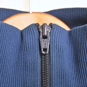 首元は長めに設計されたハイネックリブ仕様で、ジップを上まで閉めた際の立ち上がりが非常にきれいです。生地はポリエステル100%ながら現行よりもやや厚みがあり、表面はマットでしなやかな質感。着丈の短いバランスもこの年代らしく、ワイドパンツ・デニム・軍パンとの相性も非常に良好です。