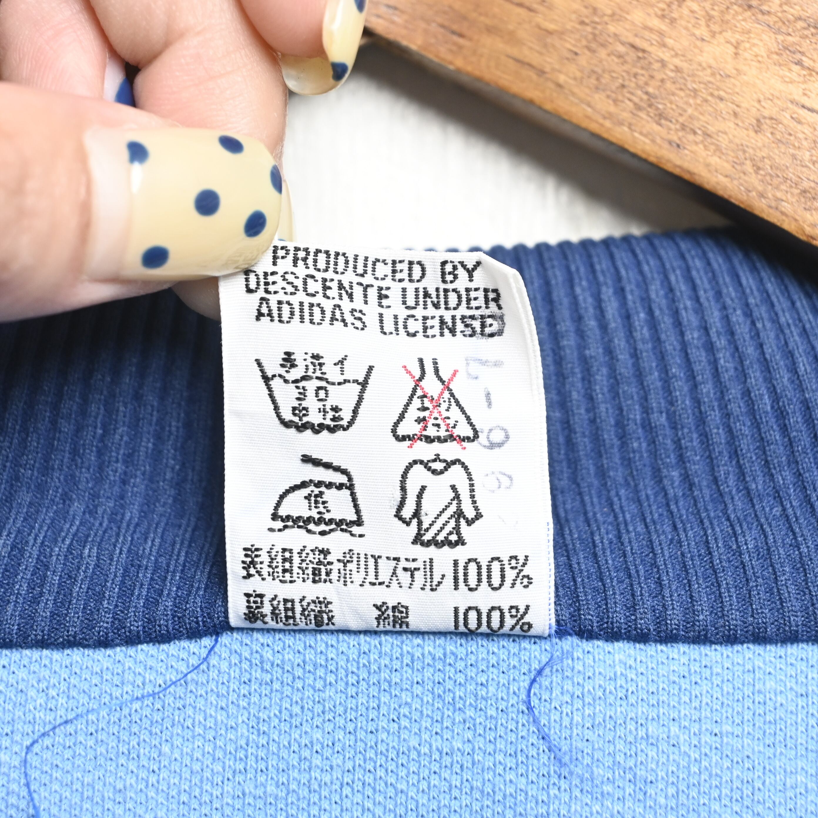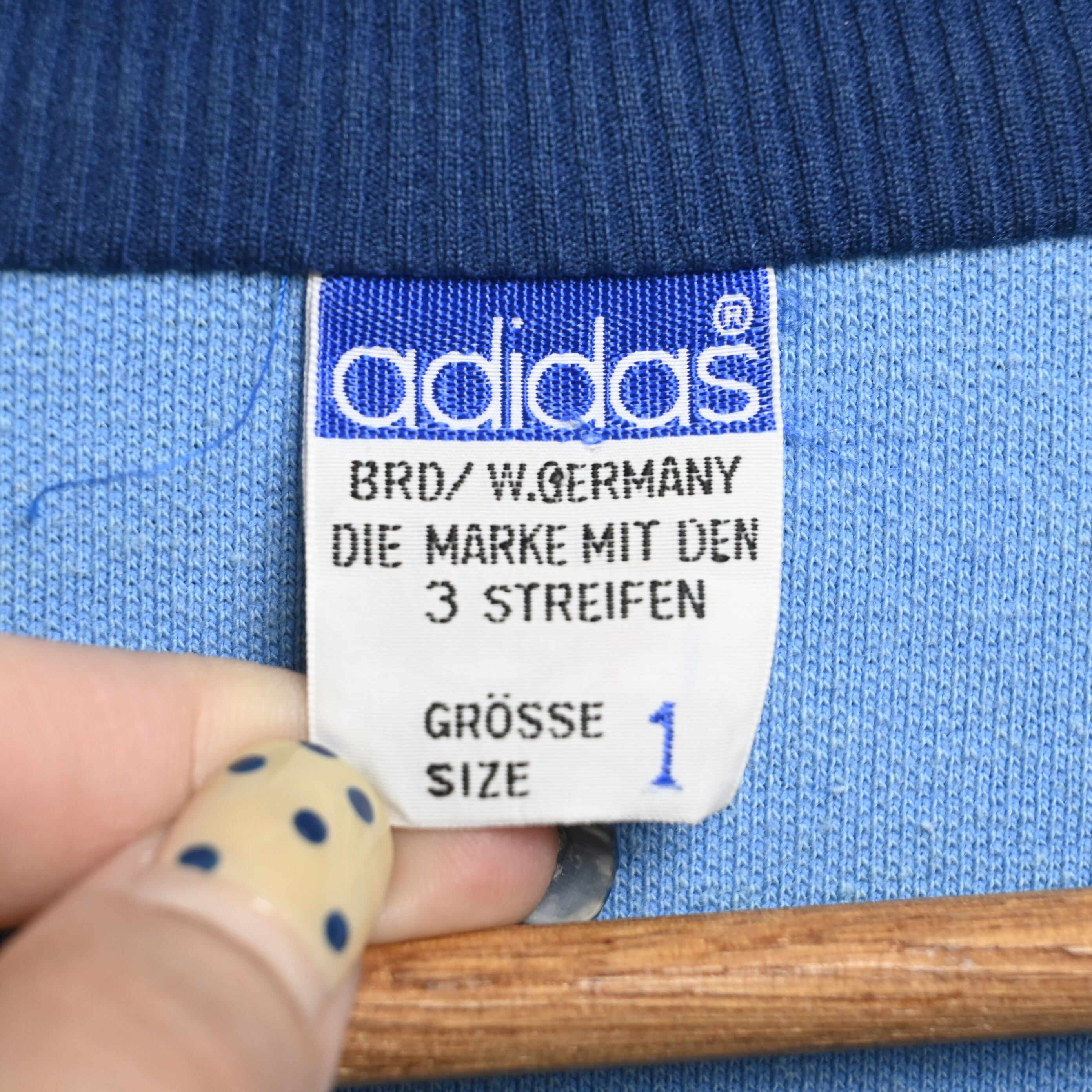 タグには「BRD / W.GERMANY」表記が入り、日本国内でDescenteがライセンス生産を手掛けていた70年代ヴィンテージadidasの代表的な仕様。胸ではなく裾付近に小さく配置されたトレフォイルワッペンが、この年代特有の上品で控えめなデザインバランスを作っています。