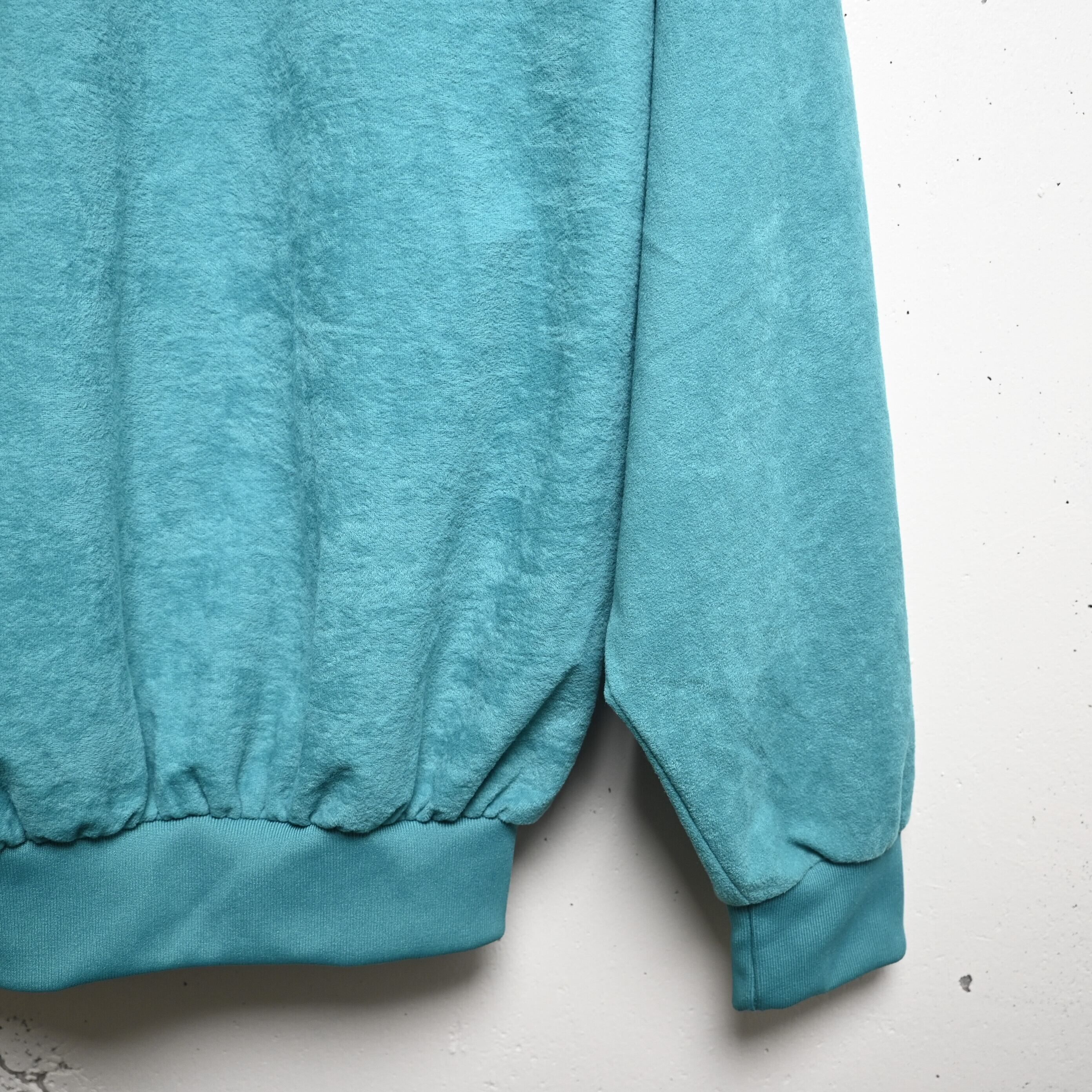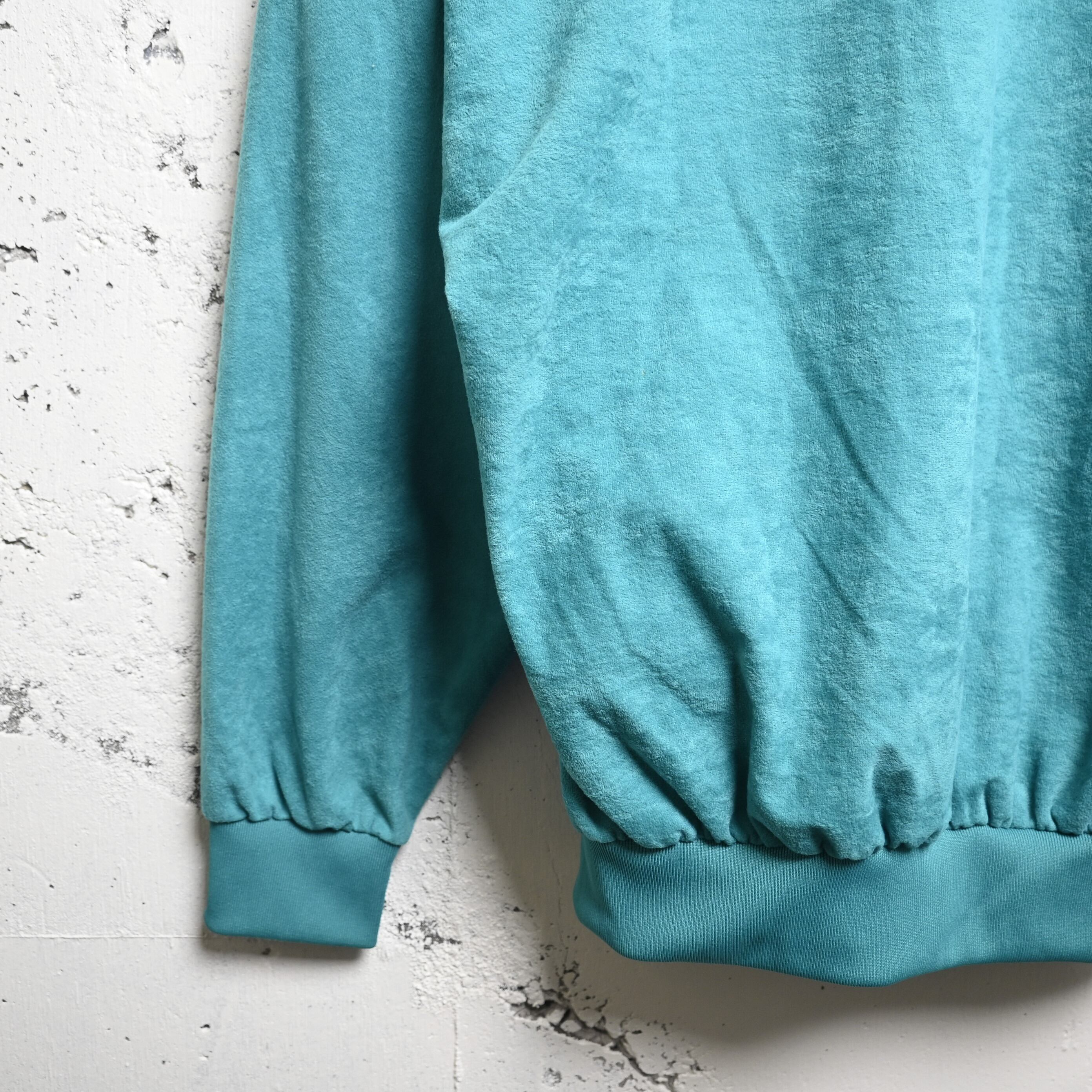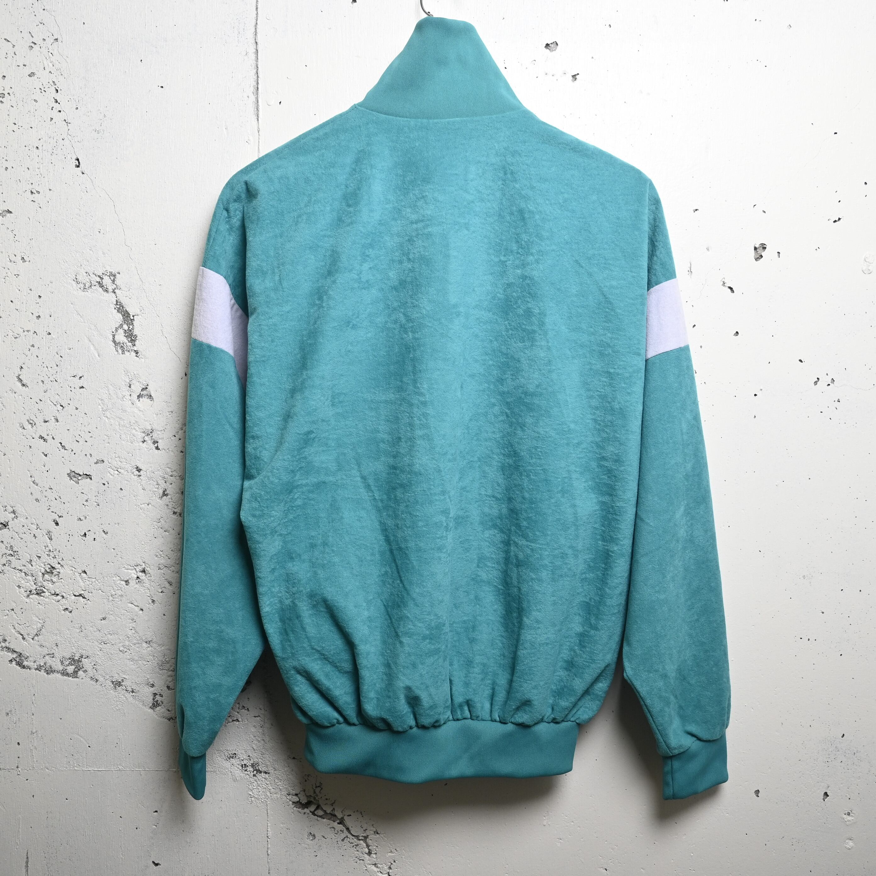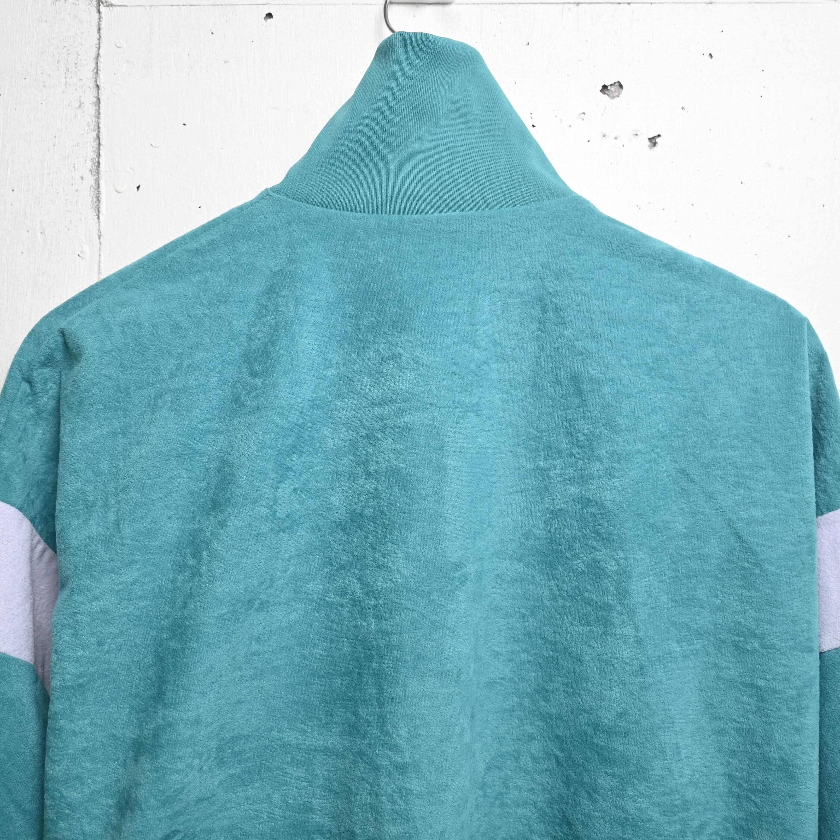 生地はポリエステル100%ながら、表面はやわらかく起毛したベロア調素材。一般的なジャージ素材とは異なり、光の当たり方で表情が変わる柔らかな質感があり、80〜90年代ユーロ古着特有の空気を感じられます。