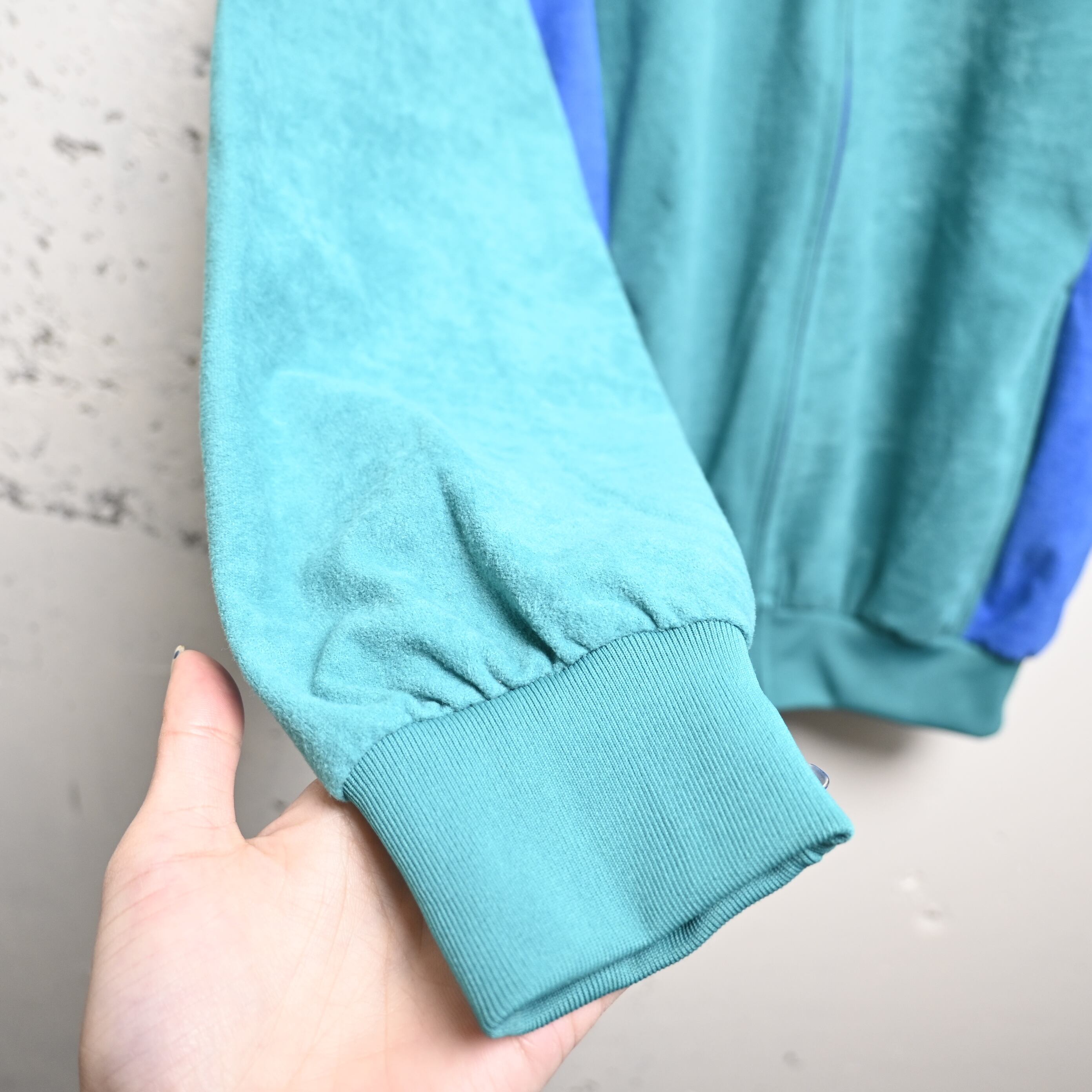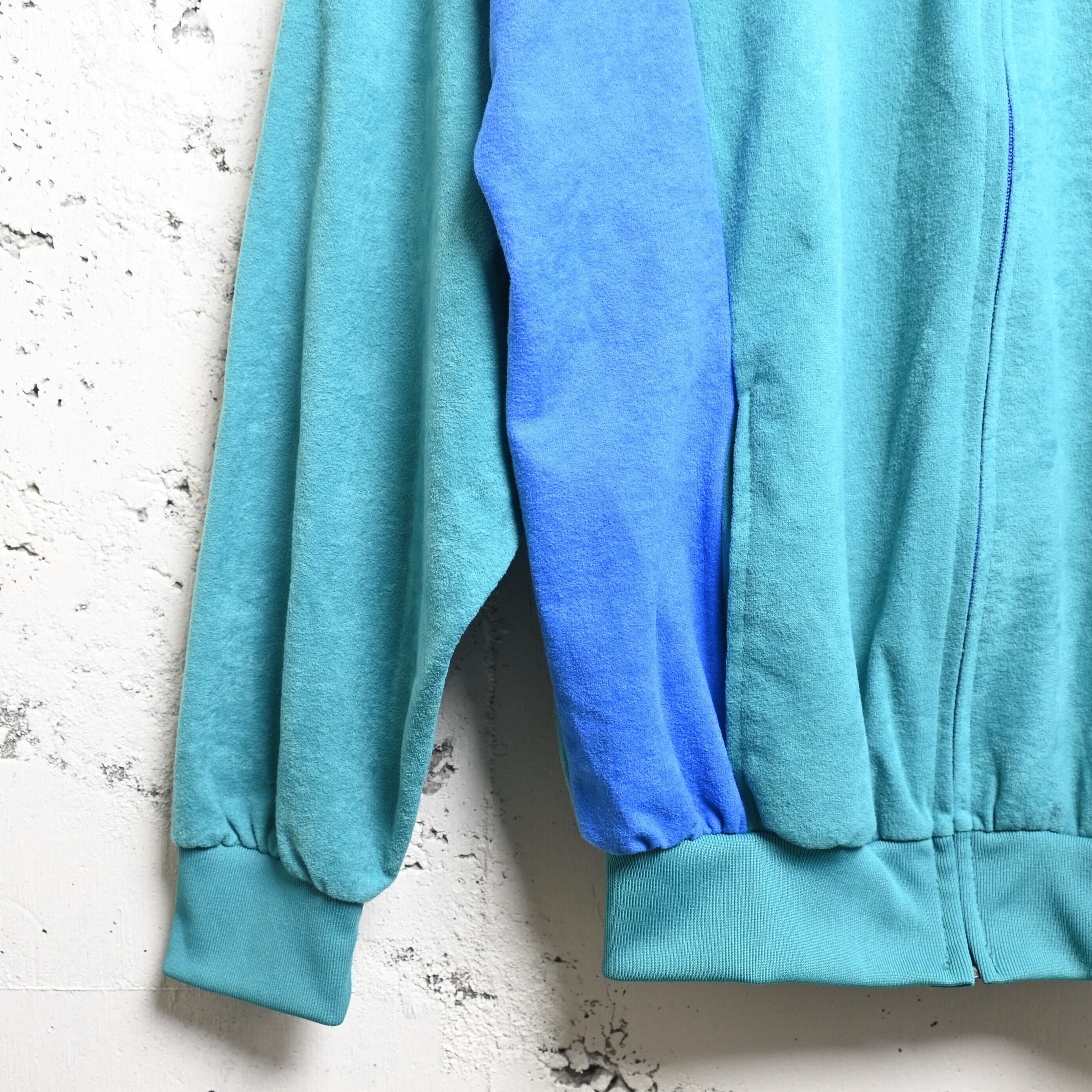 カラーはブルーグリーンをベースに、両脇へ鮮やかなブルー、袖にグレーの切り替えが入る独特な配色。派手すぎず、それでいてしっかり個性があり、ヨーロッパ古着らしい絶妙な色使いです。フロントはミニマルにまとめられ、配色の美しさが際立つバランスになっています。