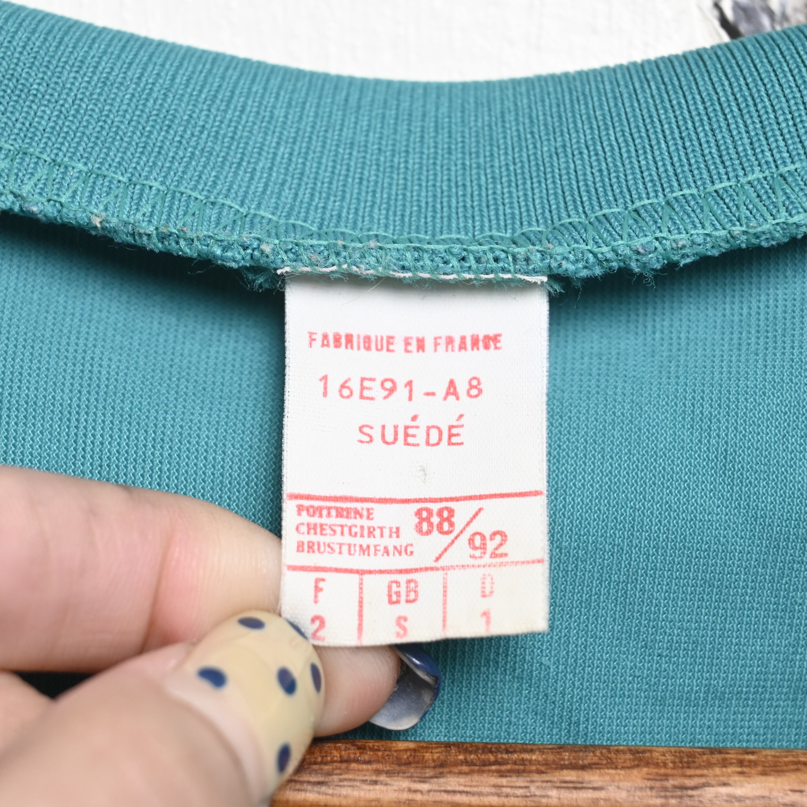 タグには「FABRIQUÉ EN FRANCE」表記が入り、フランス流通のユーロスポーツウェアらしい一着。ブランド表記はありませんが、この時代のヨーロッパ圏で多く見られるシンプルで洗練された配色と、素材感を活かしたデザインが魅力です。