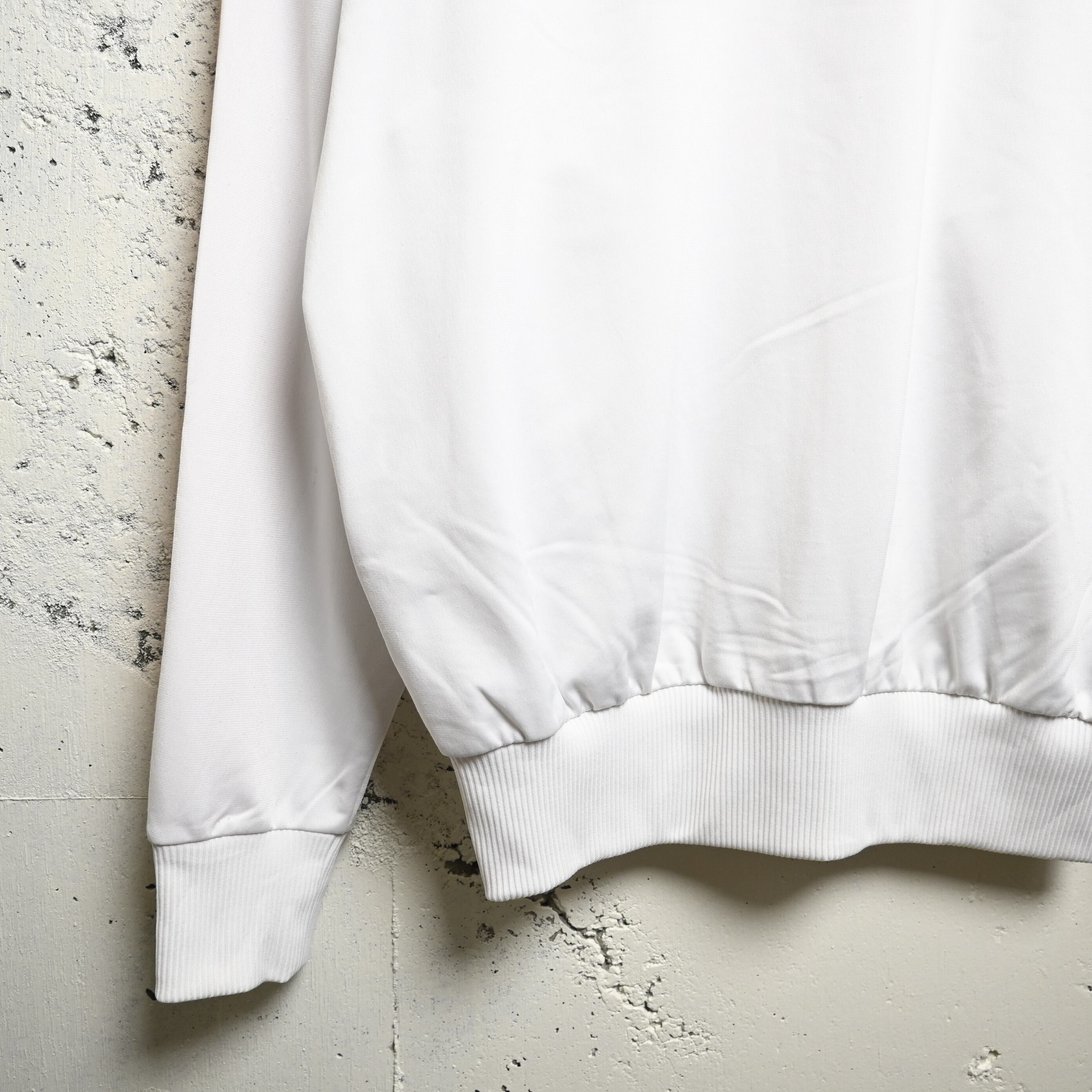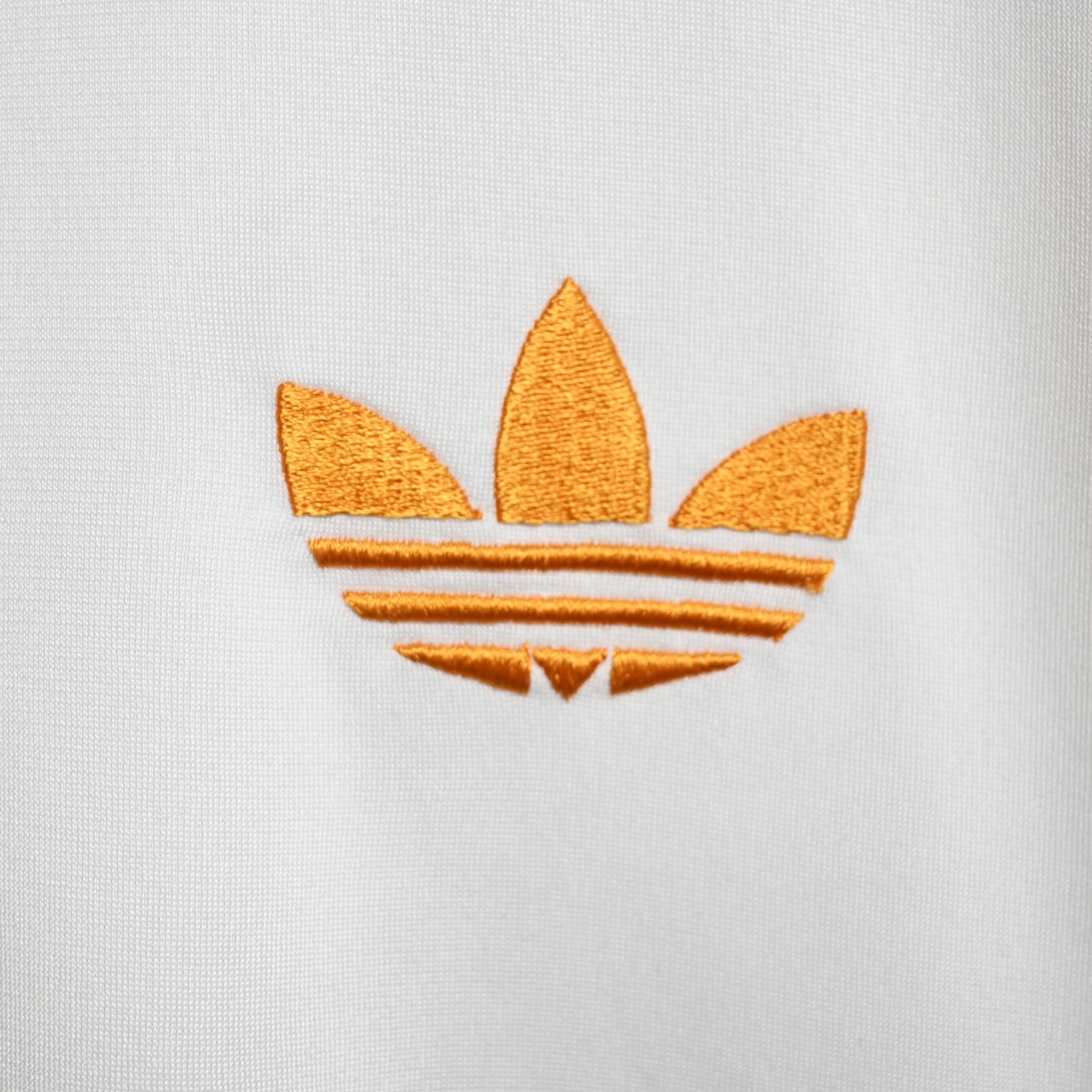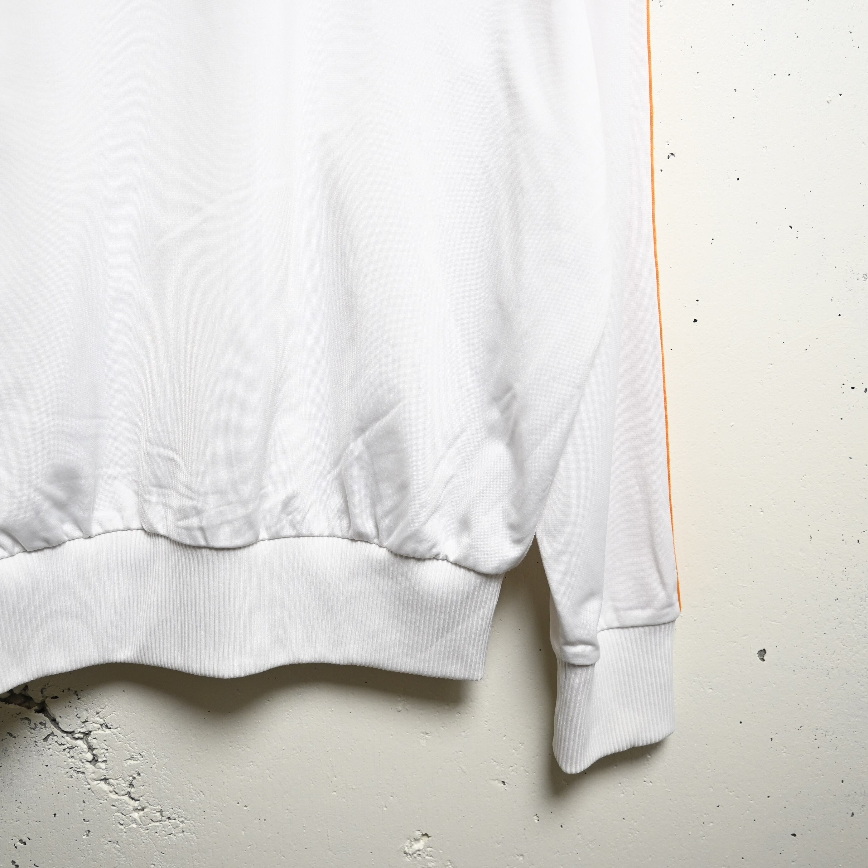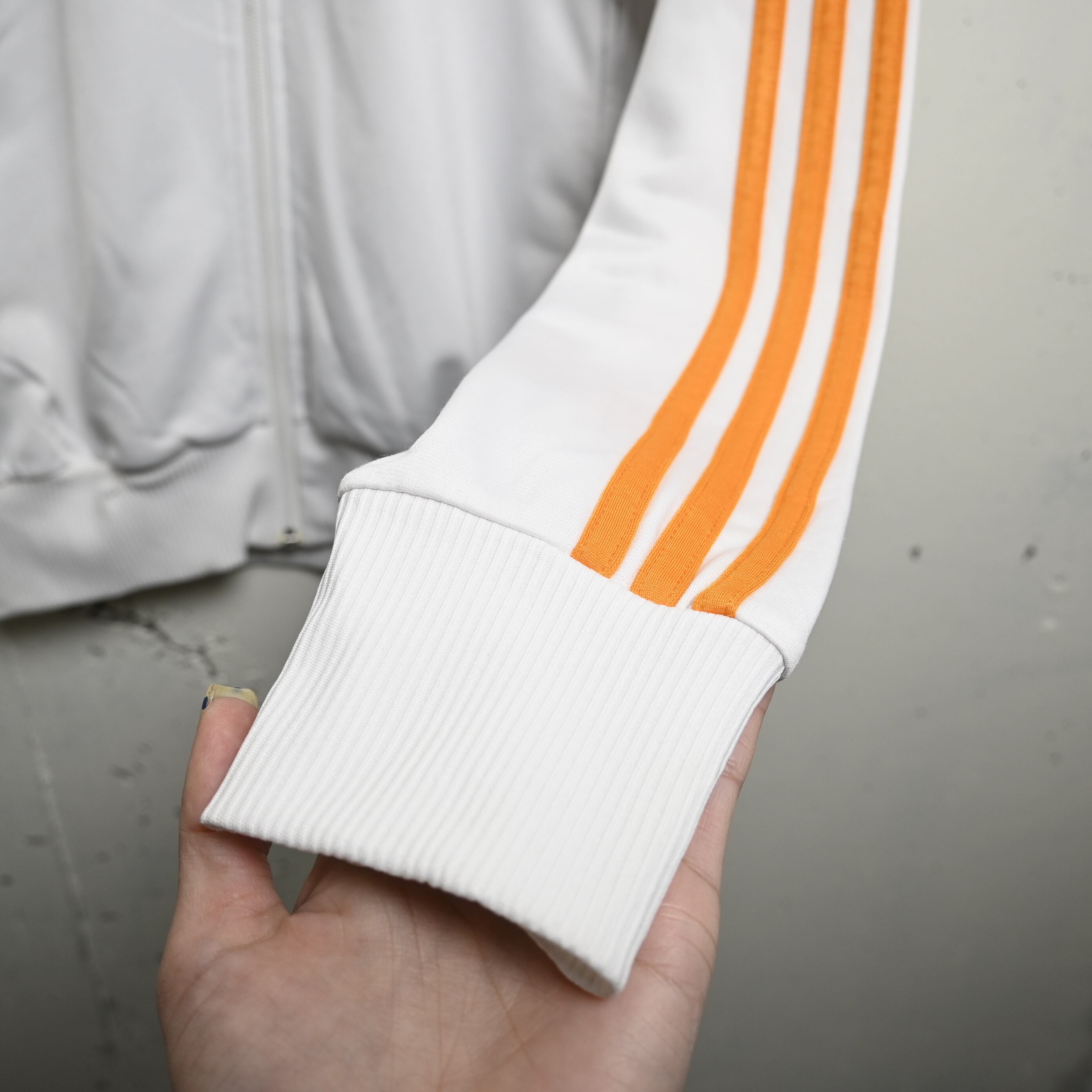 ボディはクリーンなホワイトをベースに、肩から袖にかけて入る鮮やかなオレンジのスリーストライプが印象的なカラーリング。胸のトレフォイル刺繍も同色で統一され、シンプルながらしっかり存在感のある仕上がりです。白ベースのため軽さがあり、春先はもちろん、インナー使いでも映える一着です。