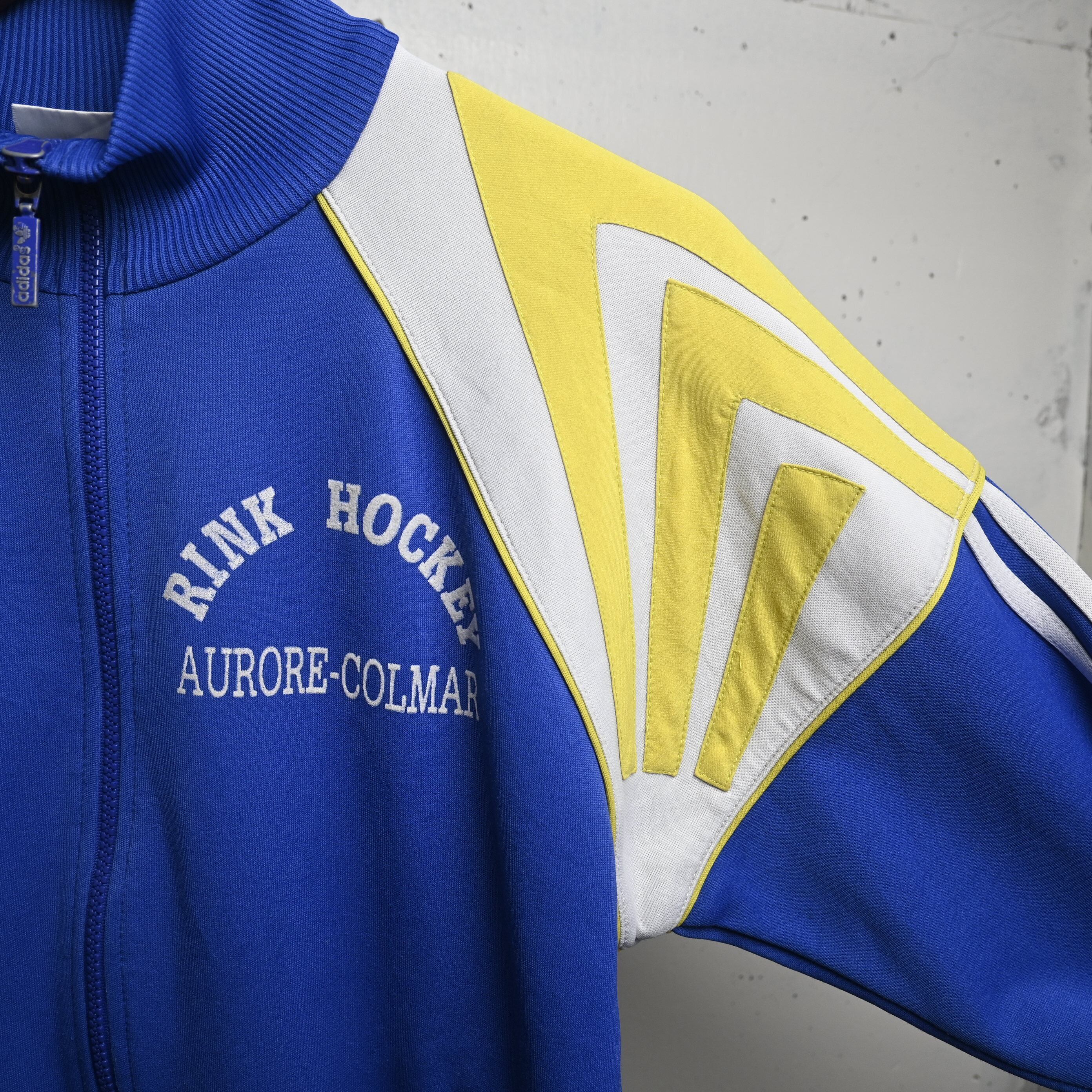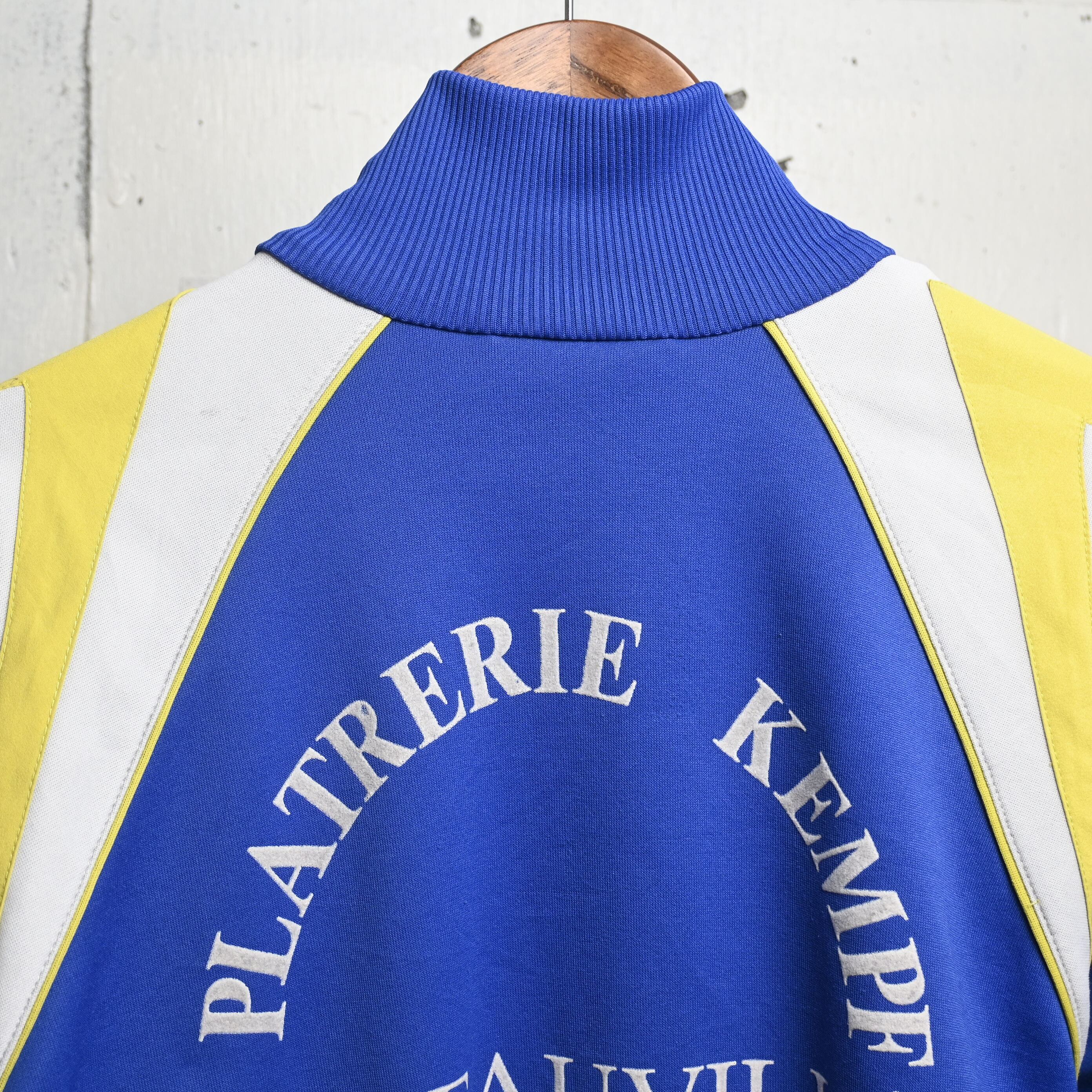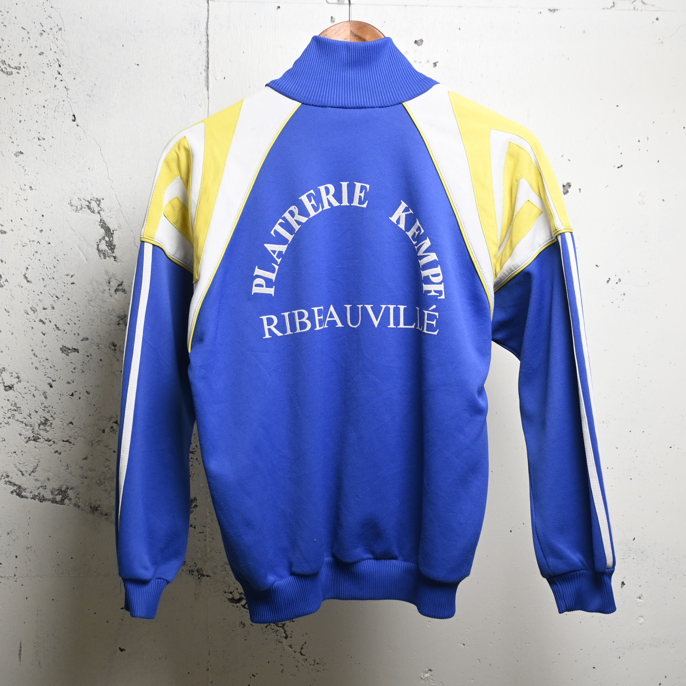 鮮やかなブルーをベースに、イエローとホワイトの大胆な切り替えが入る当時らしい配色で、左胸にはadidasロゴ、右胸にはフランス・アルザス地方のホッケーチームと思われる “RINK HOCKEY AURORE-COLMAR” のプリント、背面には “PLATRERIE KEMPF RIBEAUVILLÉ” の大きなレタリングが入る、非常に個性の強い一着です。