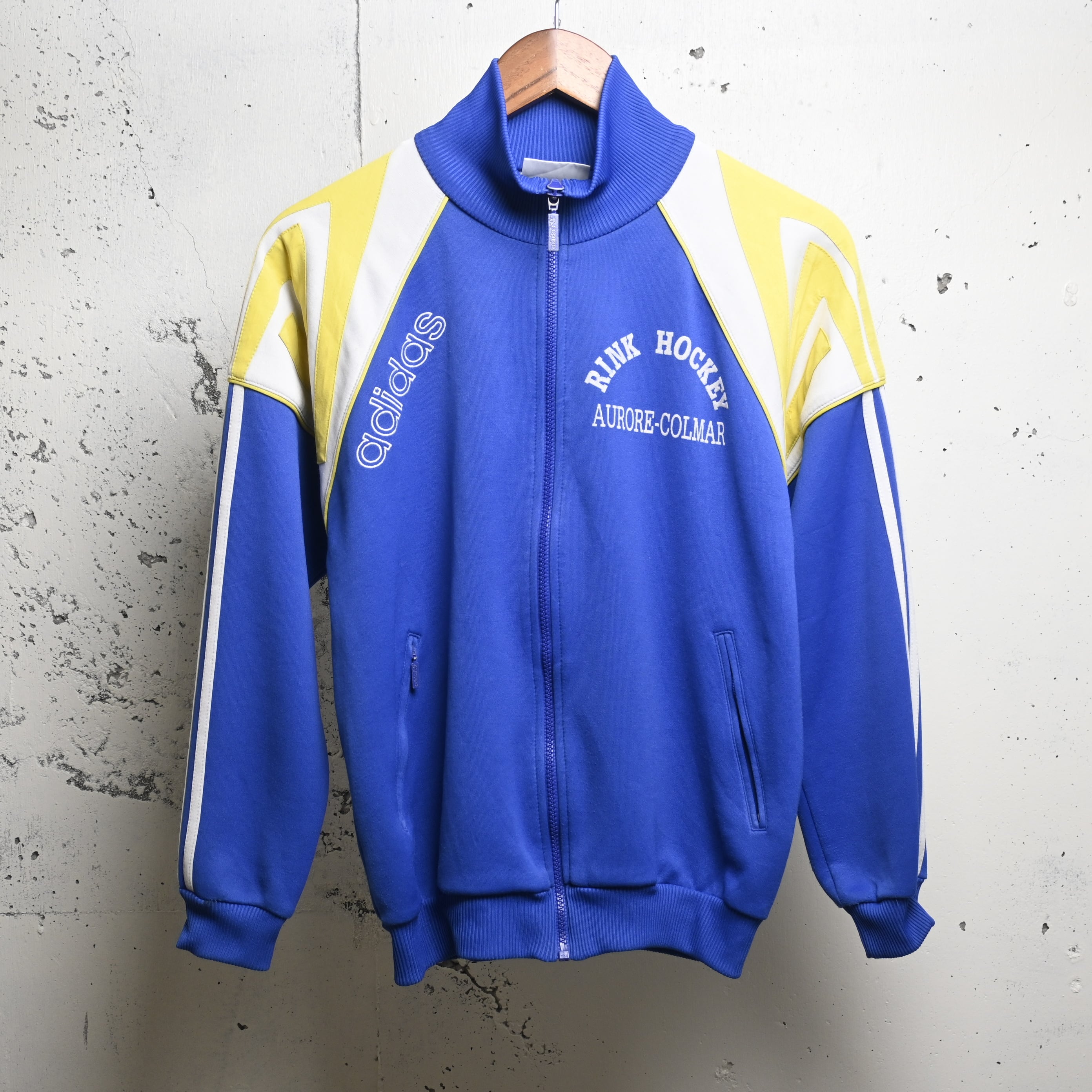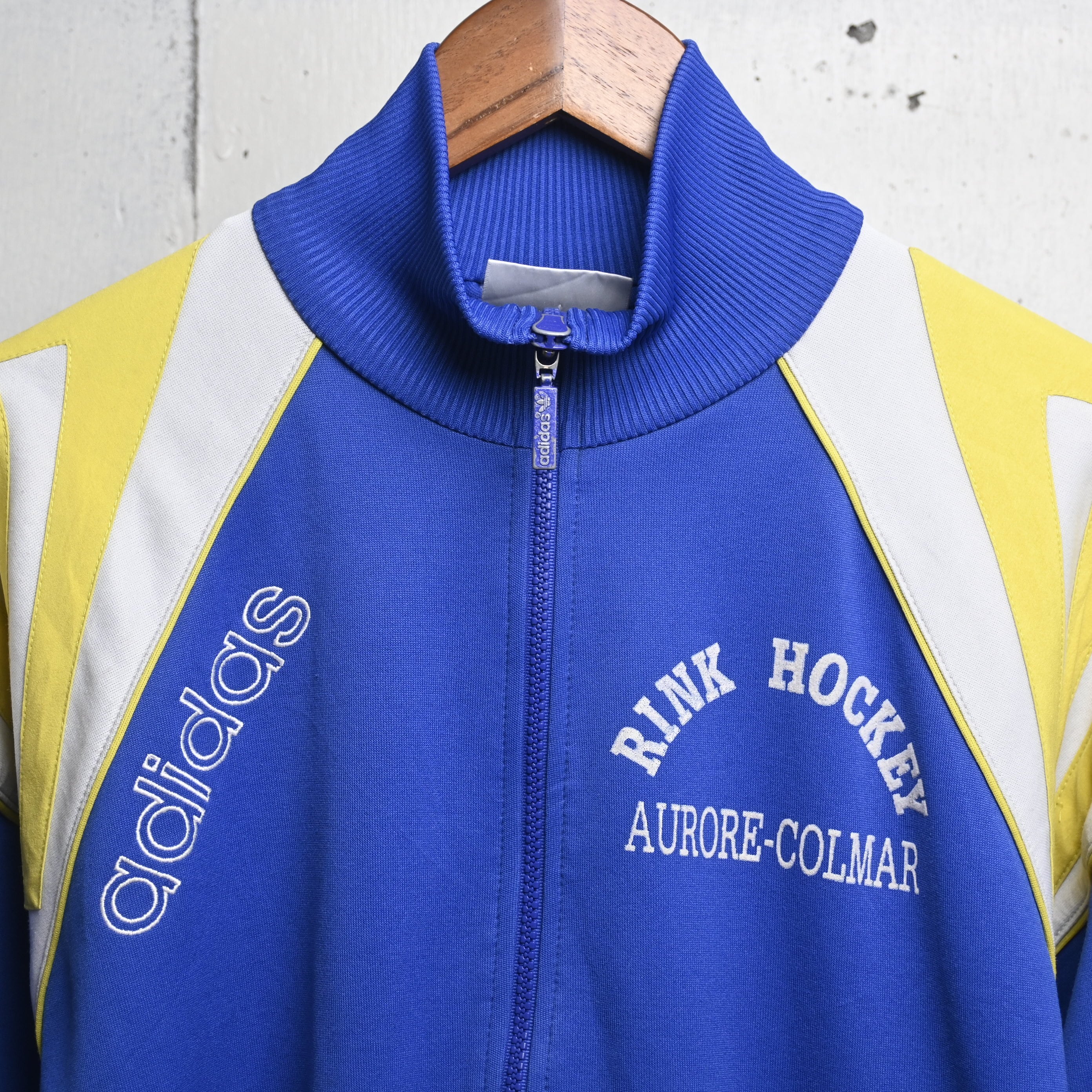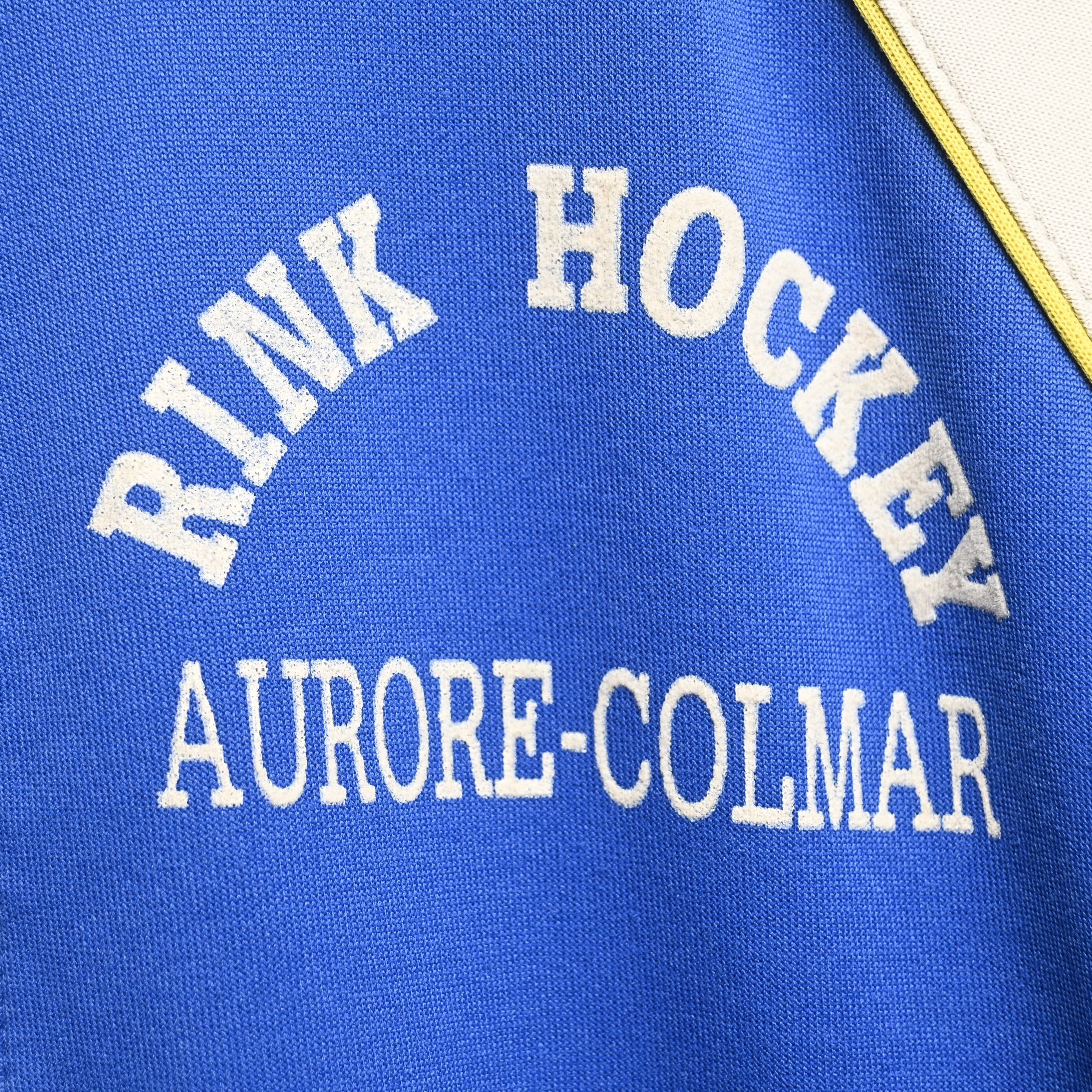 鮮やかなブルーをベースに、イエローとホワイトの大胆な切り替えが入る当時らしい配色で、左胸にはadidasロゴ、右胸にはフランス・アルザス地方のホッケーチームと思われる “RINK HOCKEY AURORE-COLMAR” のプリント、背面には “PLATRERIE KEMPF RIBEAUVILLÉ” の大きなレタリングが入る、非常に個性の強い一着です。