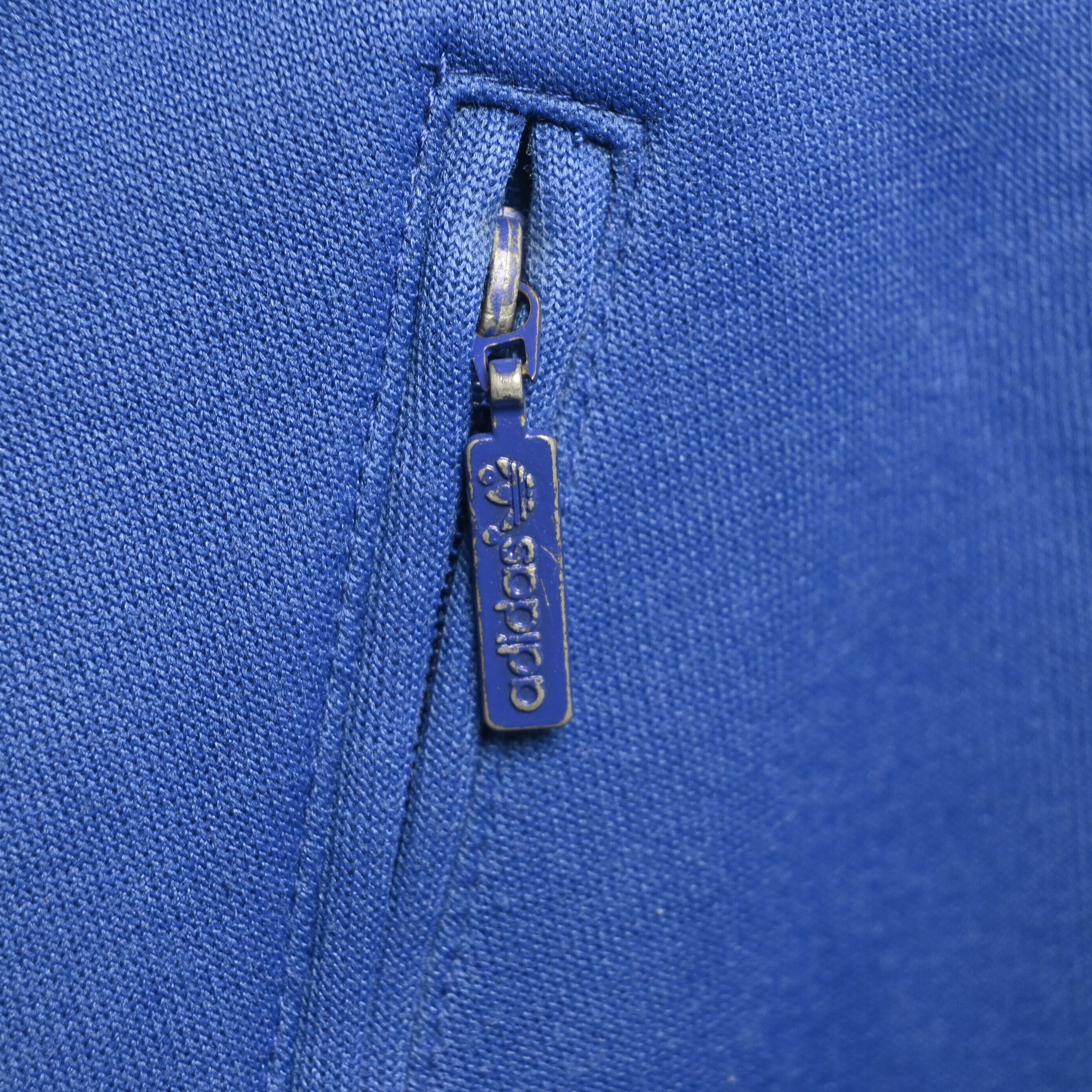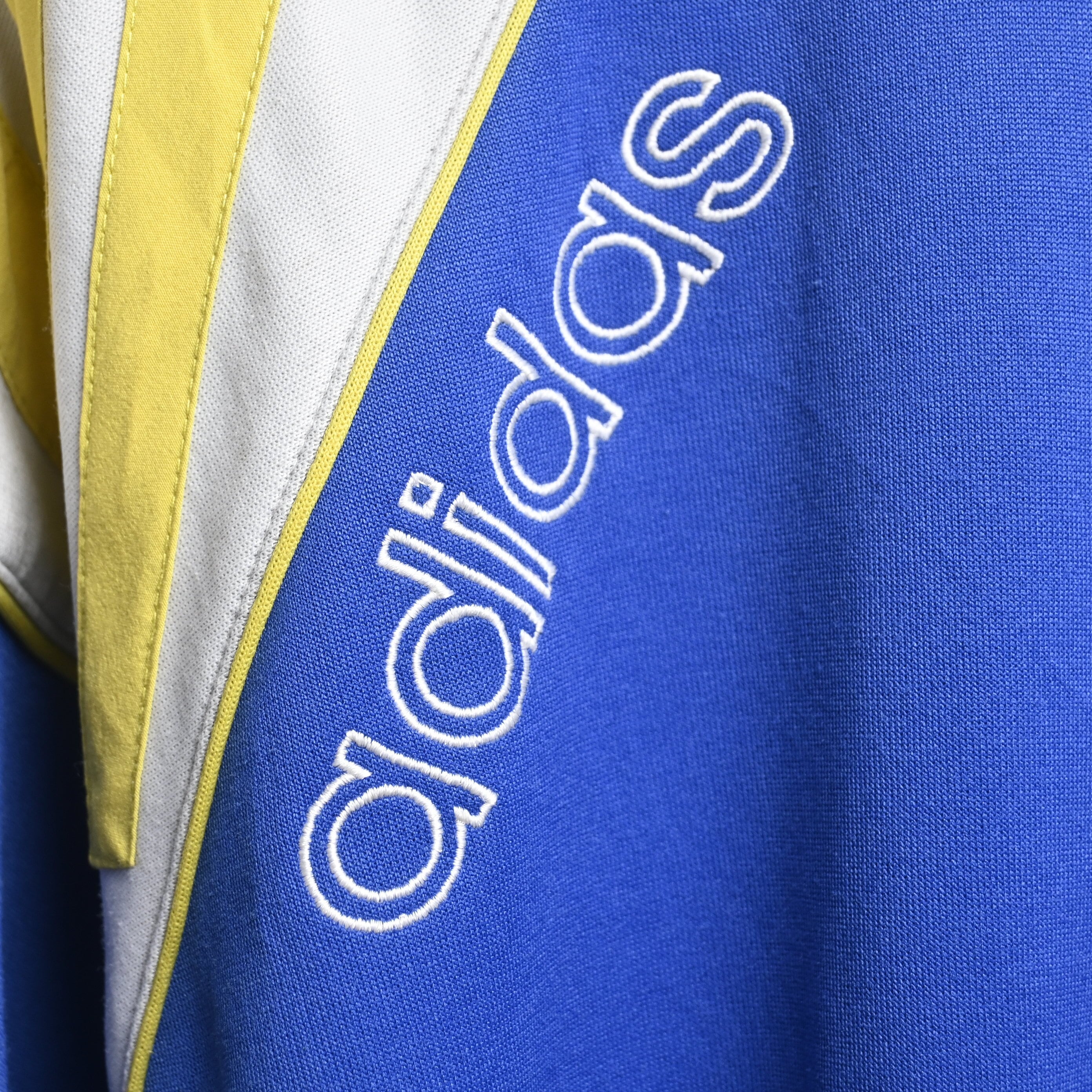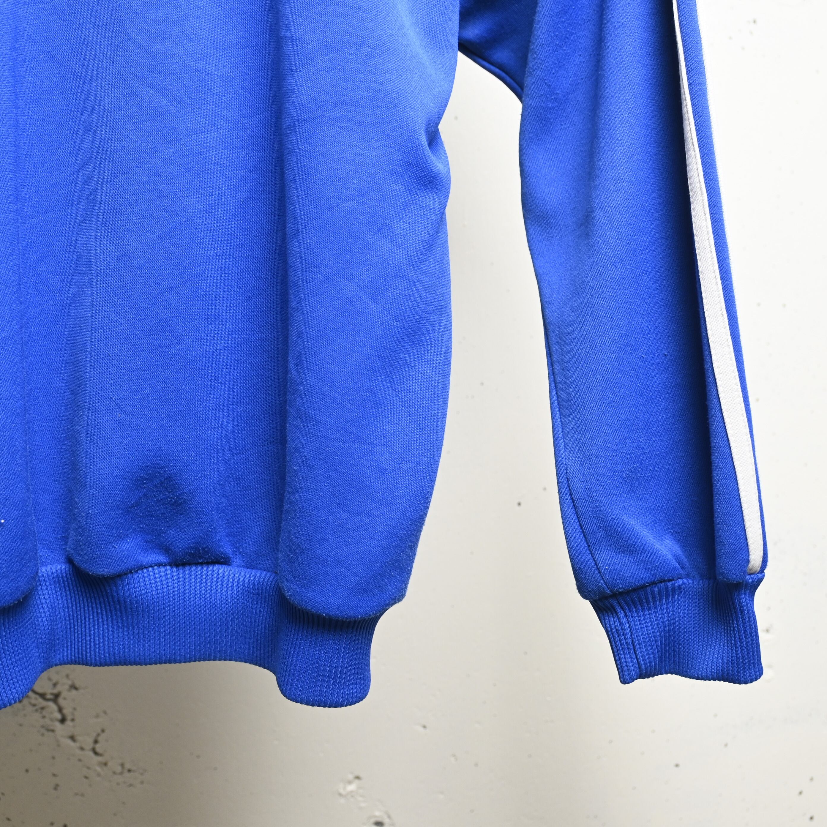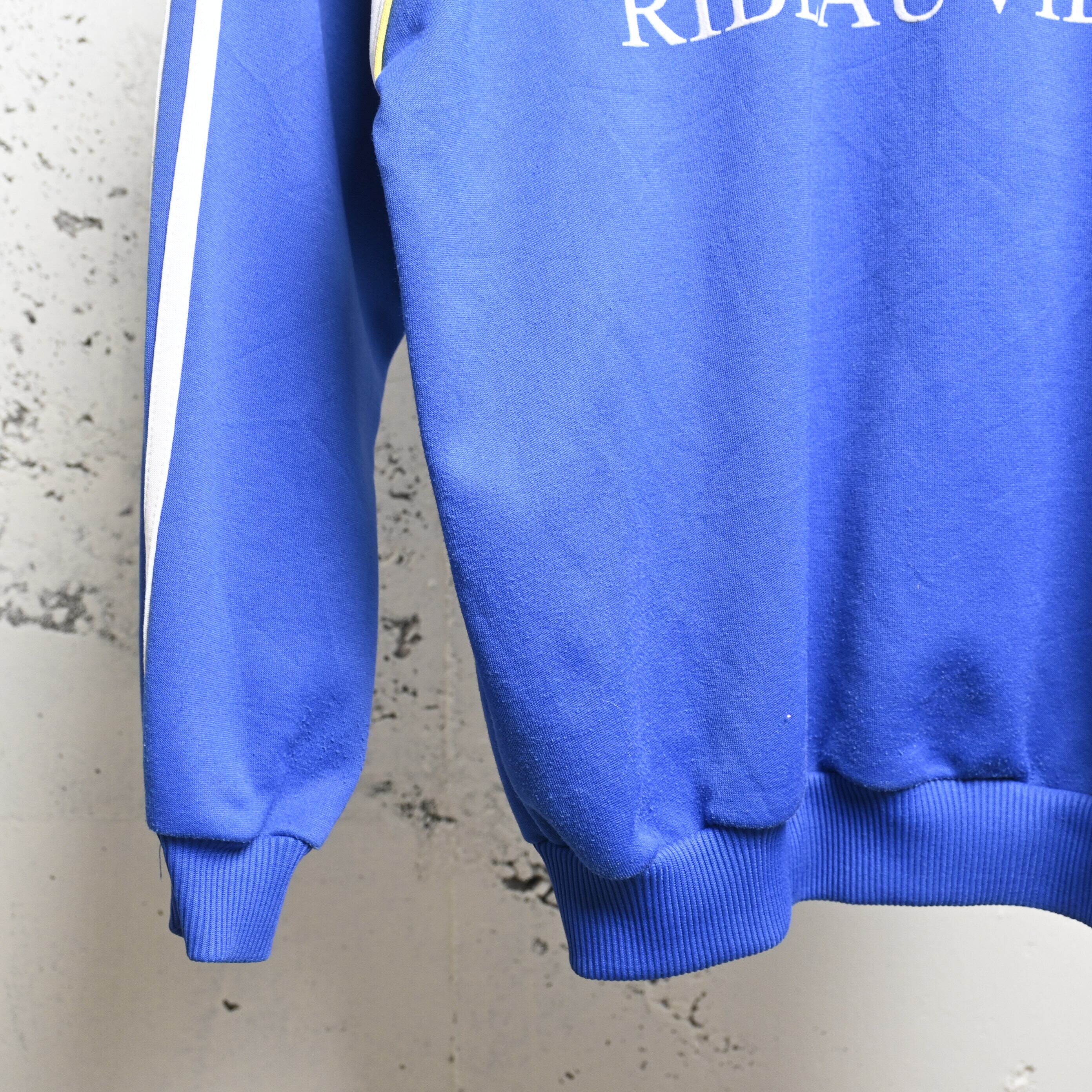 ブルー×イエローの配色はヴィンテージadidasの中でも視認性が高く、デニム・ミリタリーパンツ・トラックパンツまで幅広く合わせられます。チームプリント入りで一点ものらしい魅力も強い個体です。