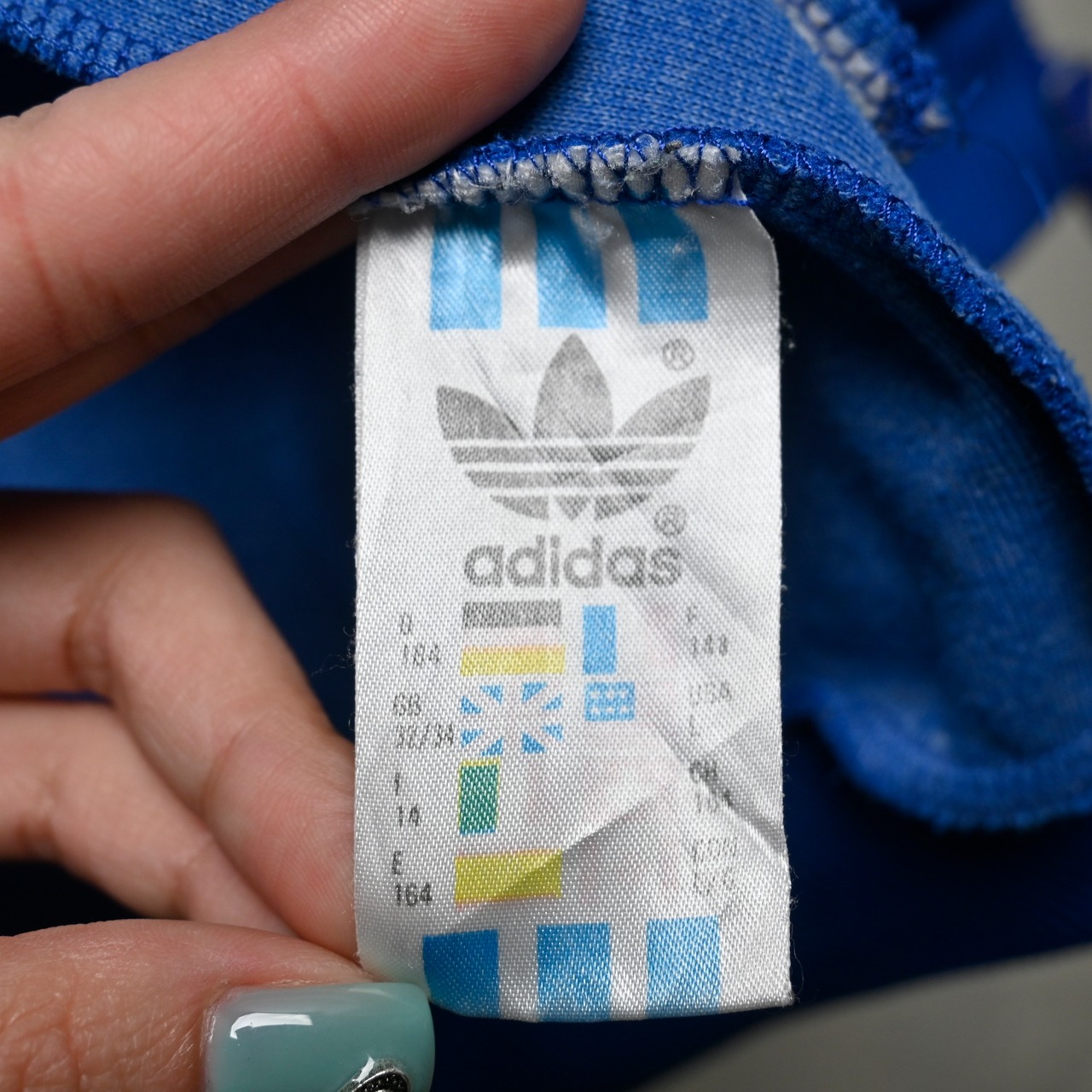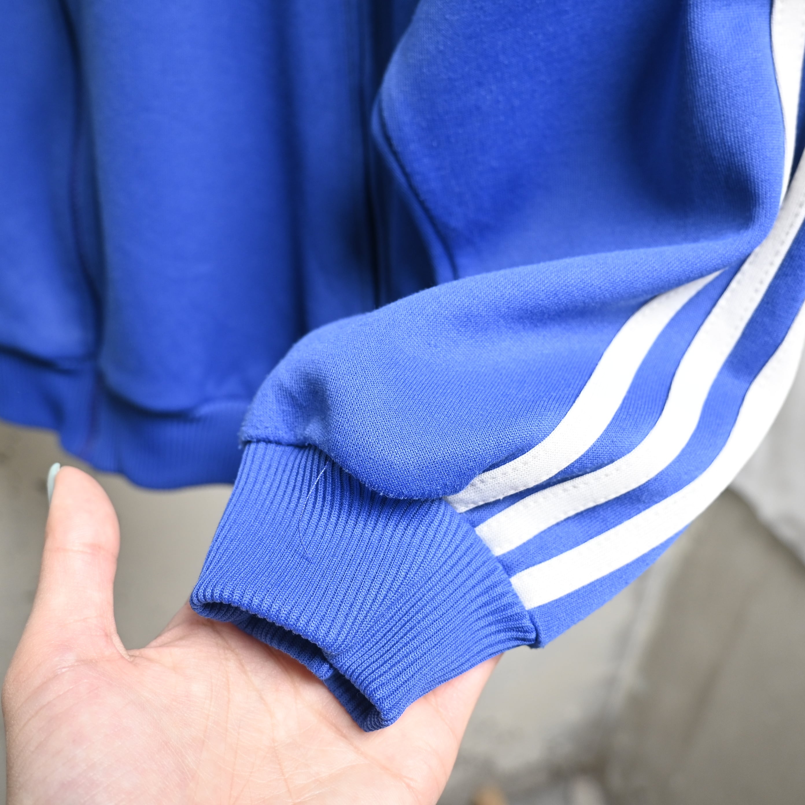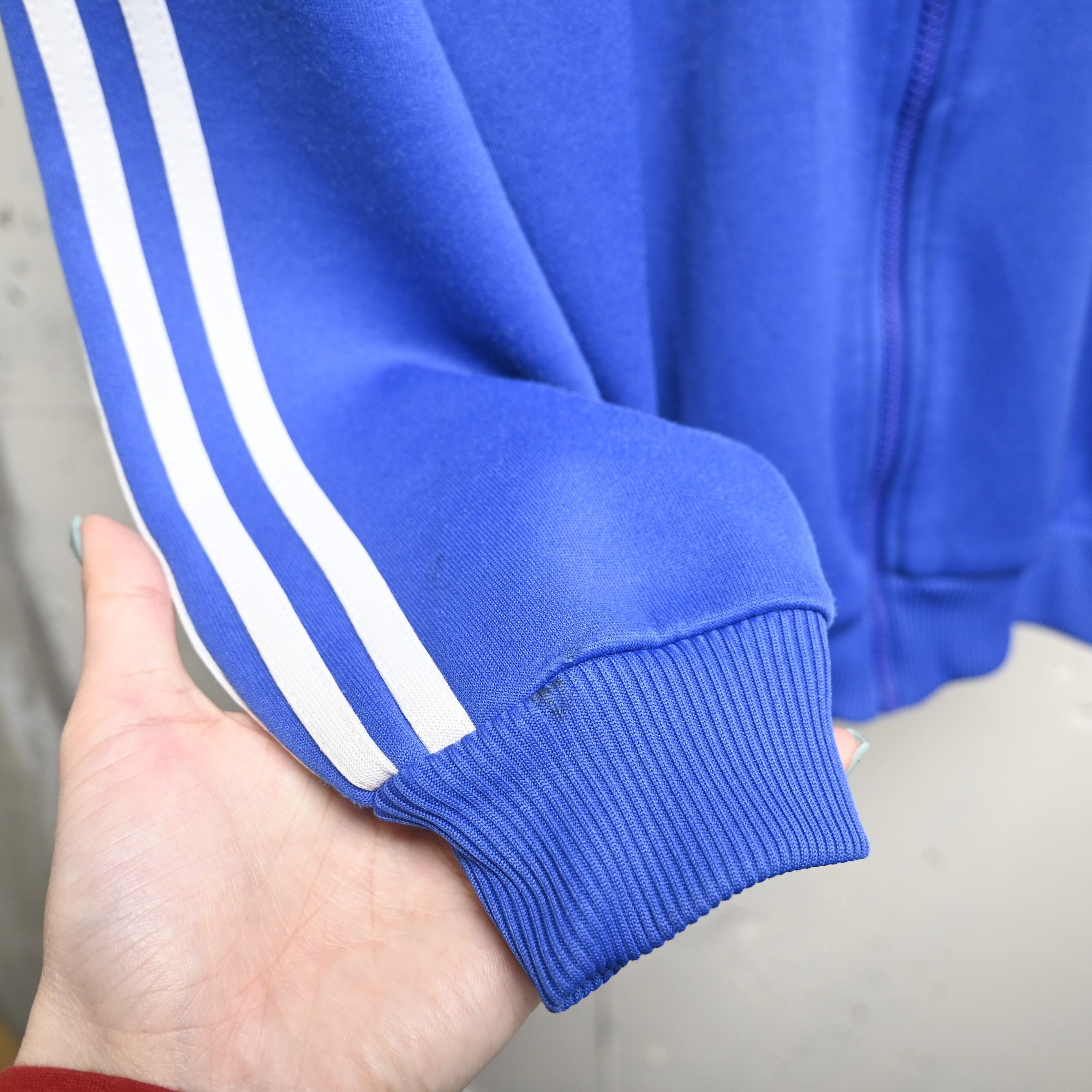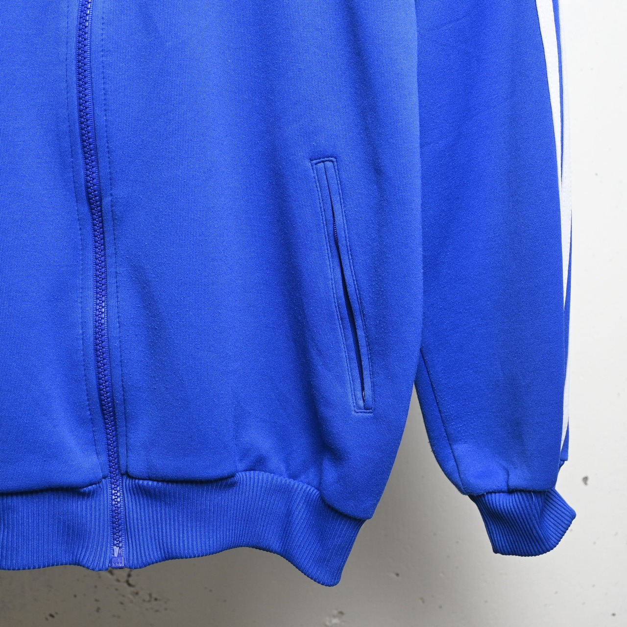 ブルー×イエローの配色はヴィンテージadidasの中でも視認性が高く、デニム・ミリタリーパンツ・トラックパンツまで幅広く合わせられます。チームプリント入りで一点ものらしい魅力も強い個体です。