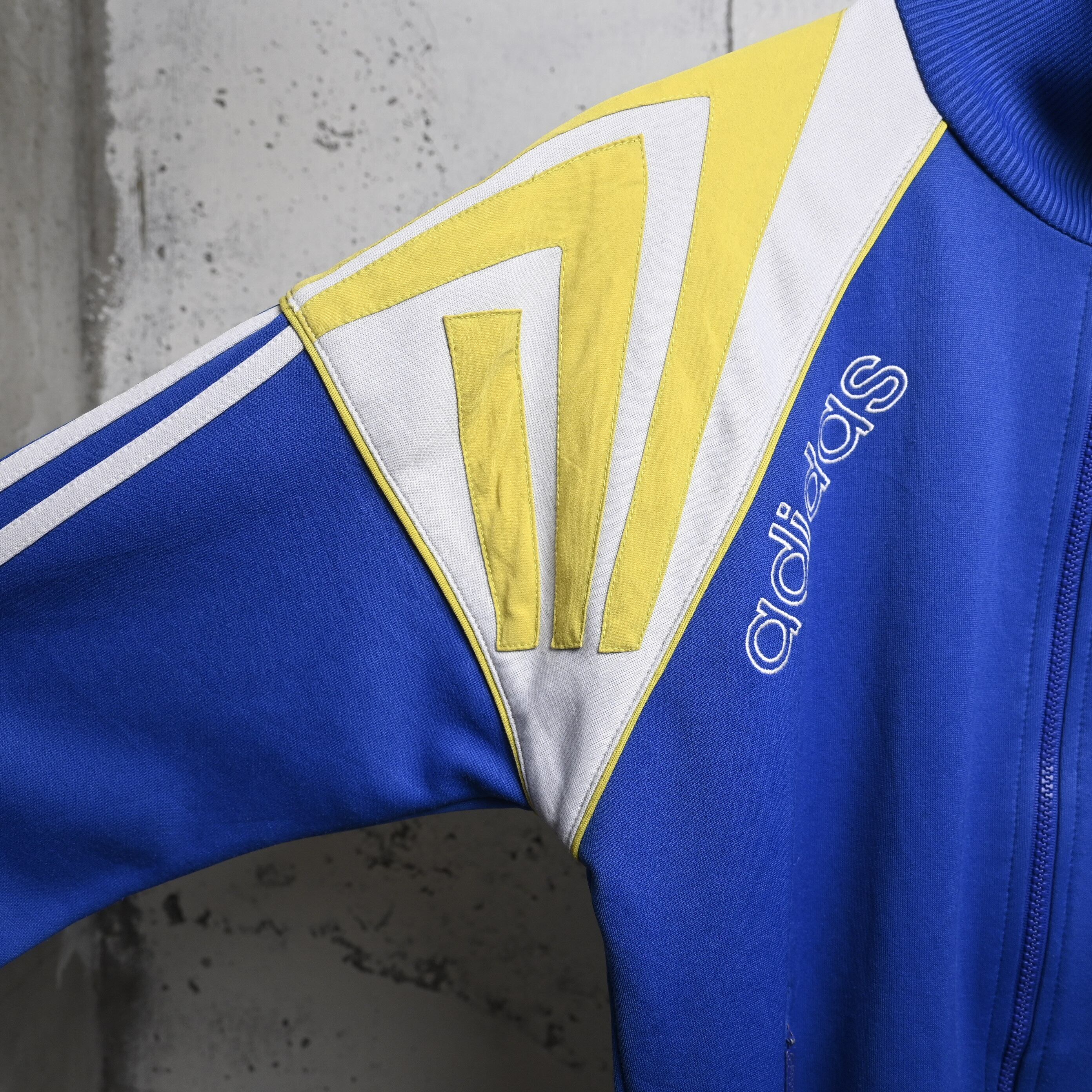 80年代〜90年代のadidasは、ATP以降も各国のスポーツクラブやローカルチーム向けに多彩なデザインのトラックジャケットを展開しており、競技用ユニフォームに近いカラーリングや独特な切替パターンが魅力です。こちらも肩まわりに特徴的なパネル切替が入り、単なる定番ジャージとは異なる当時の競技ウェアらしい存在感があります。