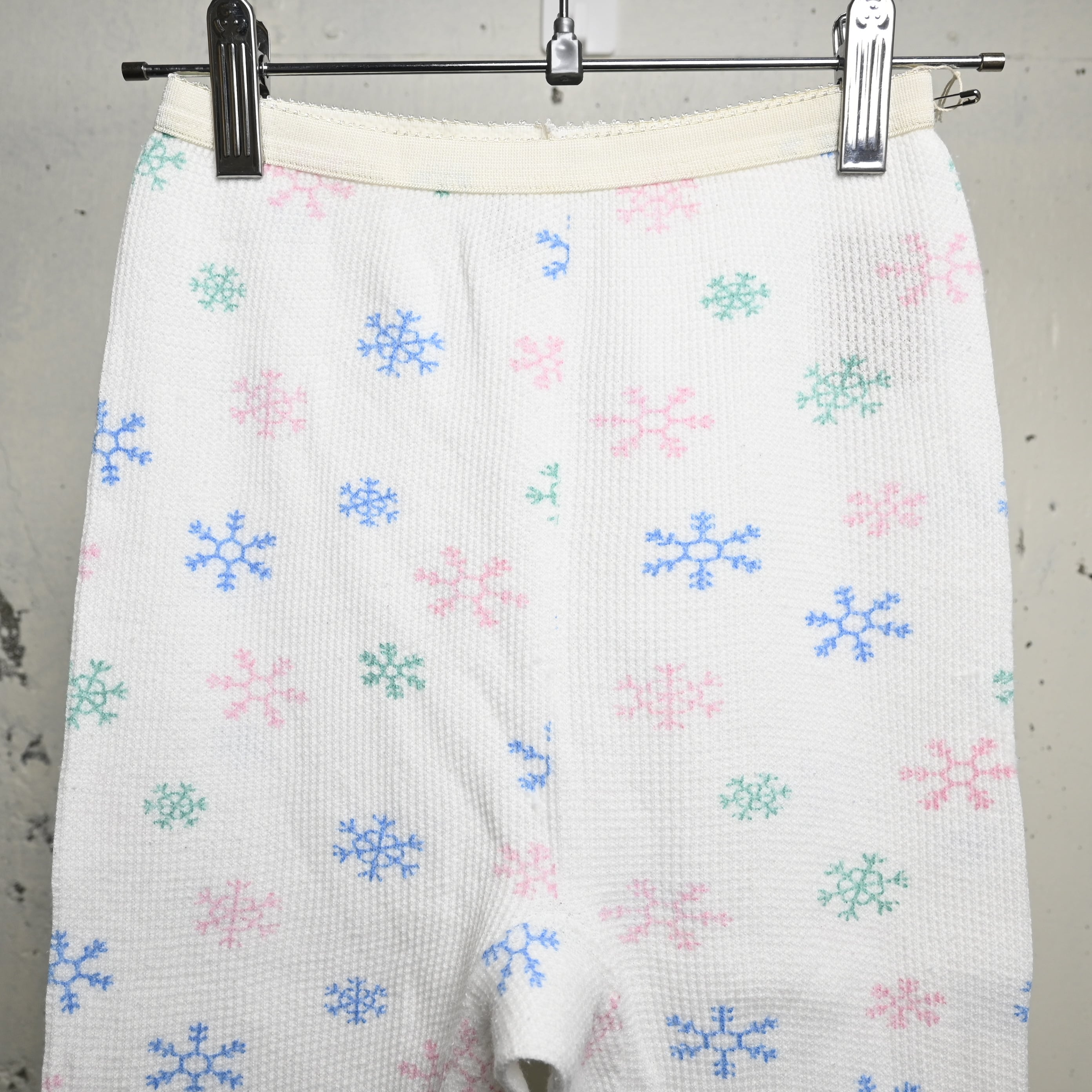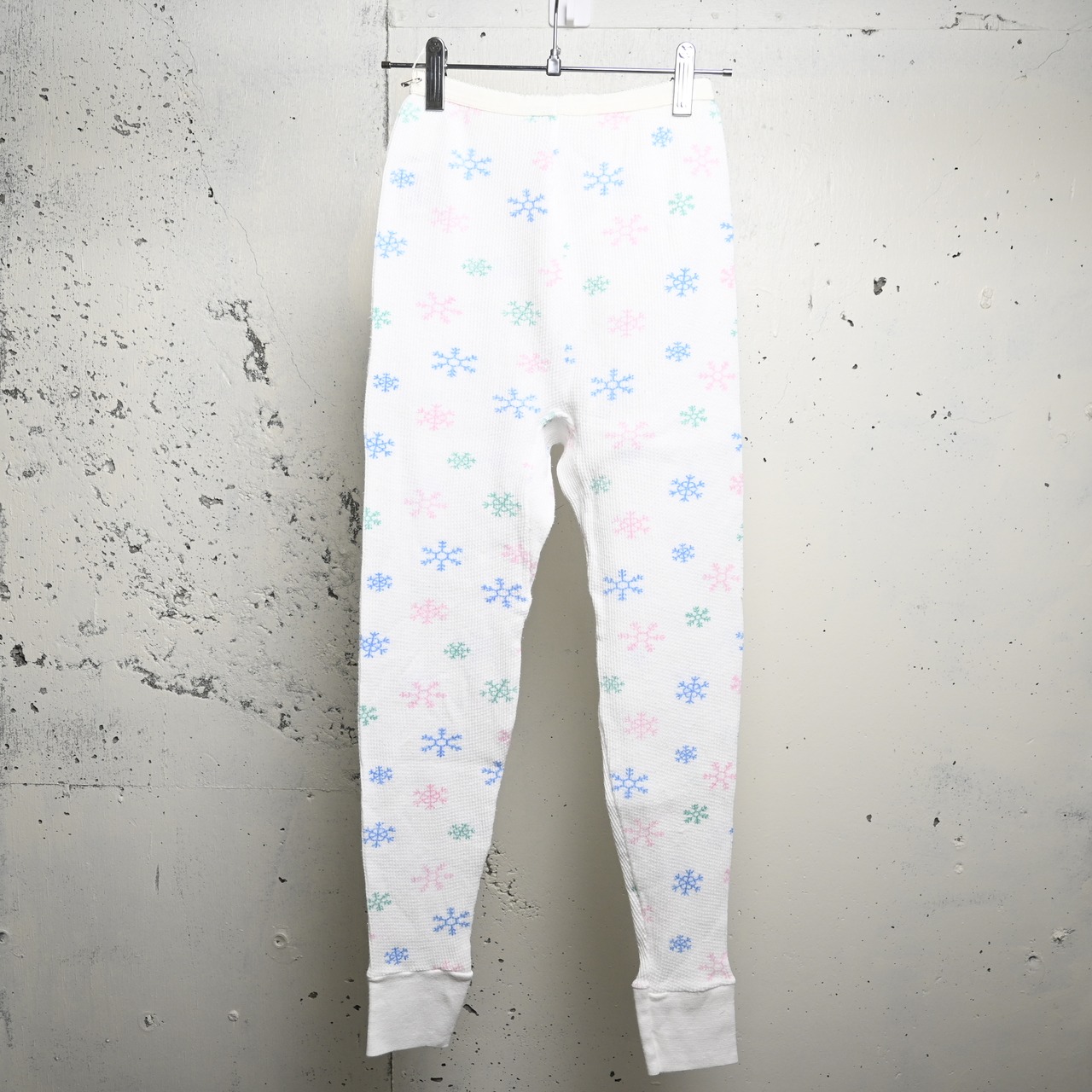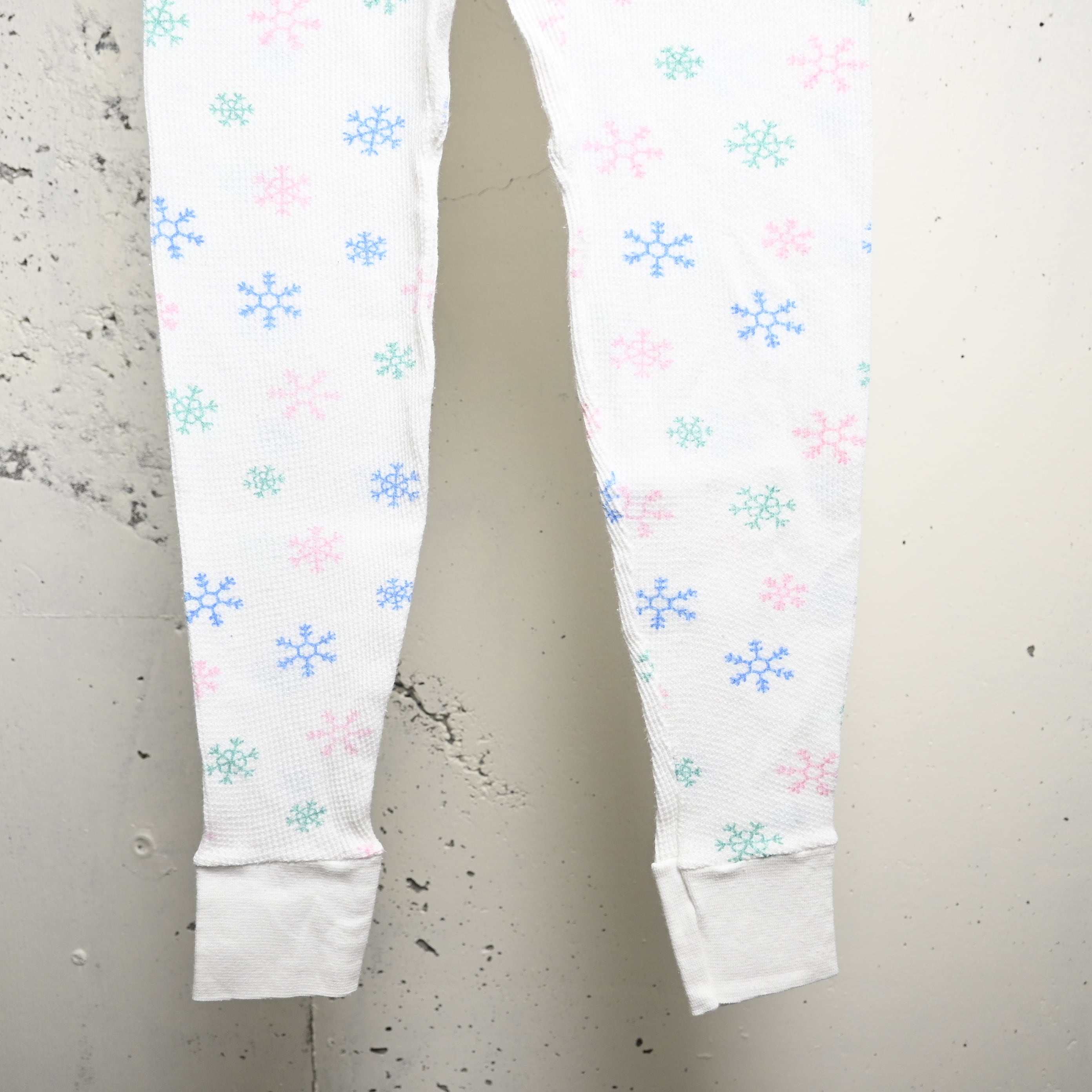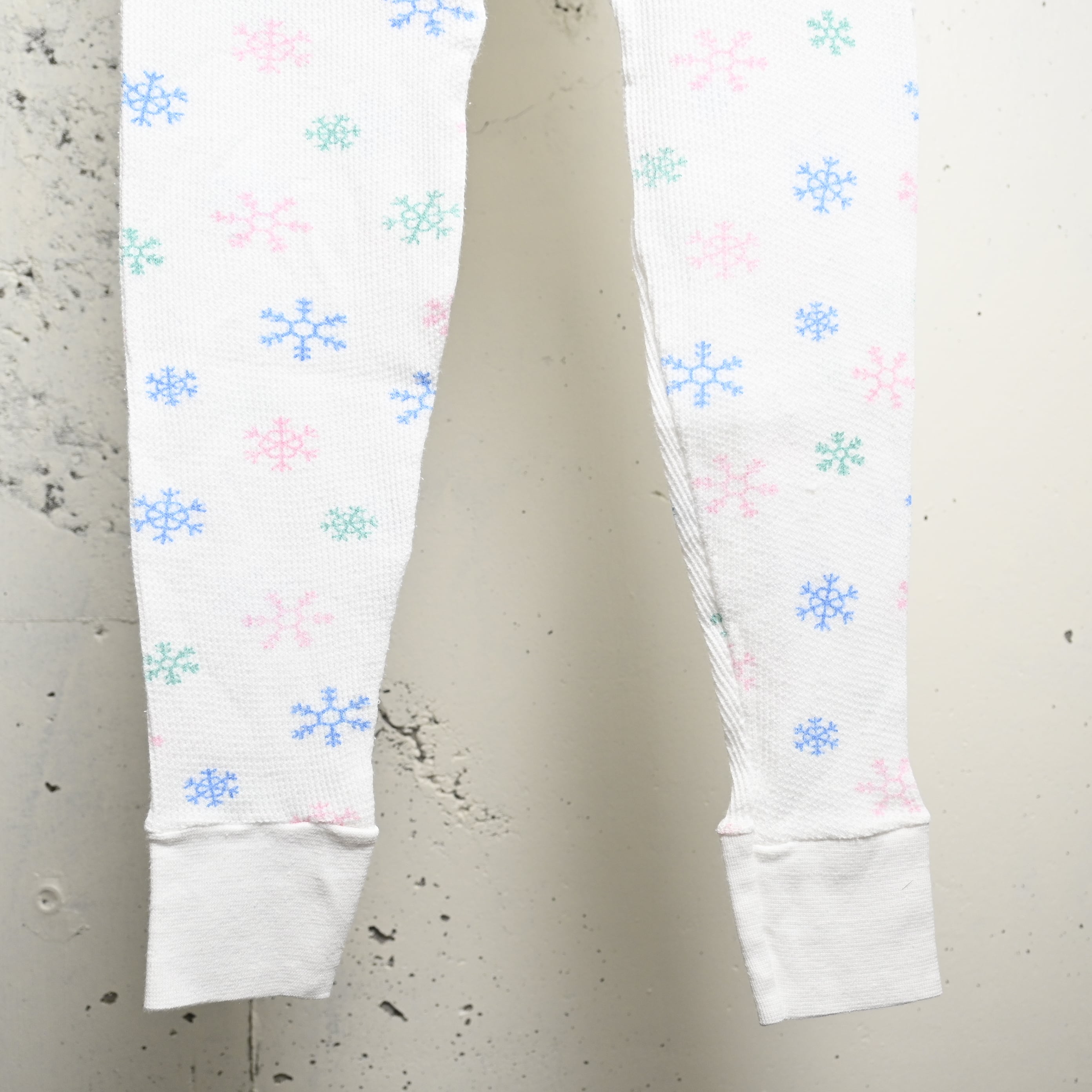 ホワイトのワッフルボディに、ブルー・ピンク・ミントグリーンの淡いスノーフレーク柄が散りばめられたUSA製サーマルパンツです。