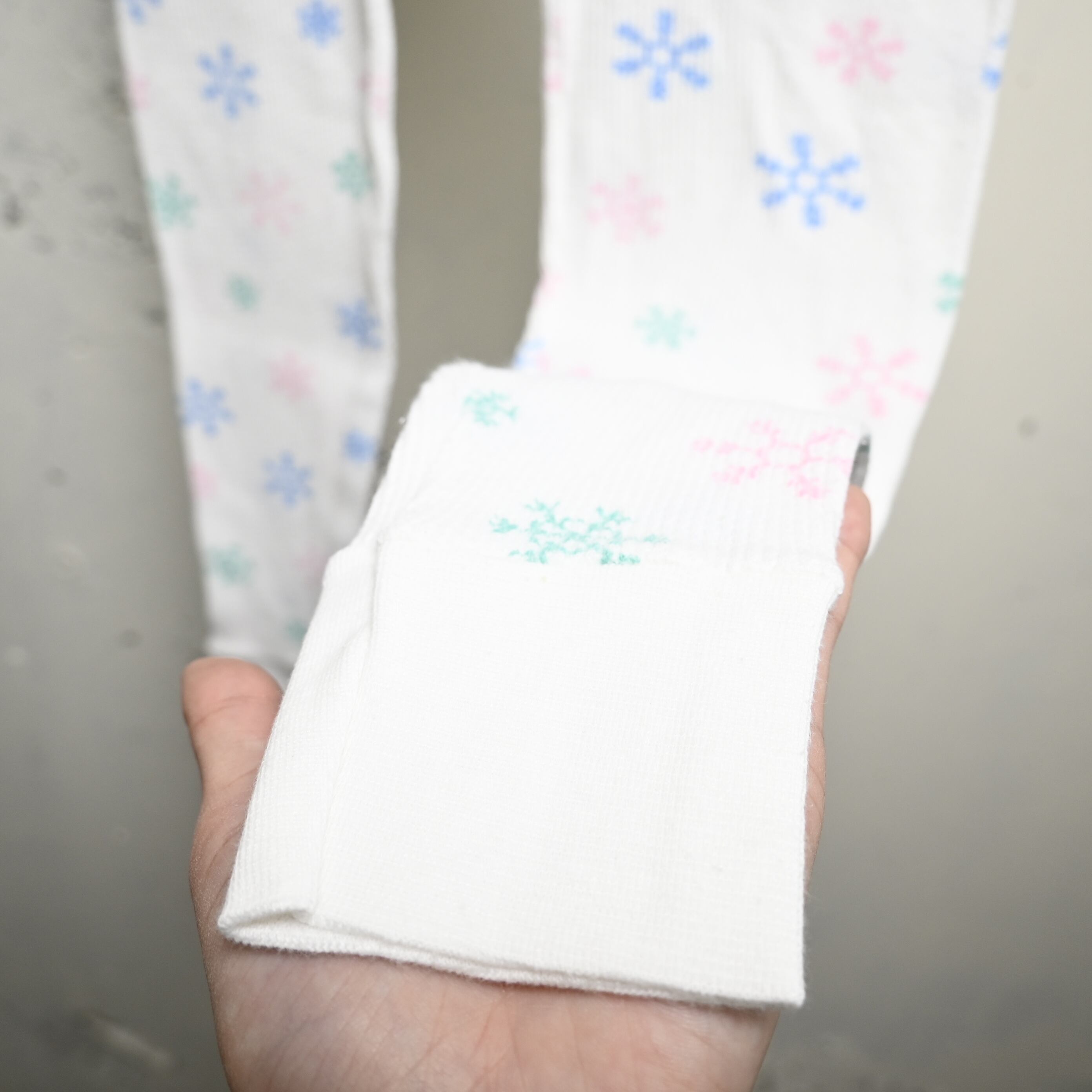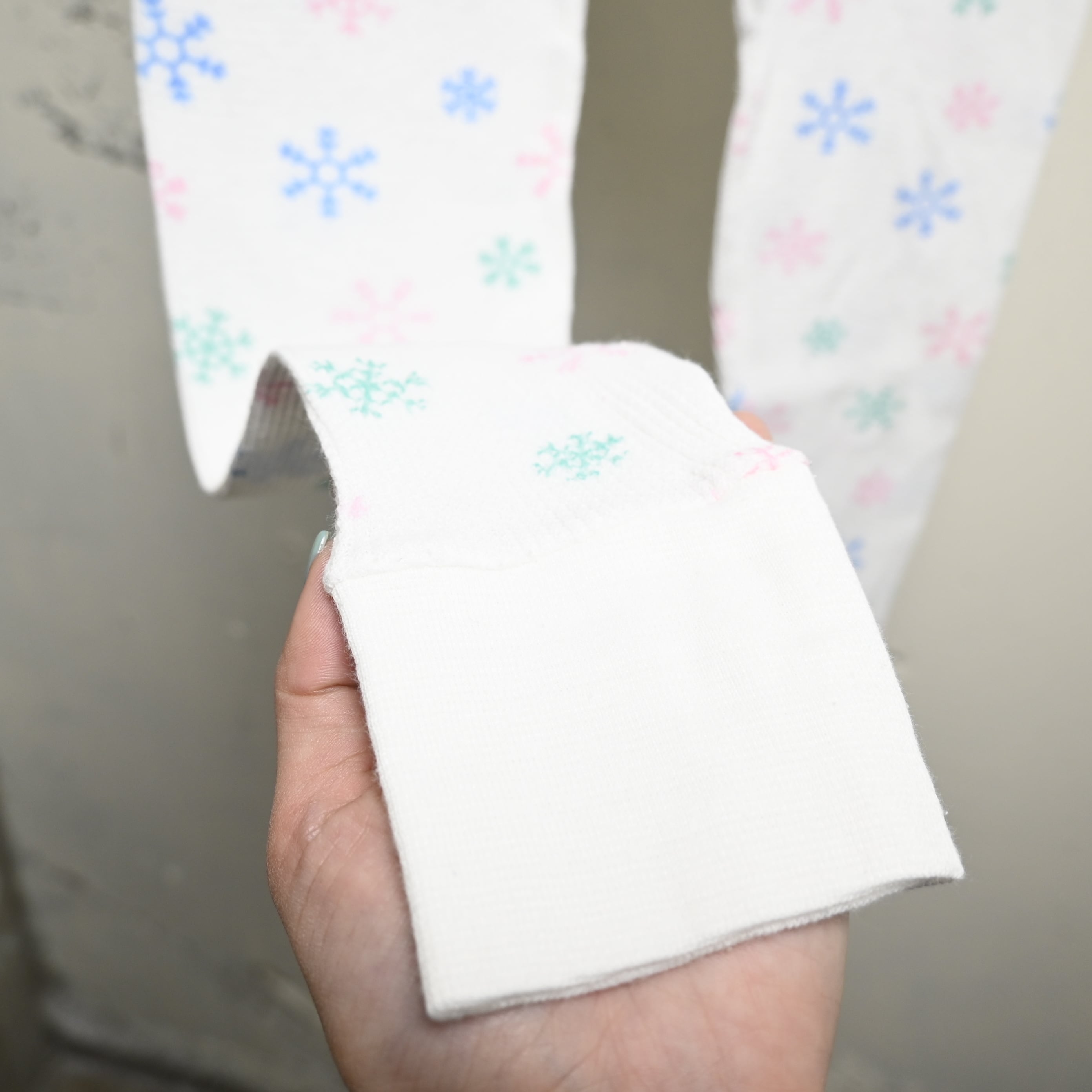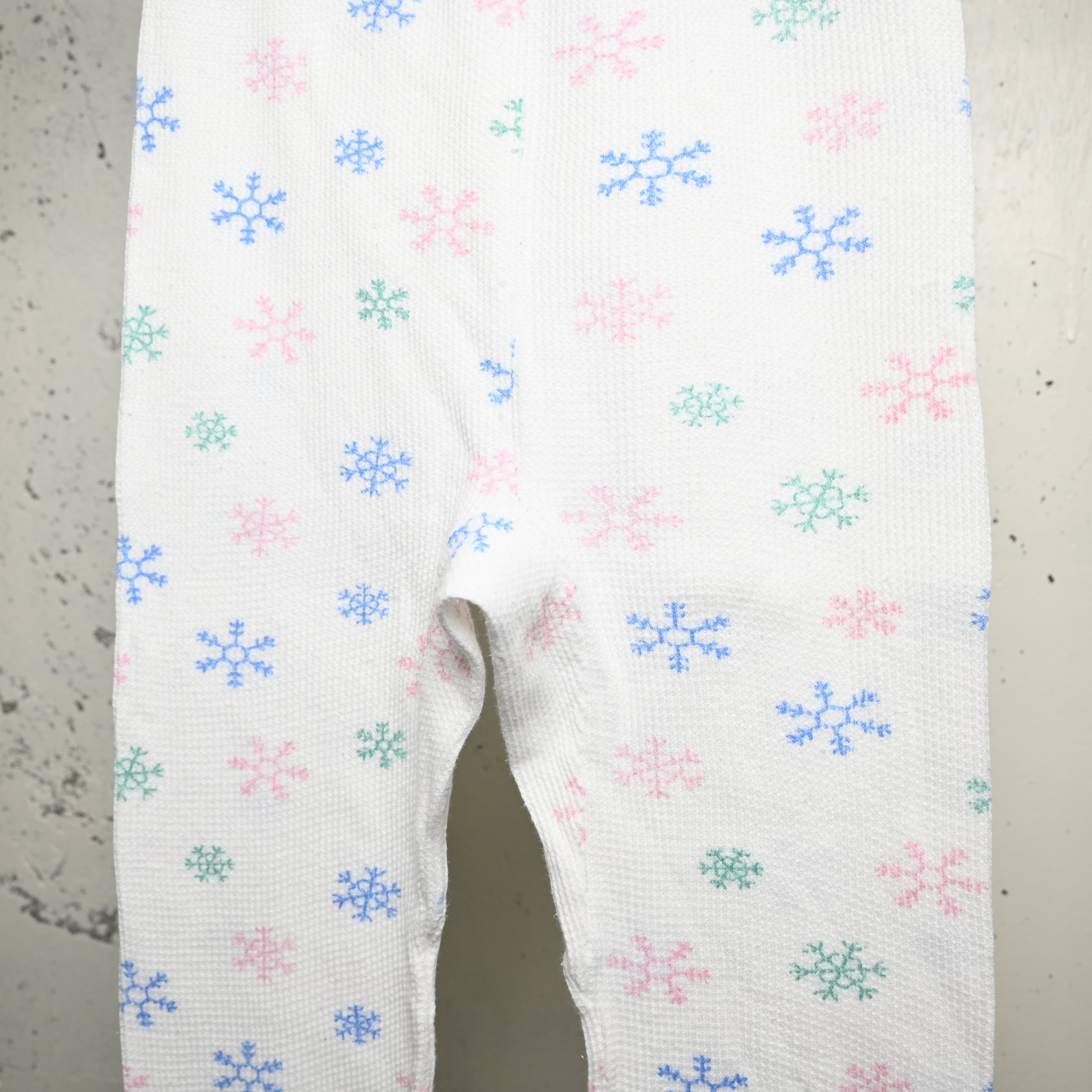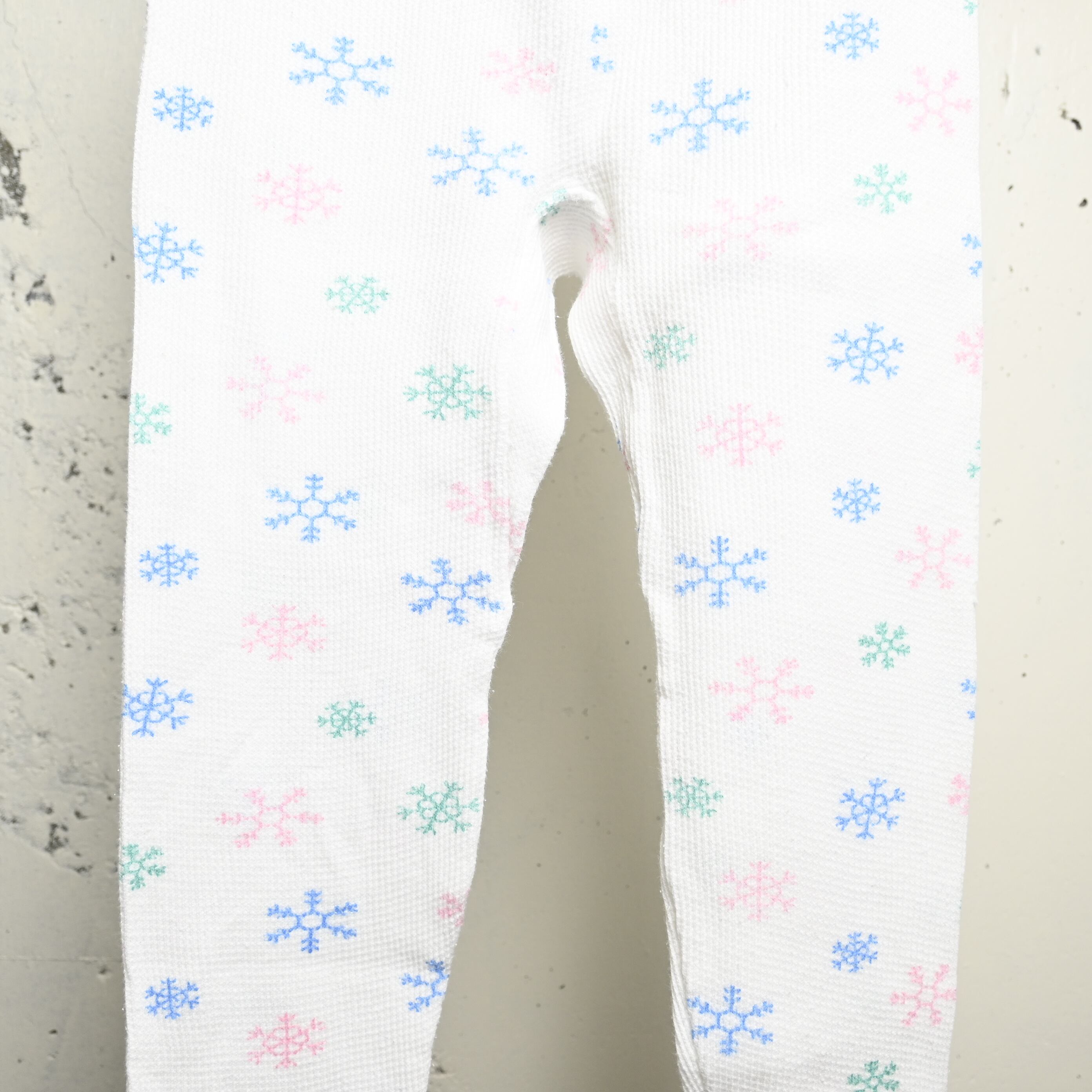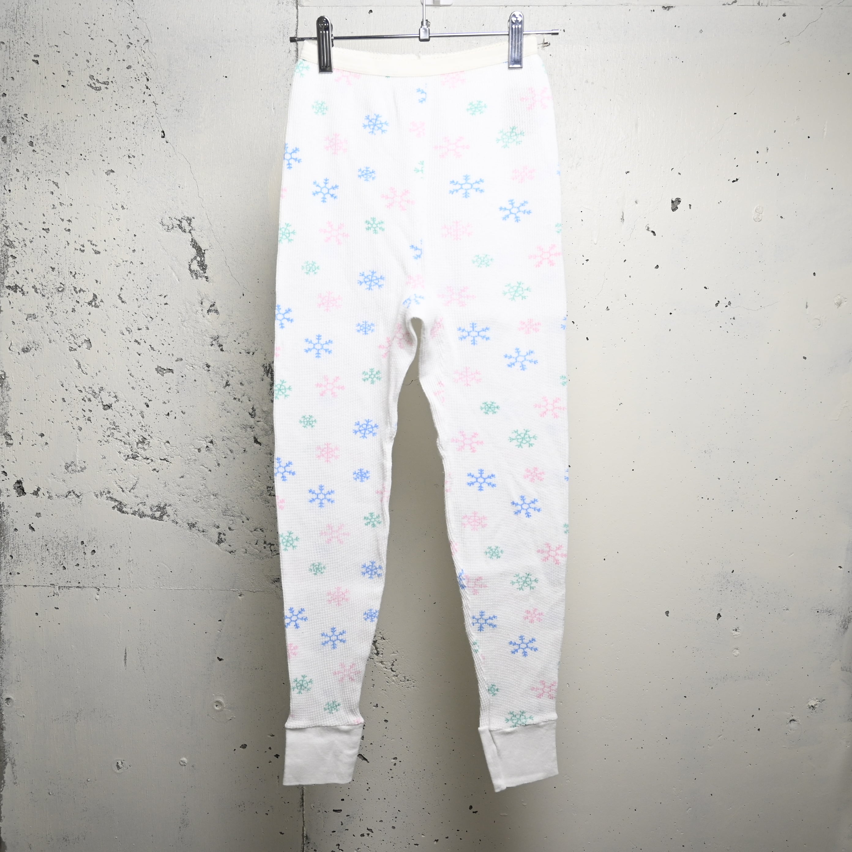 ホワイトのワッフルボディに、ブルー・ピンク・ミントグリーンの淡いスノーフレーク柄が散りばめられたUSA製サーマルパンツです。