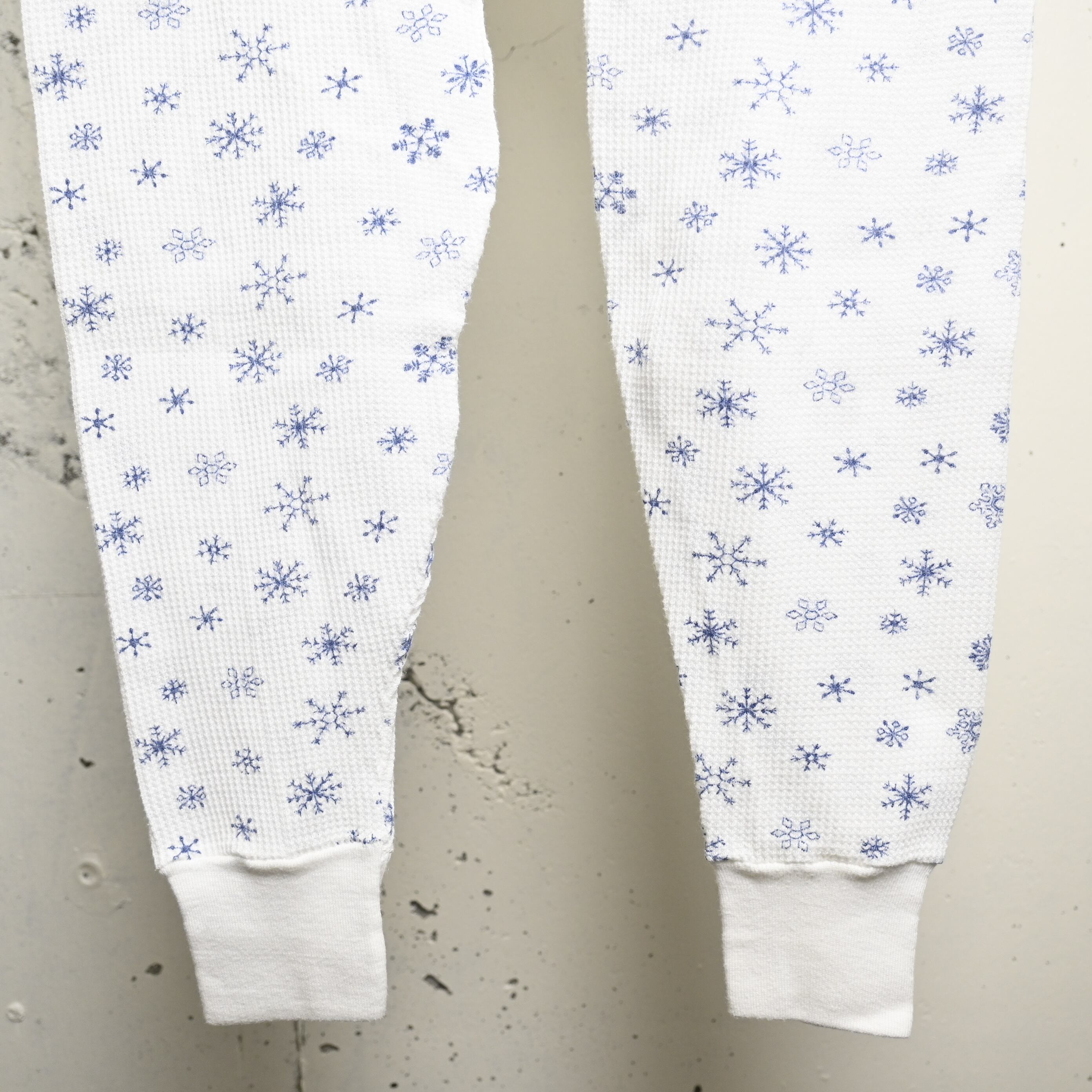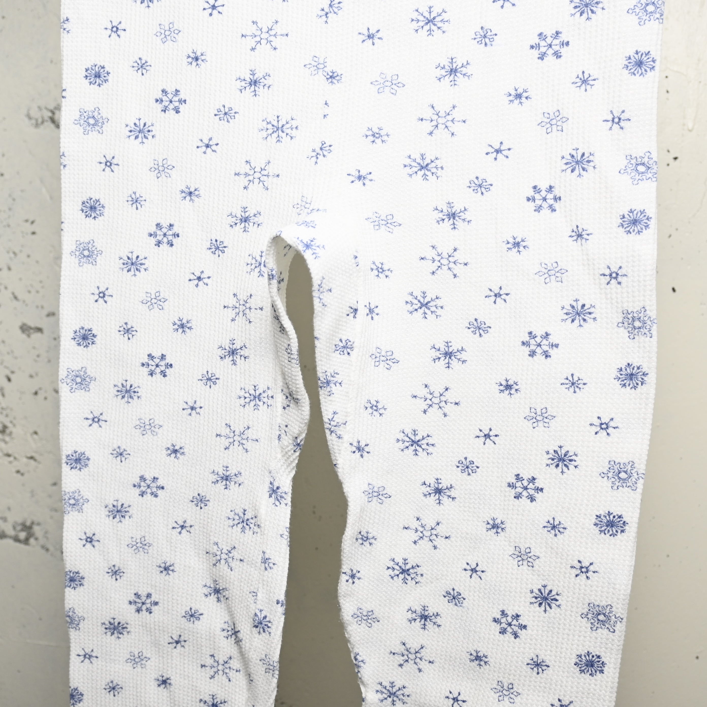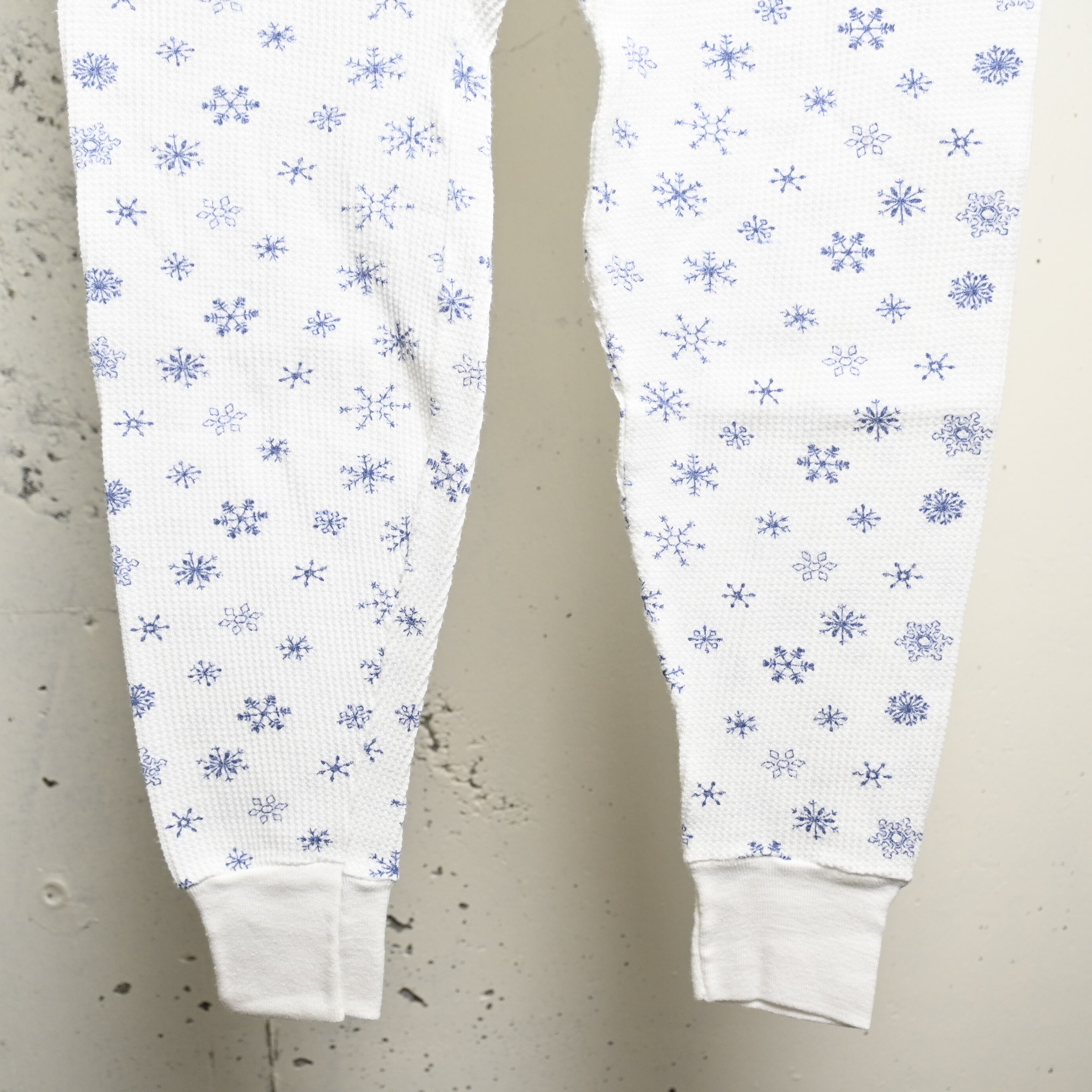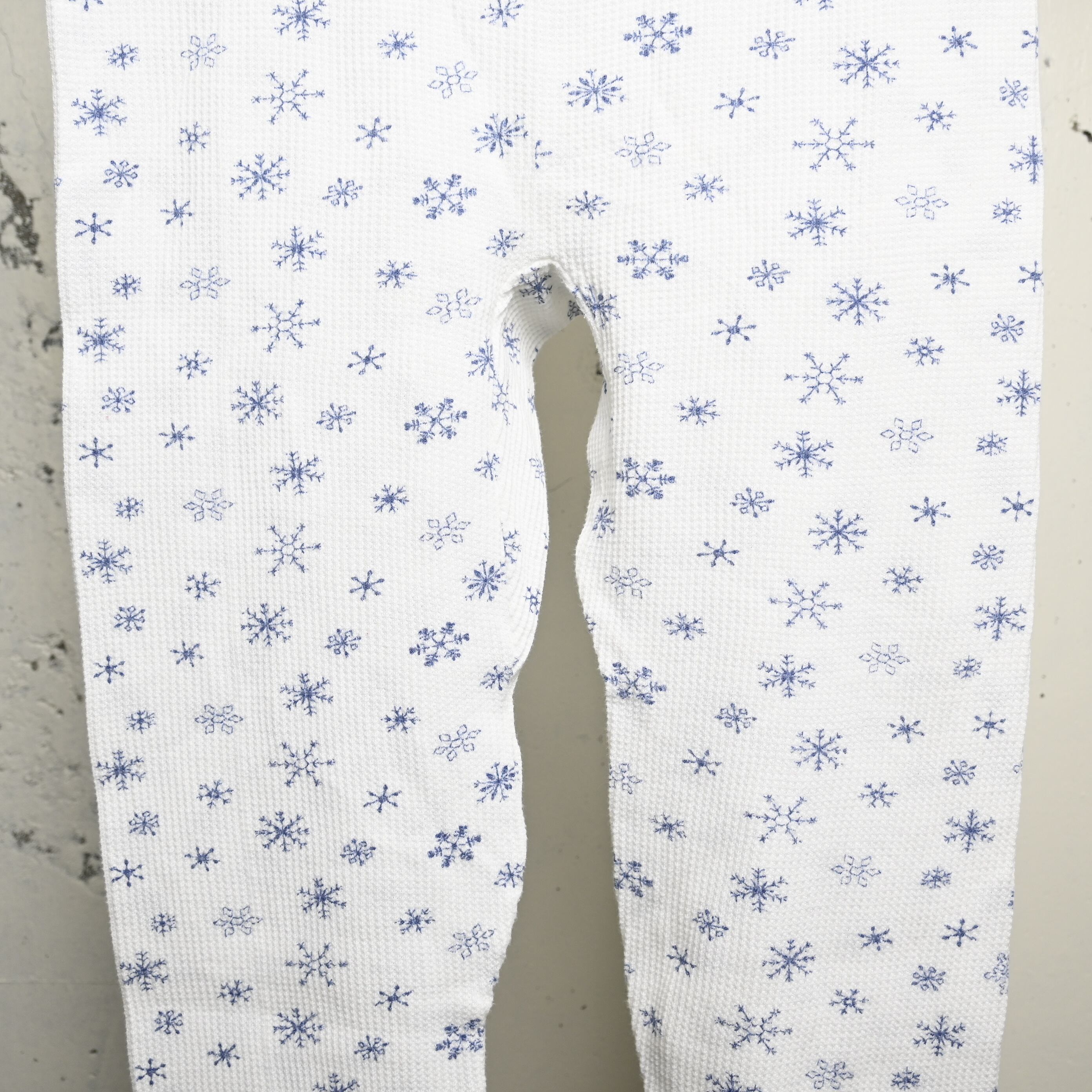 ホワイトのワッフルボディに、ネイビー寄りのブルーで細かな雪柄が全体にプリントされた、80〜90年代頃のUSA製サーマルパンツです。