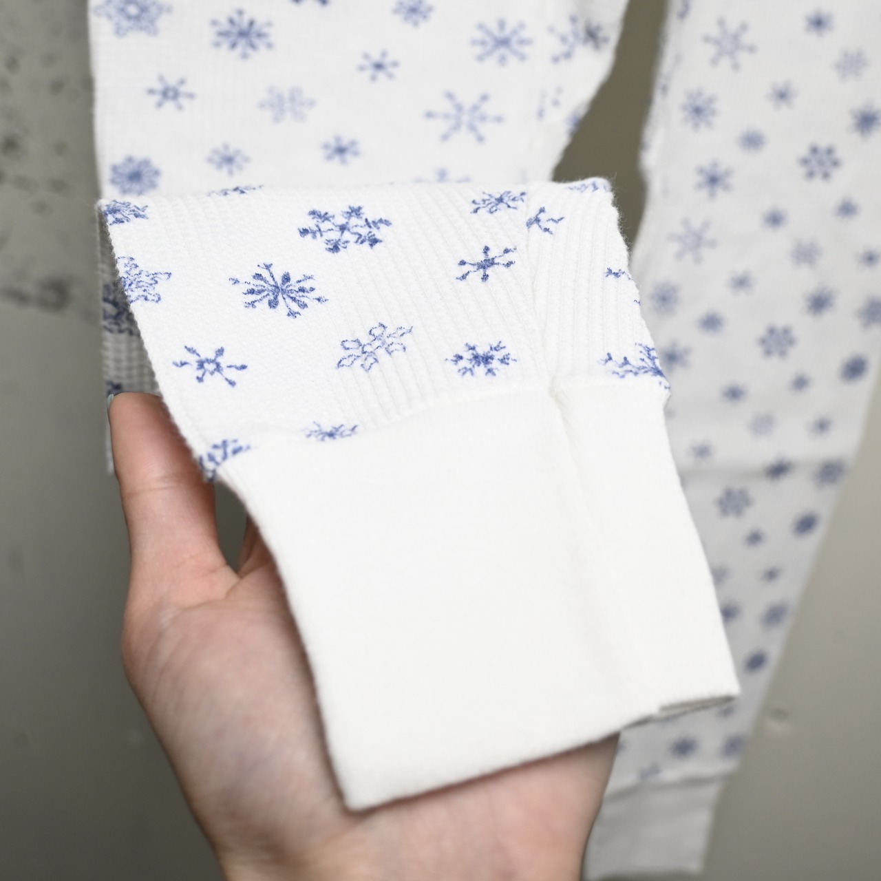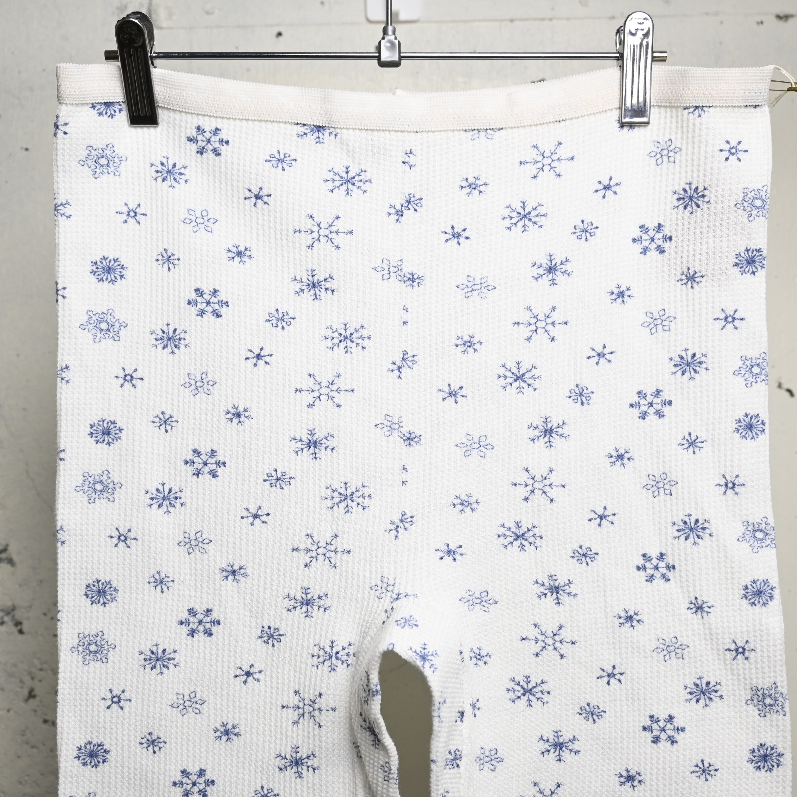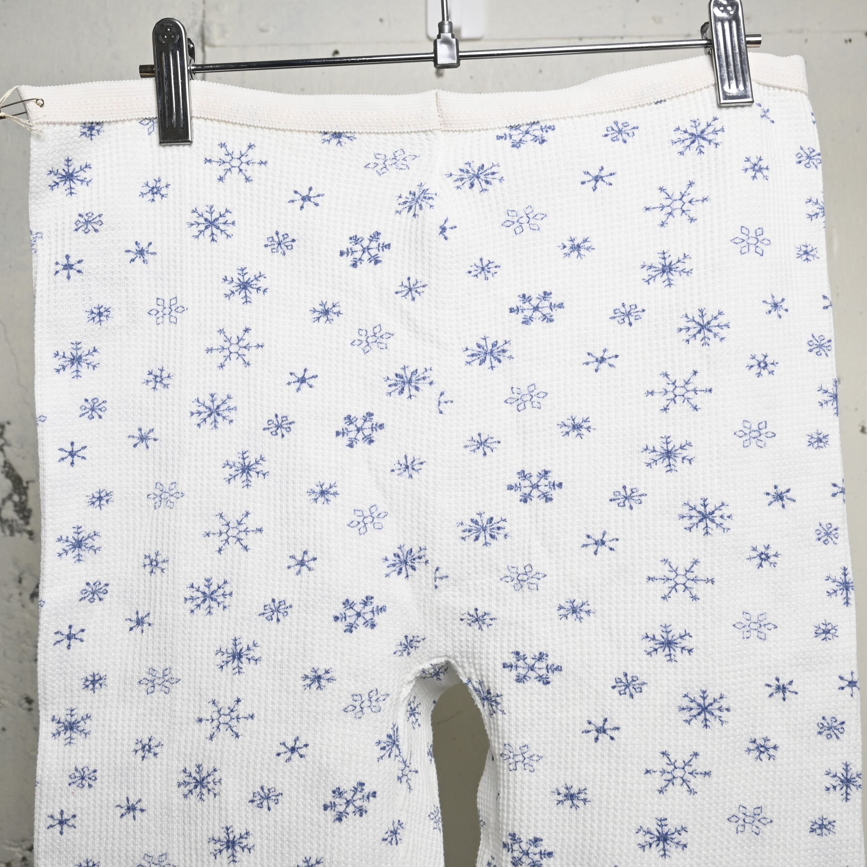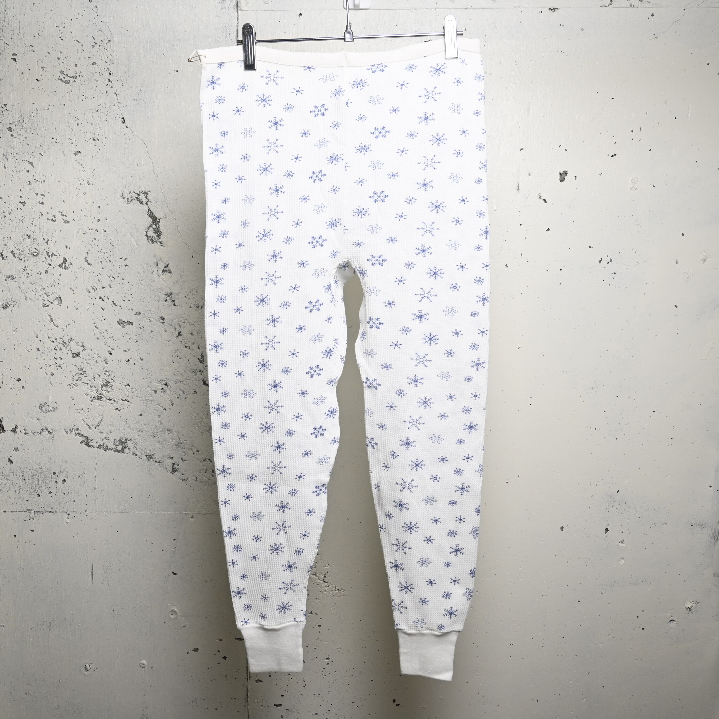 ホワイトのワッフルボディに、ネイビー寄りのブルーで細かな雪柄が全体にプリントされた、80〜90年代頃のUSA製サーマルパンツです。