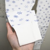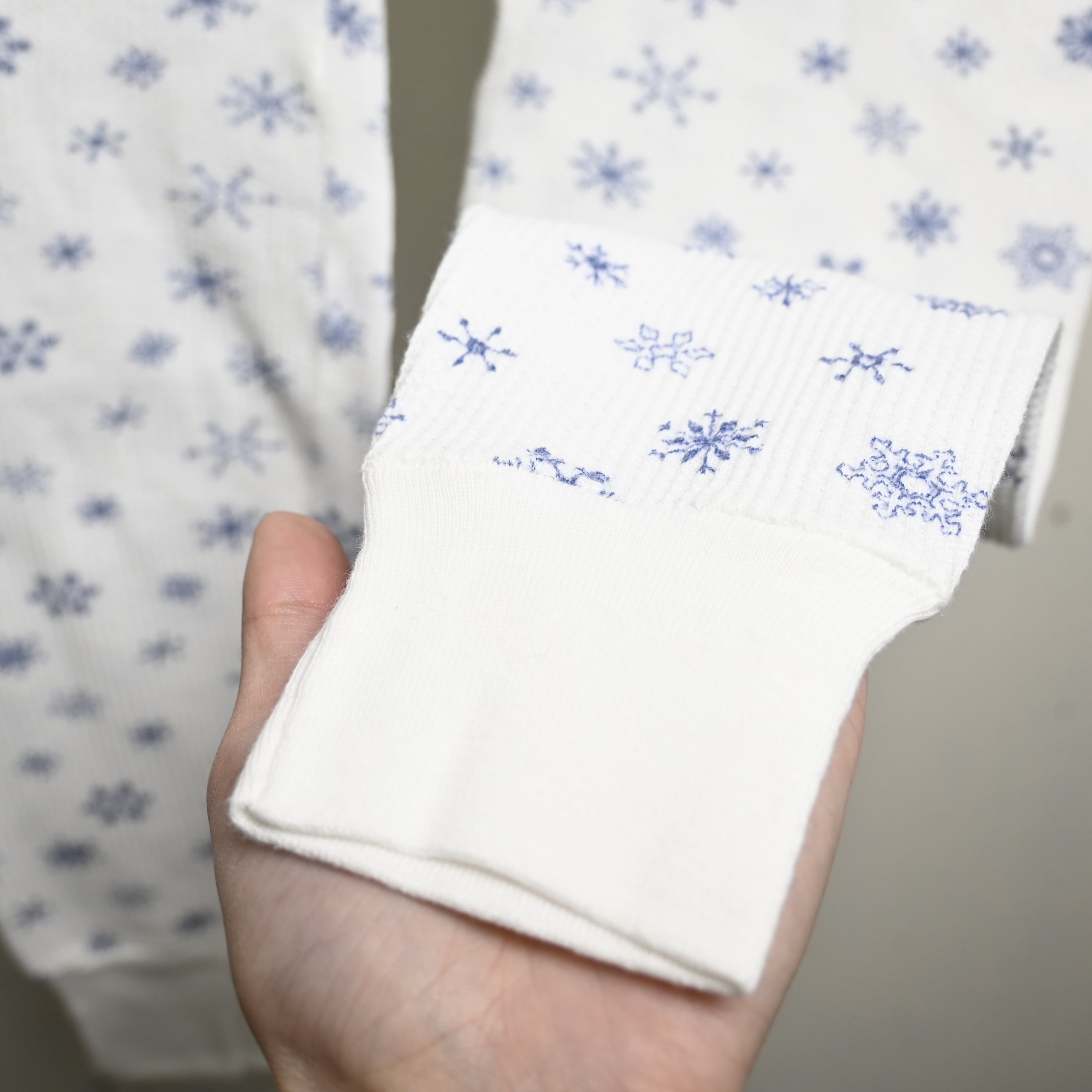 雪柄は大小異なるスノーフレークがバランスよく配置され、白ベースに映えるため一枚でも存在感があります。ルームウェアとしてはもちろん、ロング丈トップスやワンピースとのレイヤードにも取り入れやすく、季節感のあるアクセントとしても使えます。