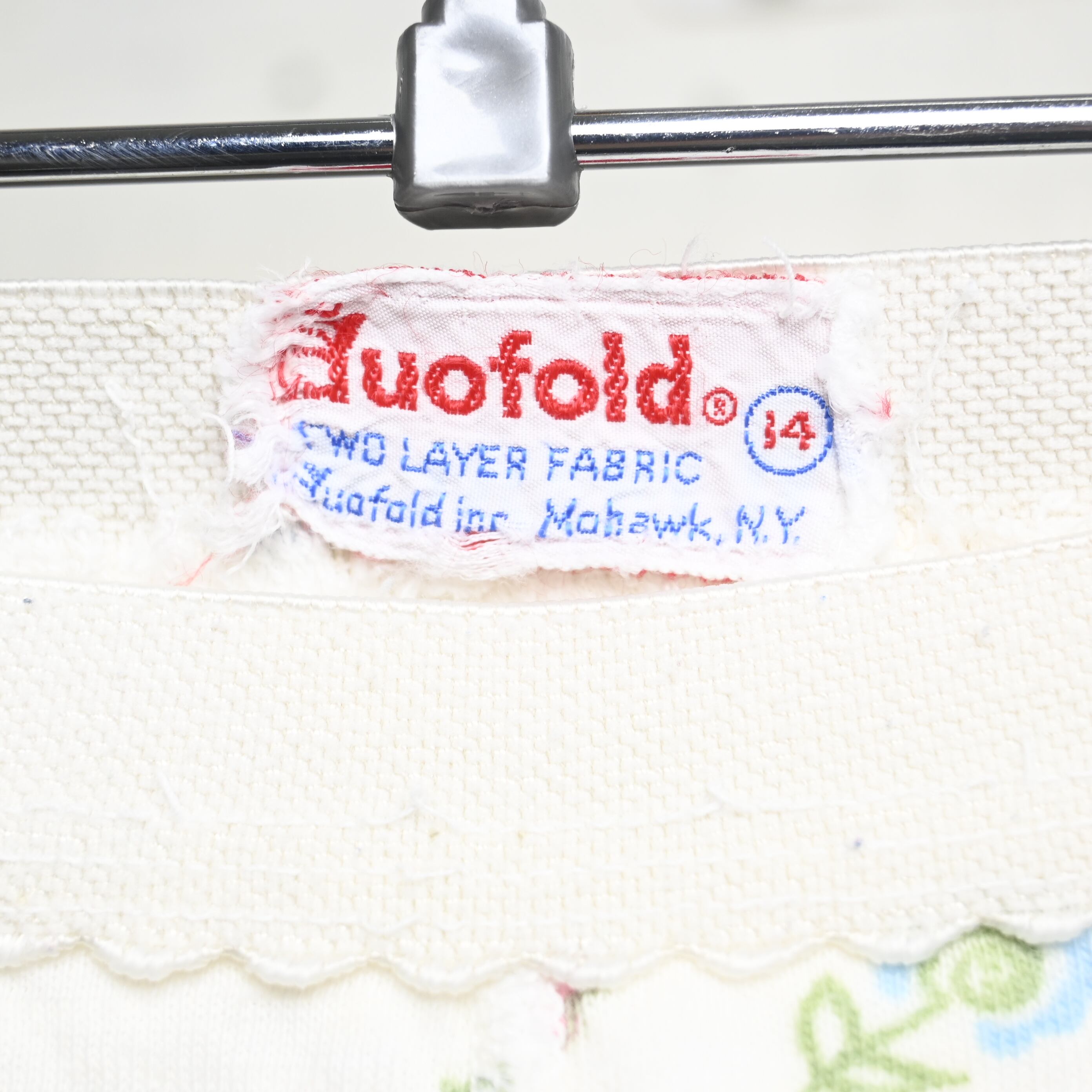Duofoldは1898年創業のアメリカを代表するアンダーウェアブランドで、二重構造の保温素材「Two Layer Fabric」を用いたサーマル製品で広く知られています。アウトドアやウィンタースポーツ向けの機能性インナーとして長く支持されてきたブランドですが、当時はこうした柔らかな総柄デザインも展開しており、実用品の中にアメリカらしい日常的な可愛らしさが感じられます。