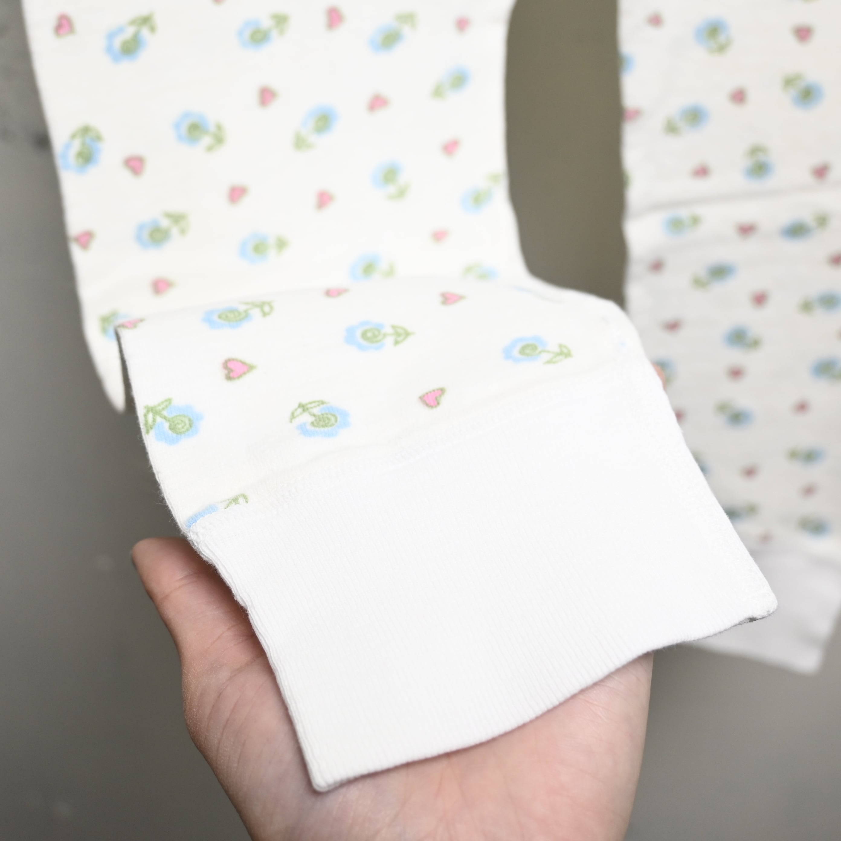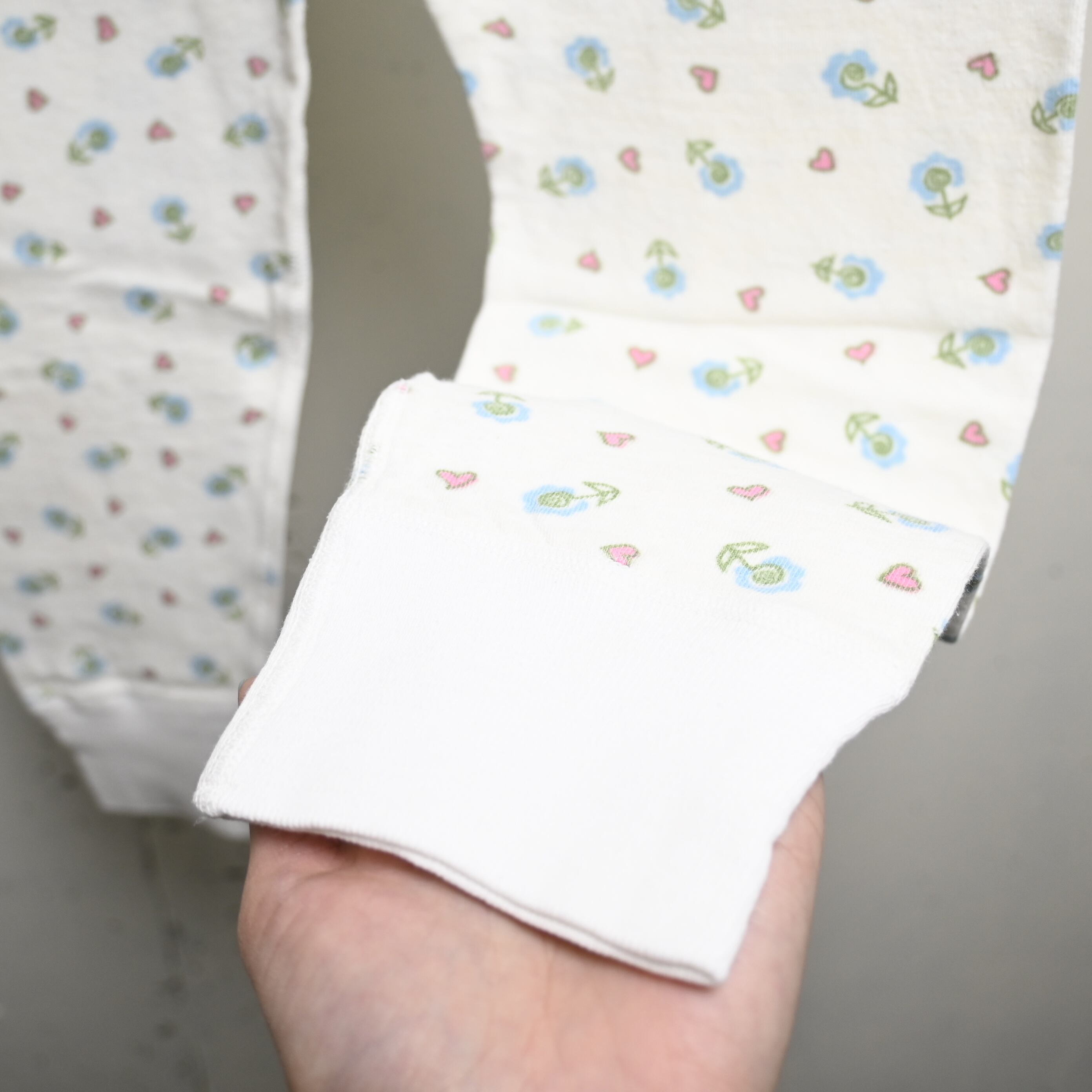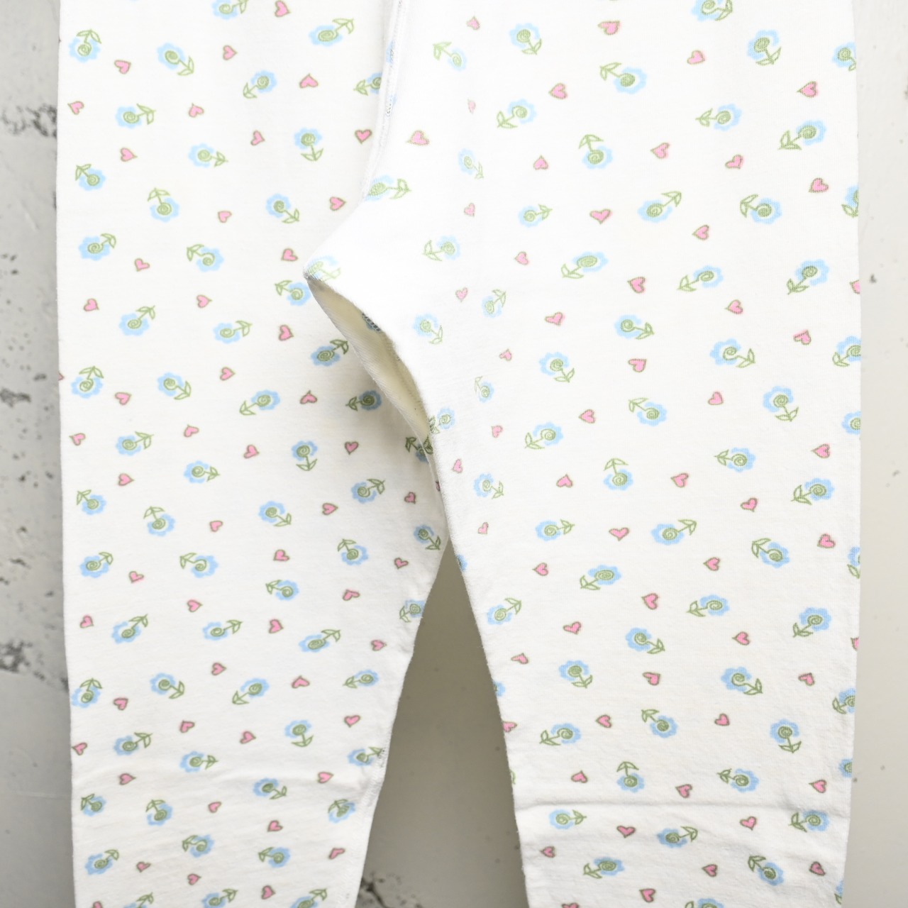 こちらはホワイトベースに淡いブルーの小花とピンクのハートが細かく散りばめられた総柄仕様。主張は控えめながら柄のバランスが良く、ヴィンテージらしい柔らかな配色が魅力です。