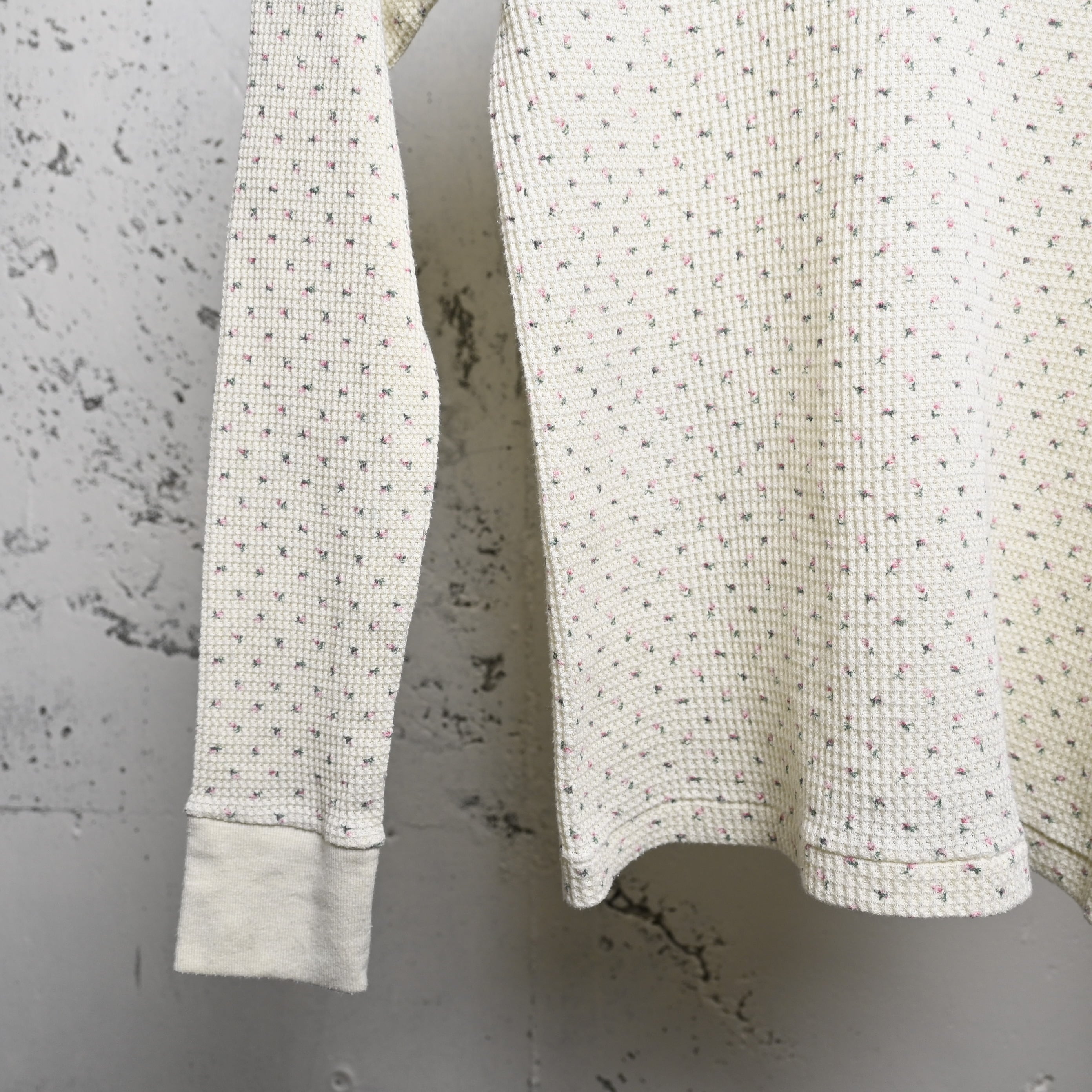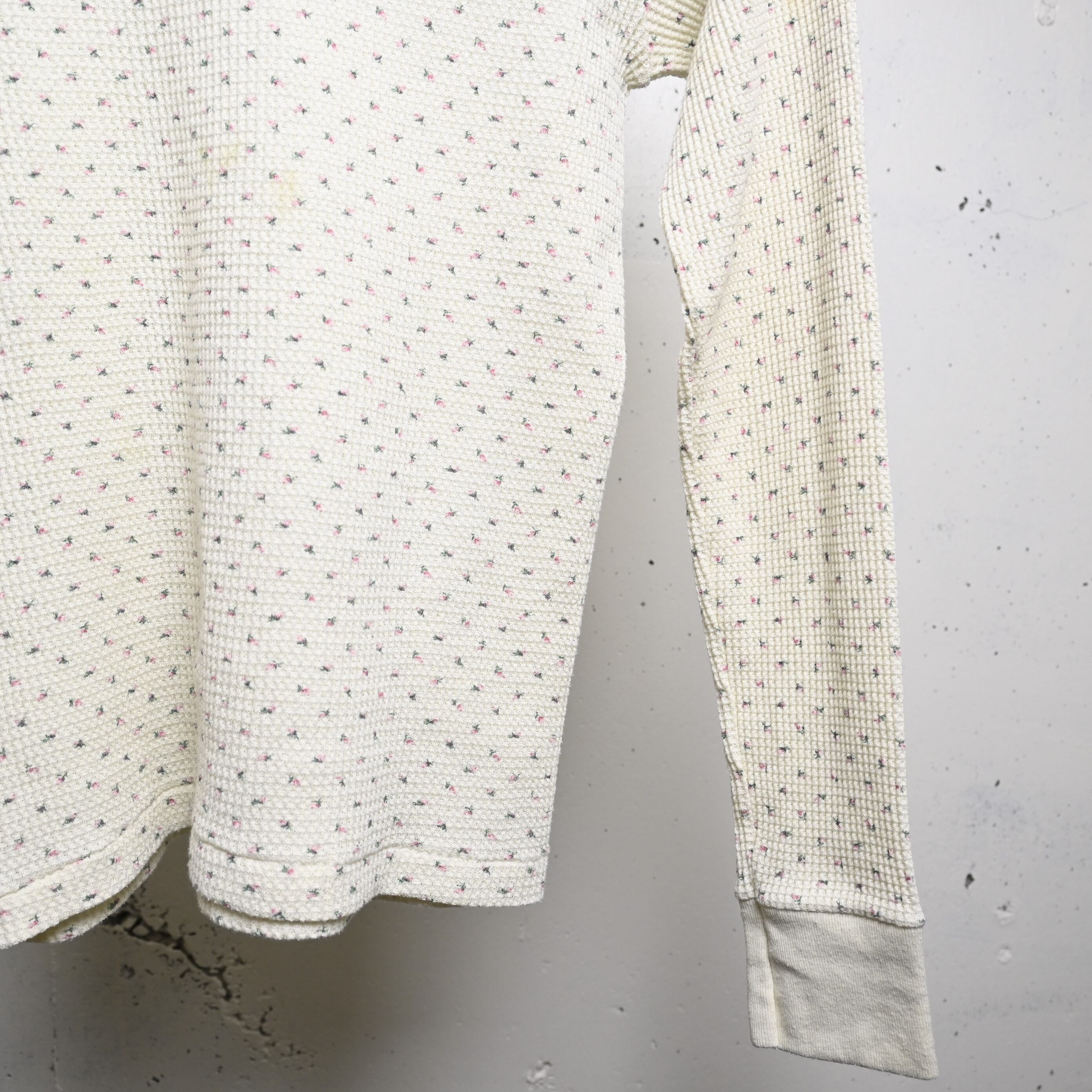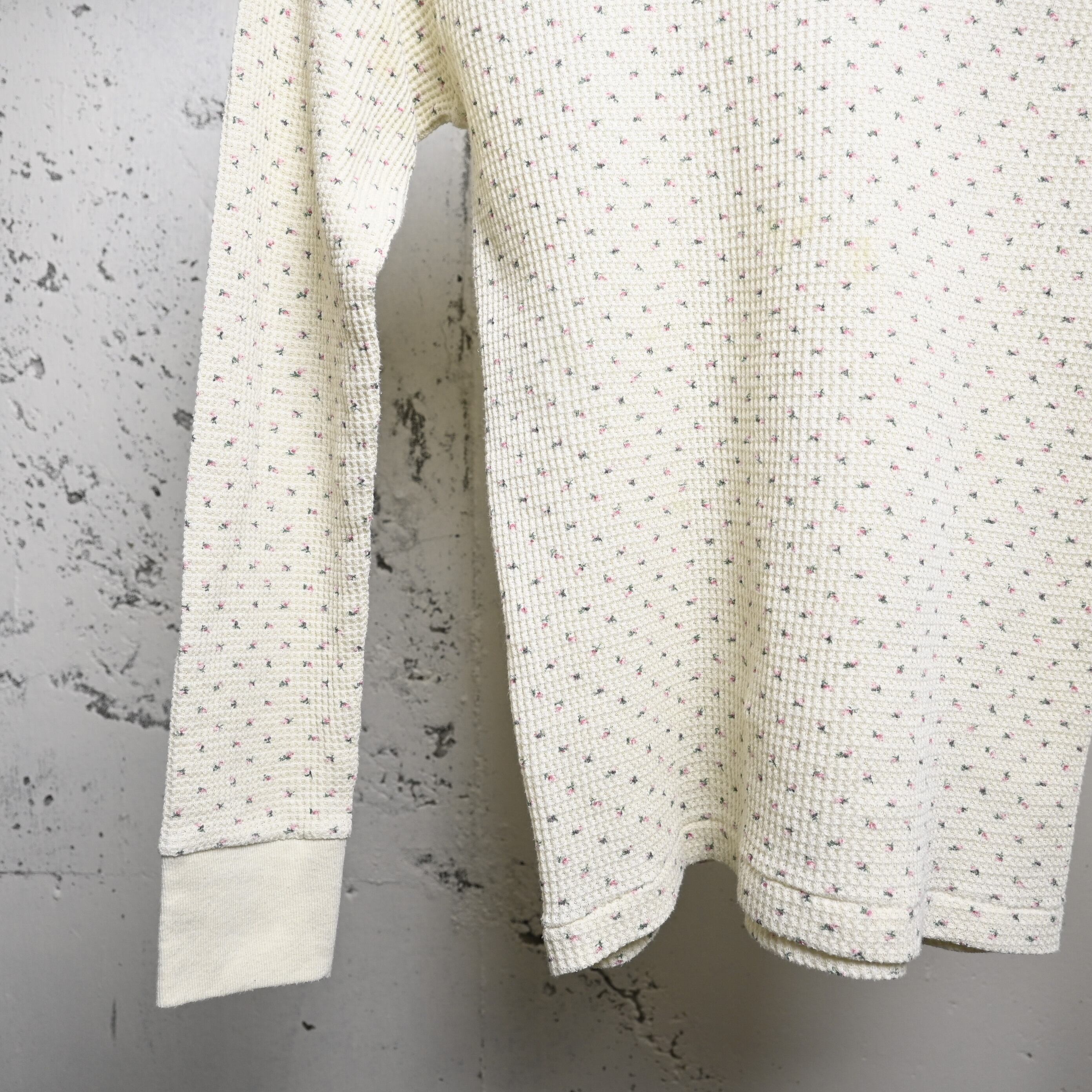 小花柄サーマルや総柄ワッフルは80〜90年代アメリカ製で多く見られたカテゴリーですが、このような細かい総柄でクリームベースの個体は柔らかい印象が強く、デニムやミリタリーパンツ、スラックスまで幅広く合わせやすい一着です。インナーとして首元や袖から柄を見せても雰囲気よくまとまります。
