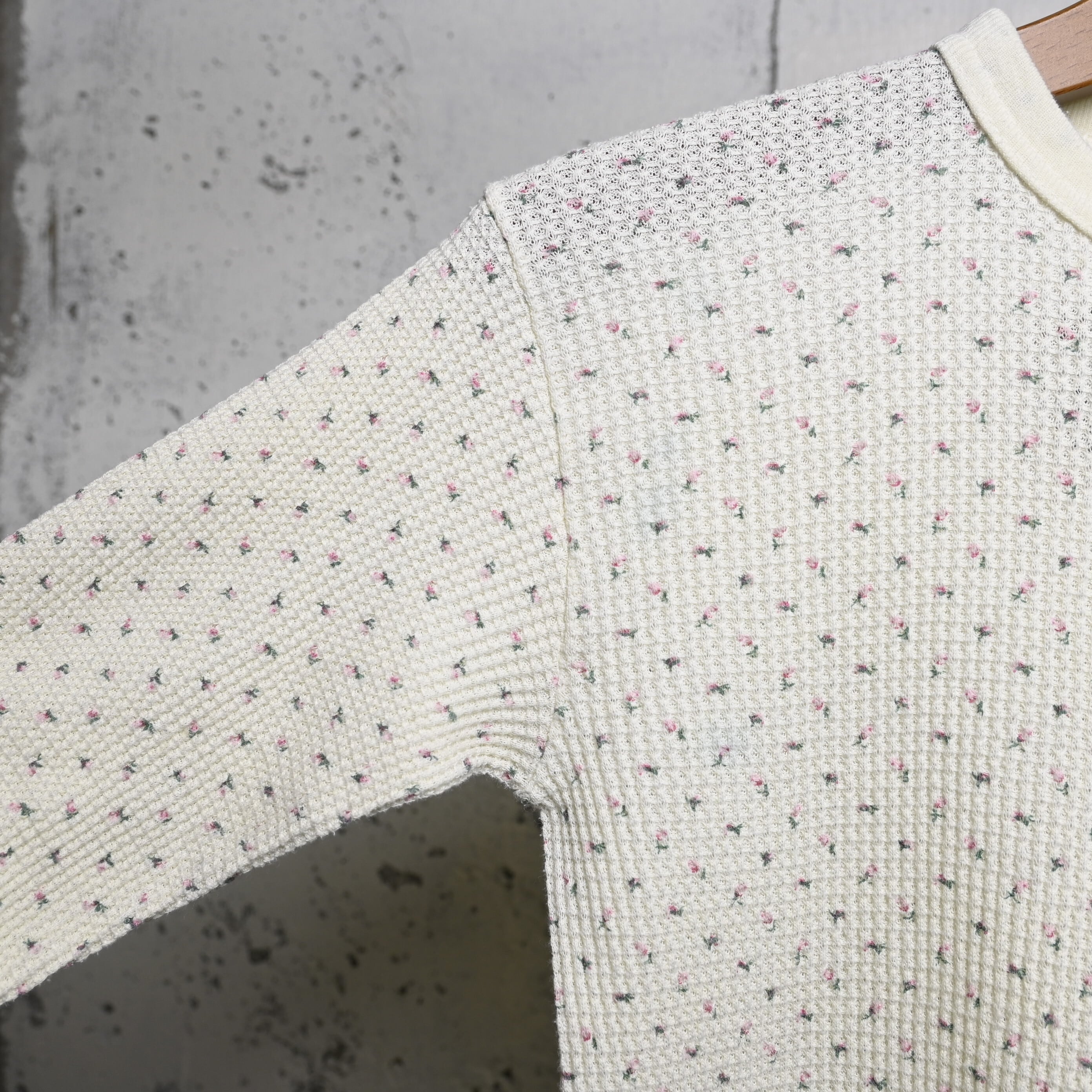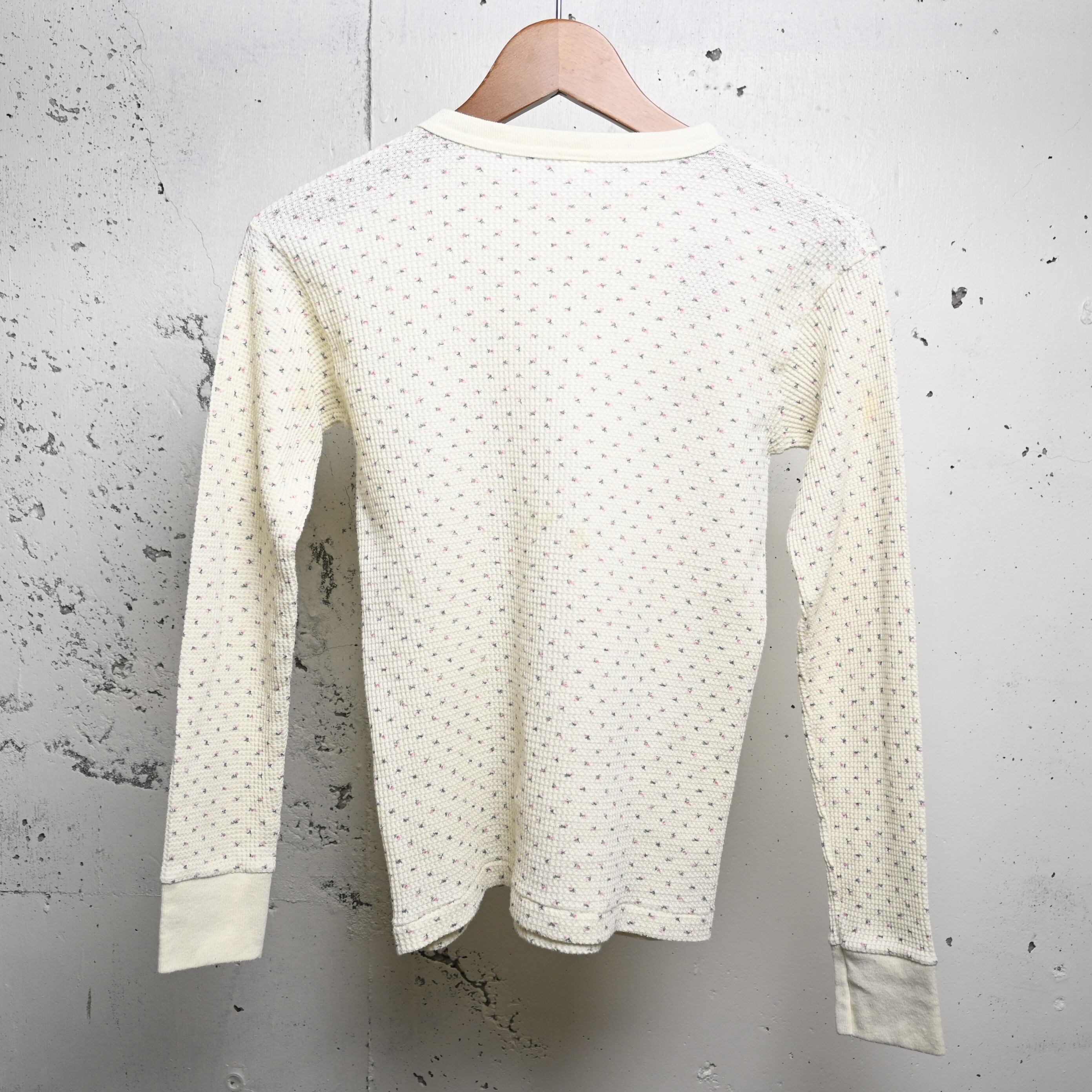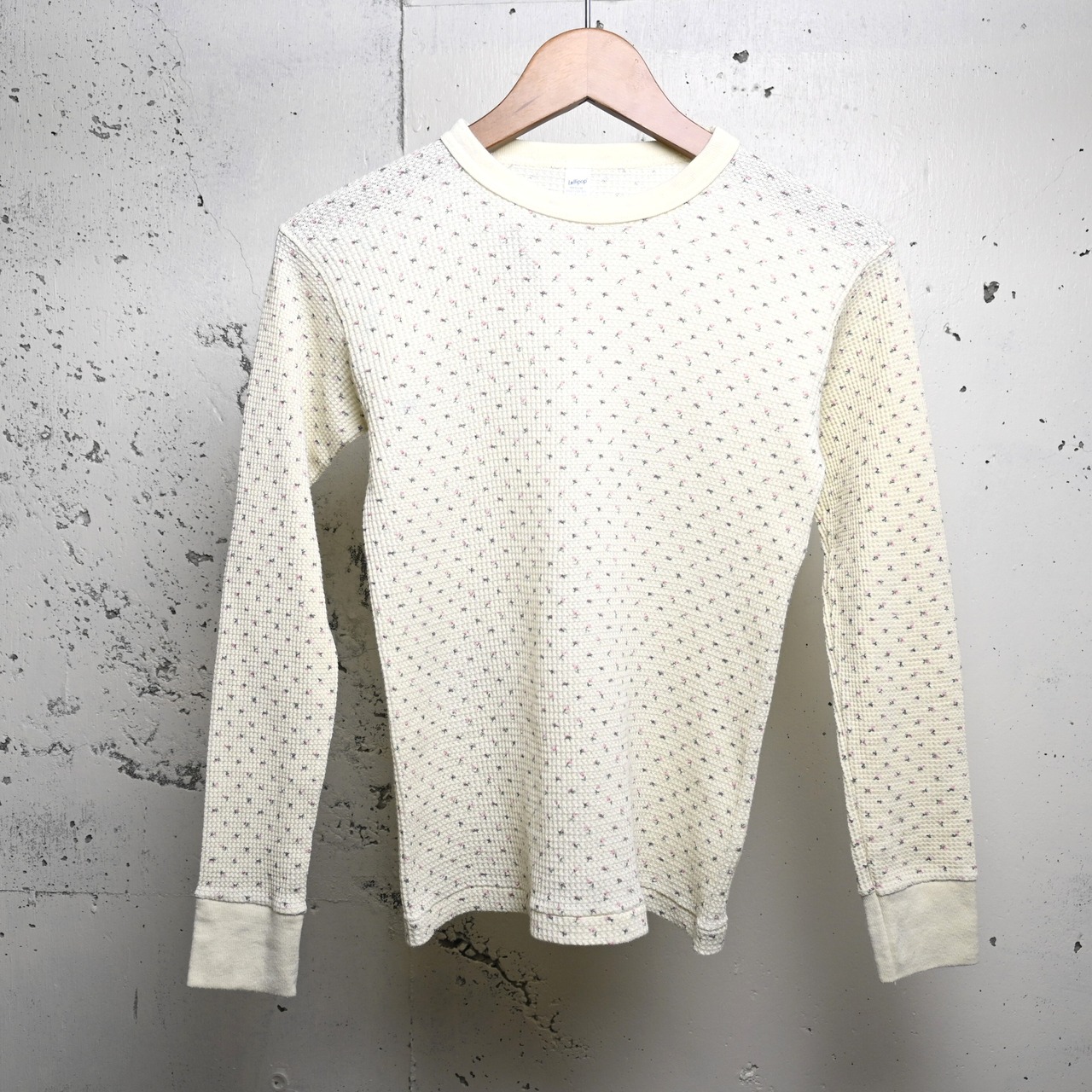 小花柄サーマルや総柄ワッフルは80〜90年代アメリカ製で多く見られたカテゴリーですが、このような細かい総柄でクリームベースの個体は柔らかい印象が強く、デニムやミリタリーパンツ、スラックスまで幅広く合わせやすい一着です。インナーとして首元や袖から柄を見せても雰囲気よくまとまります。
