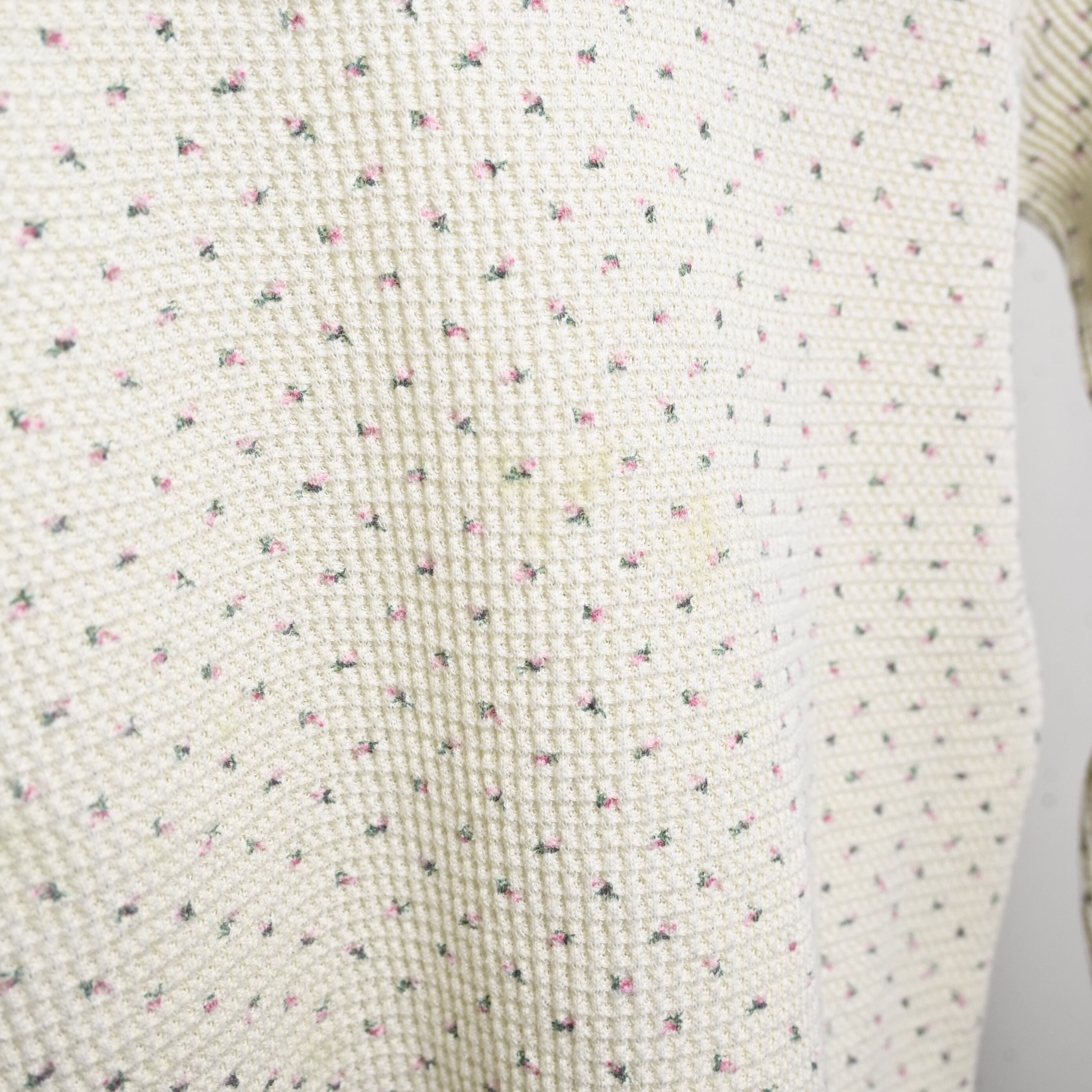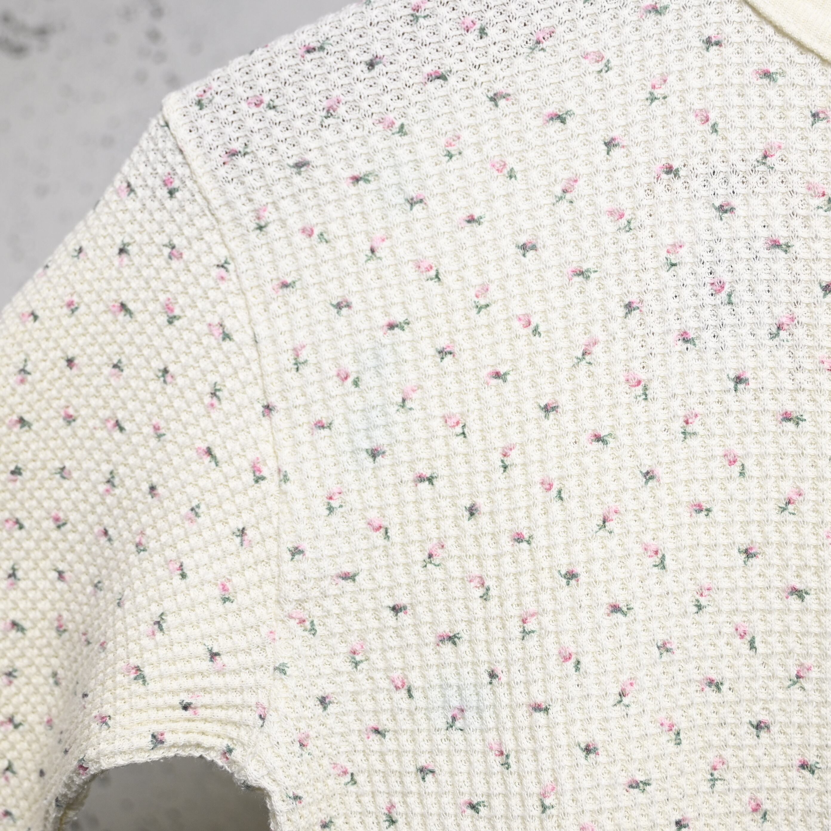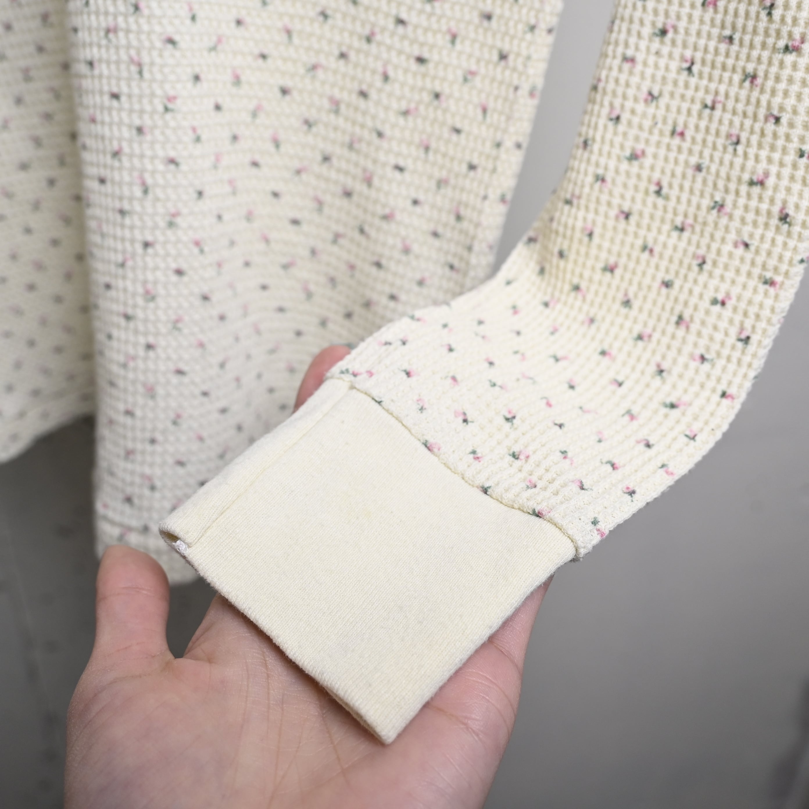細かなワッフル編みのボディに、小さなピンクの花柄を規則的に散りばめた、やわらかな雰囲気の一枚。ベースカラーは真っ白ではなく、少し生成りがかったクリームトーンで、柄の淡いピンクとグリーンが自然に馴染み、落ち着いた印象にまとまっています。