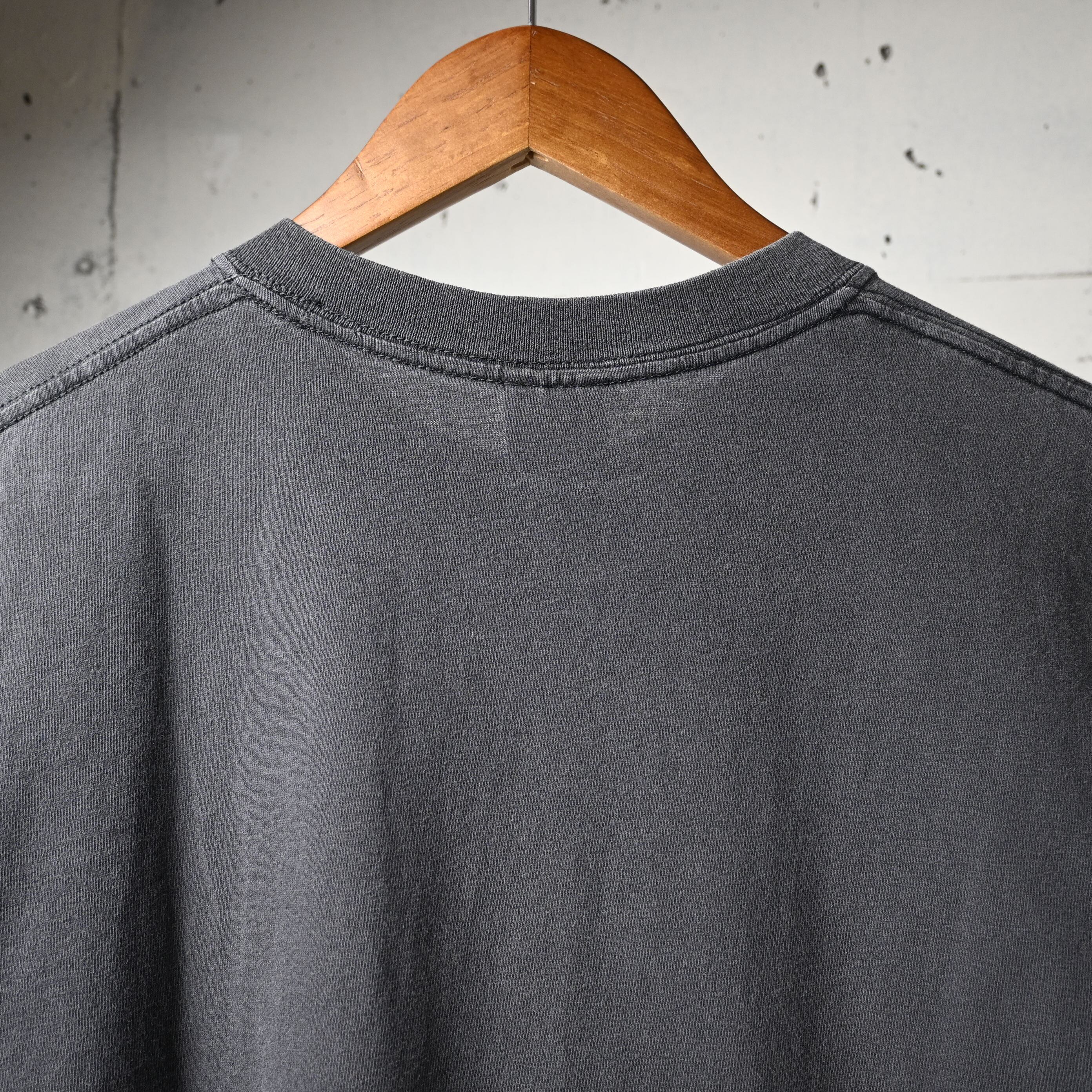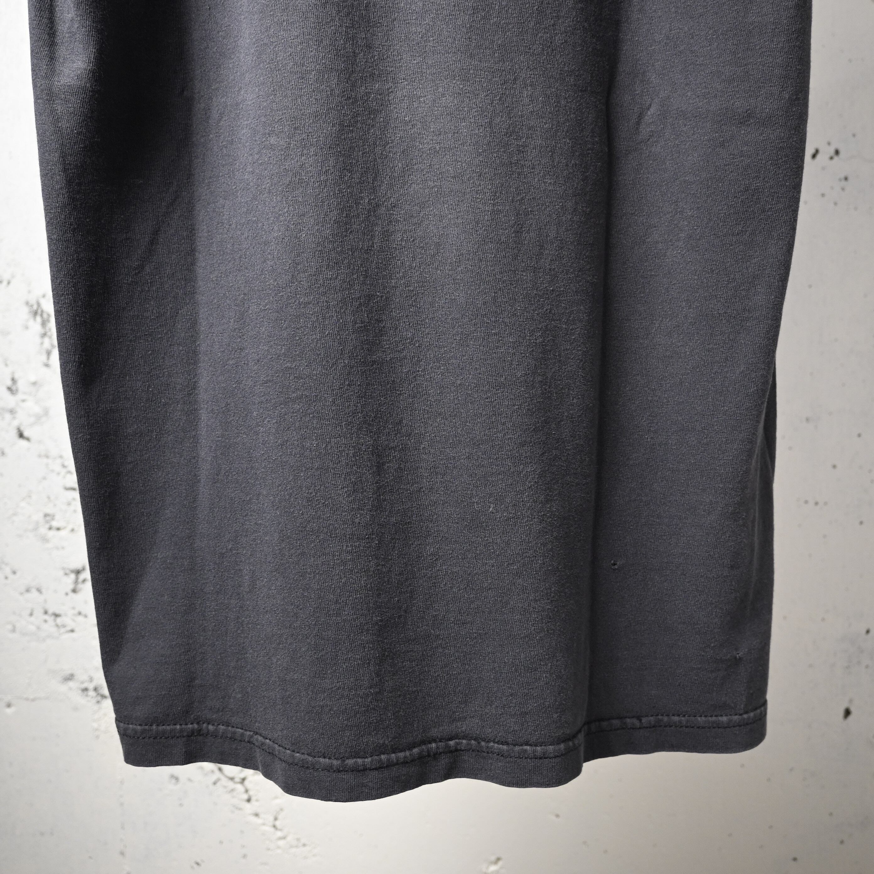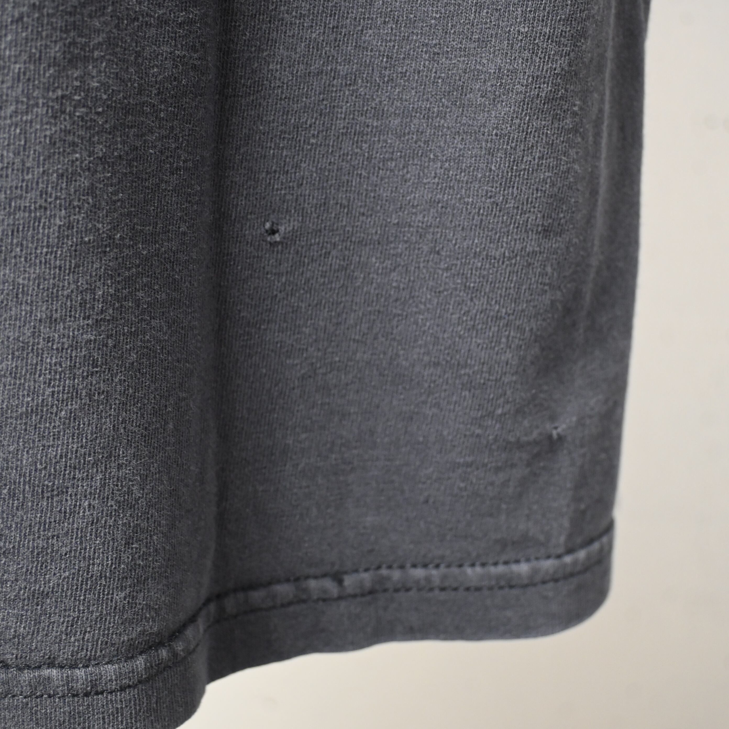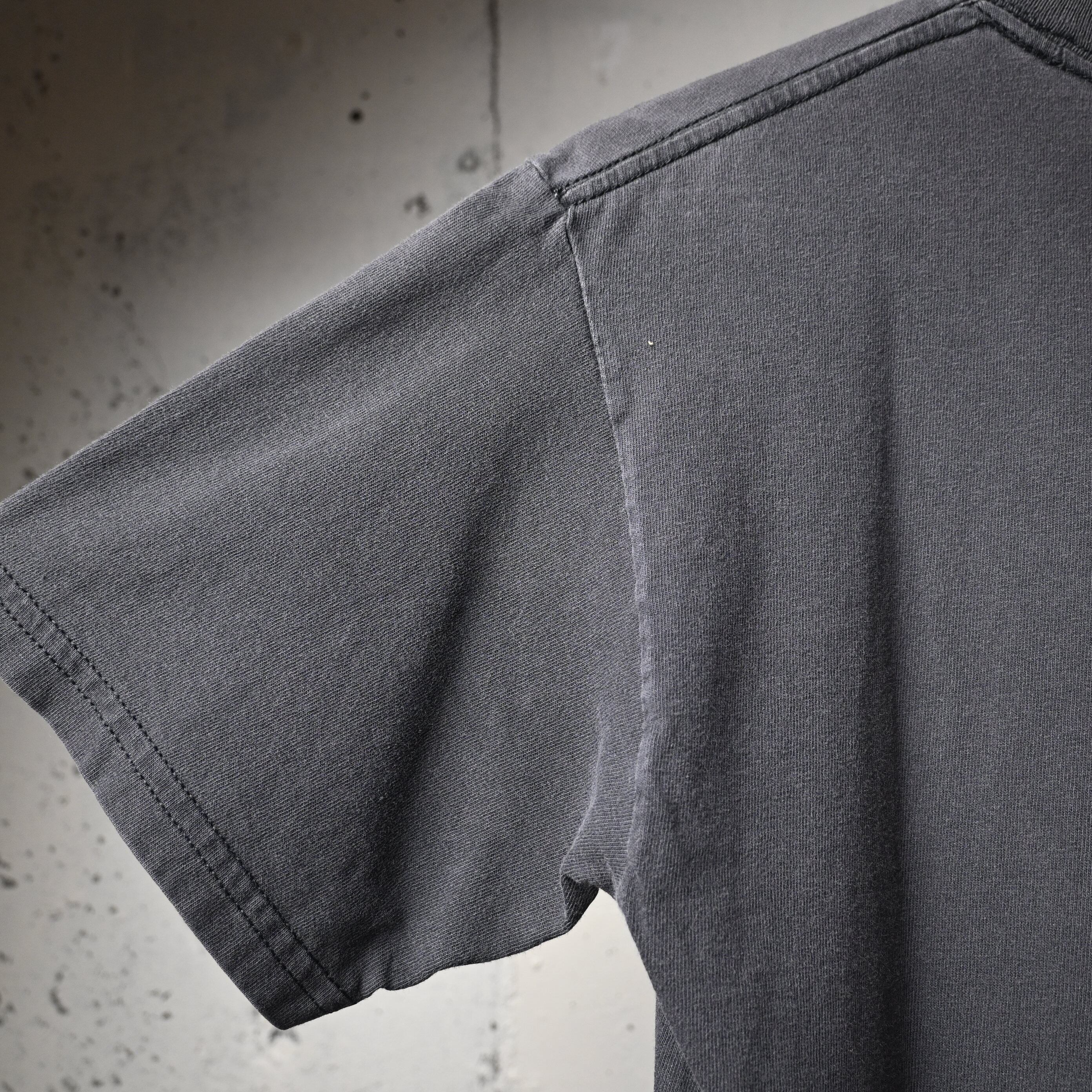 ボディはGildan HEAVY WEIGHT COTTON、ハイチ製。2000年代前半らしいしっかりとした厚みのあるコットン生地で、ブラックボディには程よいフェード感も出ており、新品にはない古着らしい雰囲気があります。