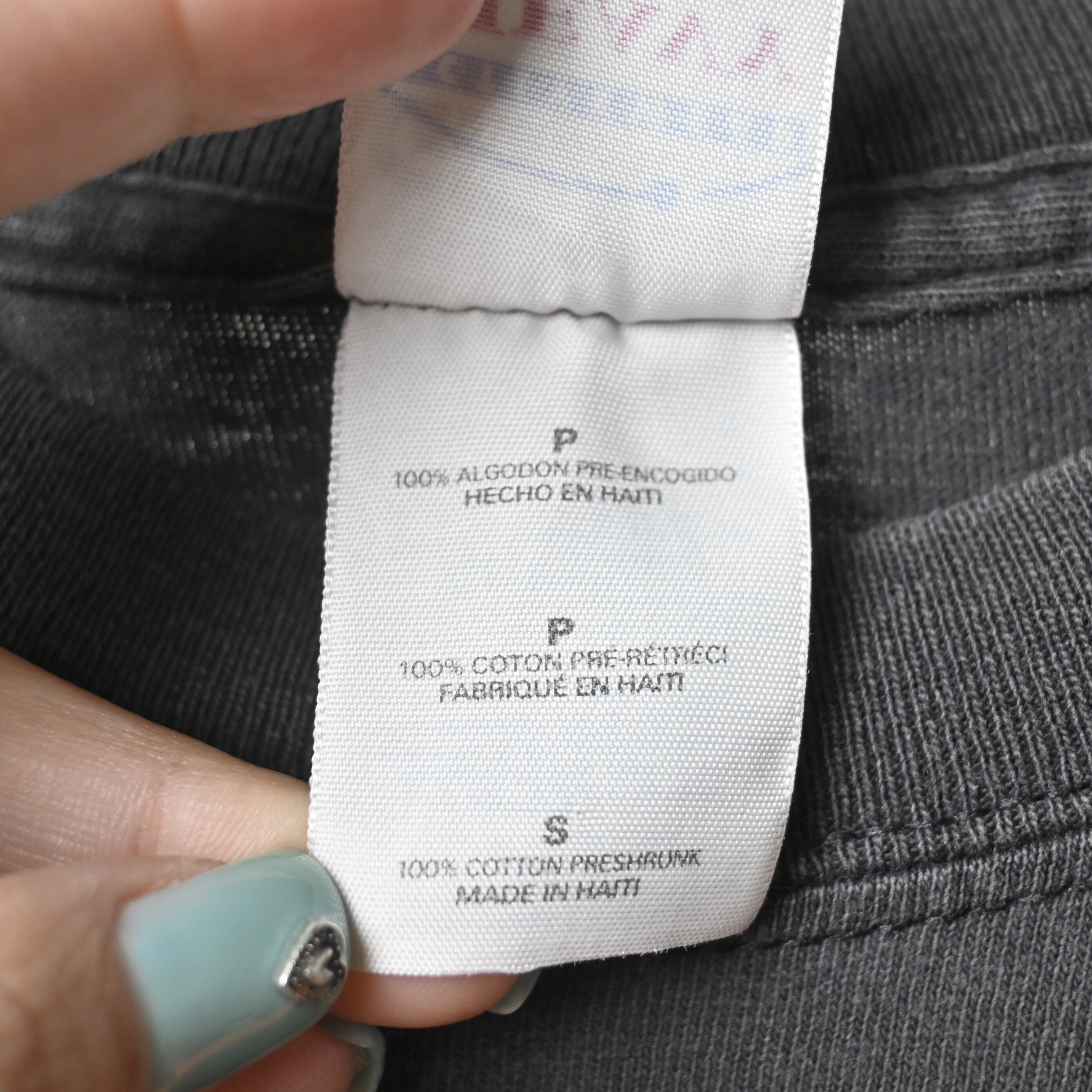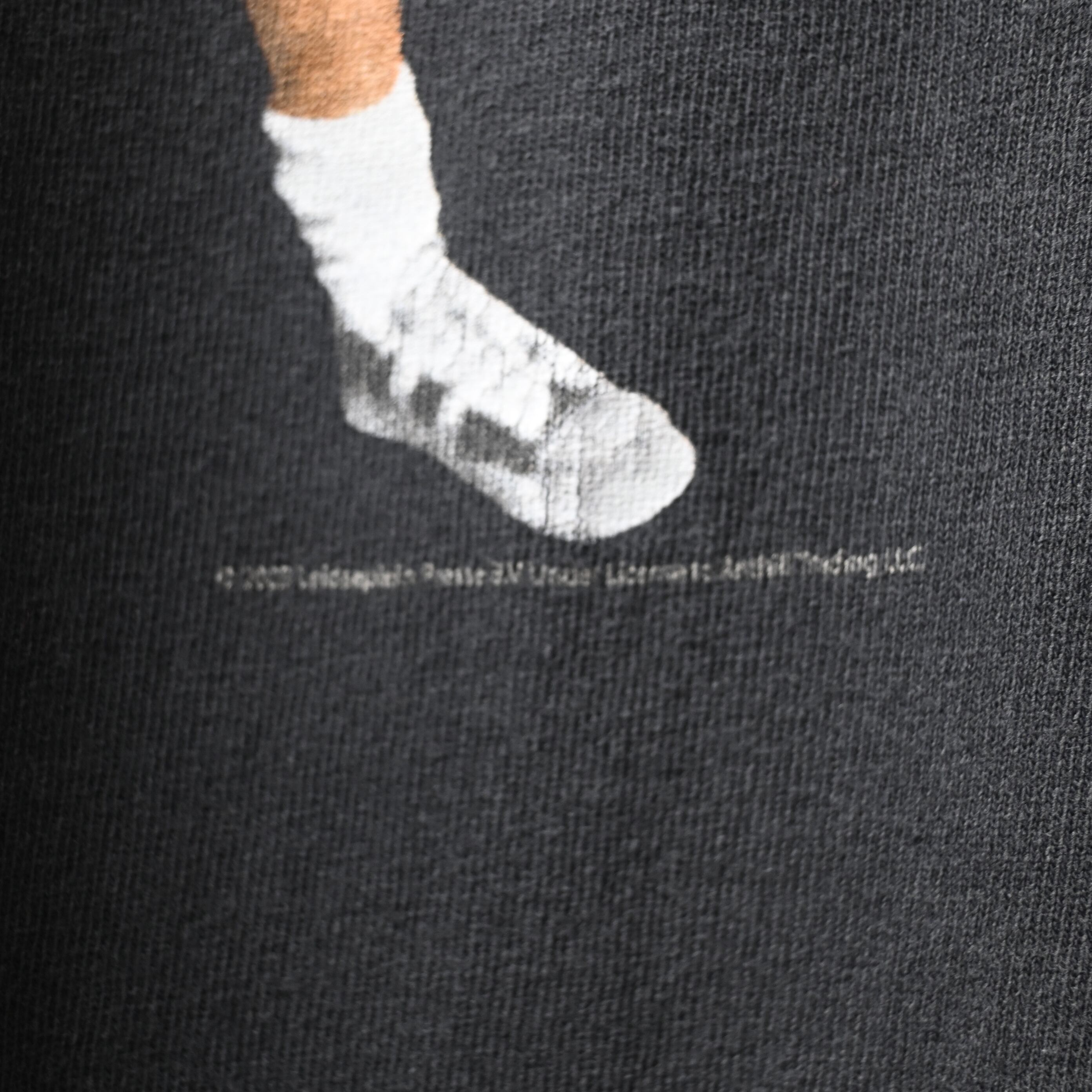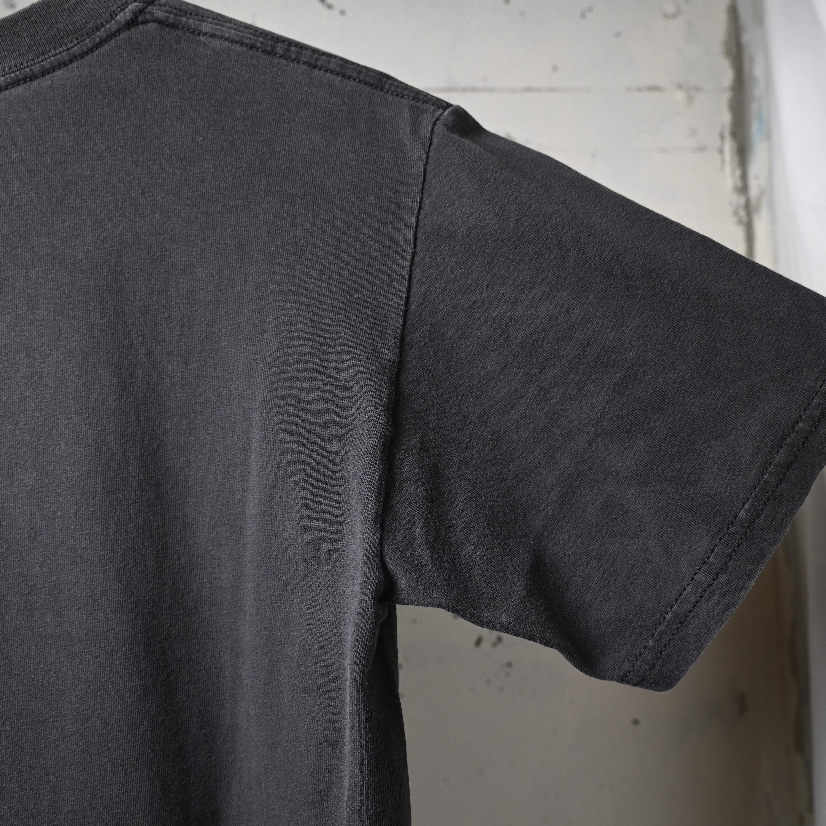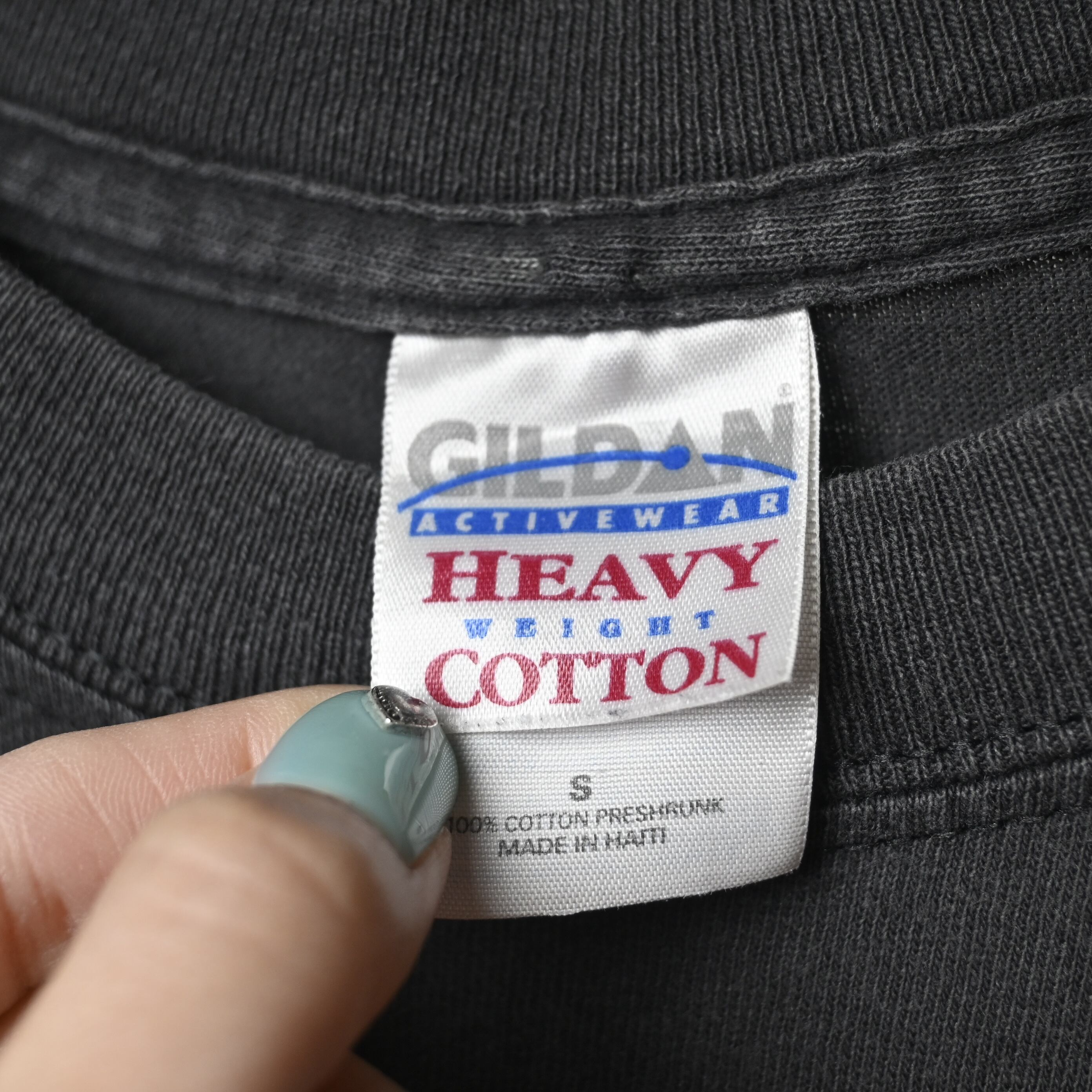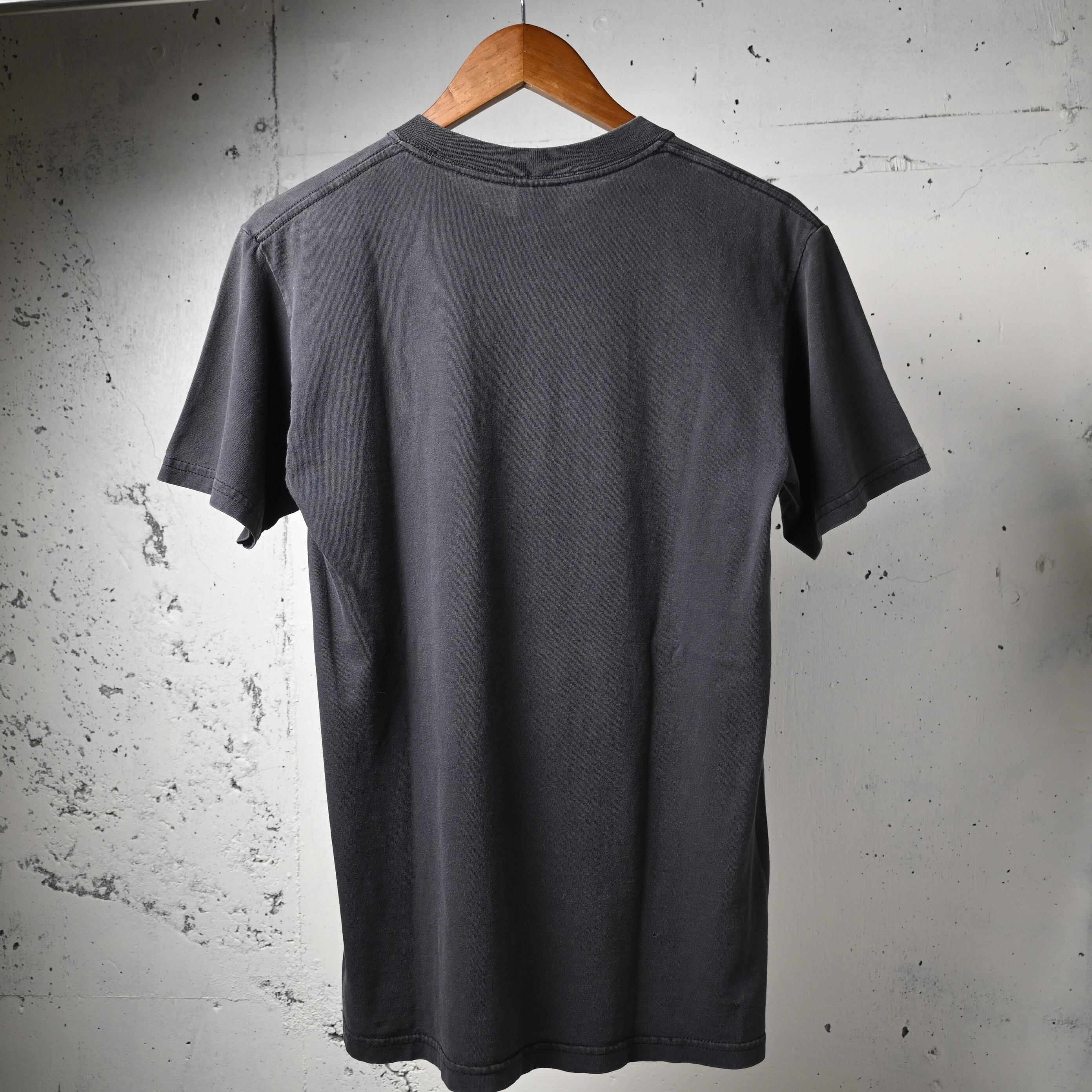 ボディはGildan HEAVY WEIGHT COTTON、ハイチ製。2000年代前半らしいしっかりとした厚みのあるコットン生地で、ブラックボディには程よいフェード感も出ており、新品にはない古着らしい雰囲気があります。