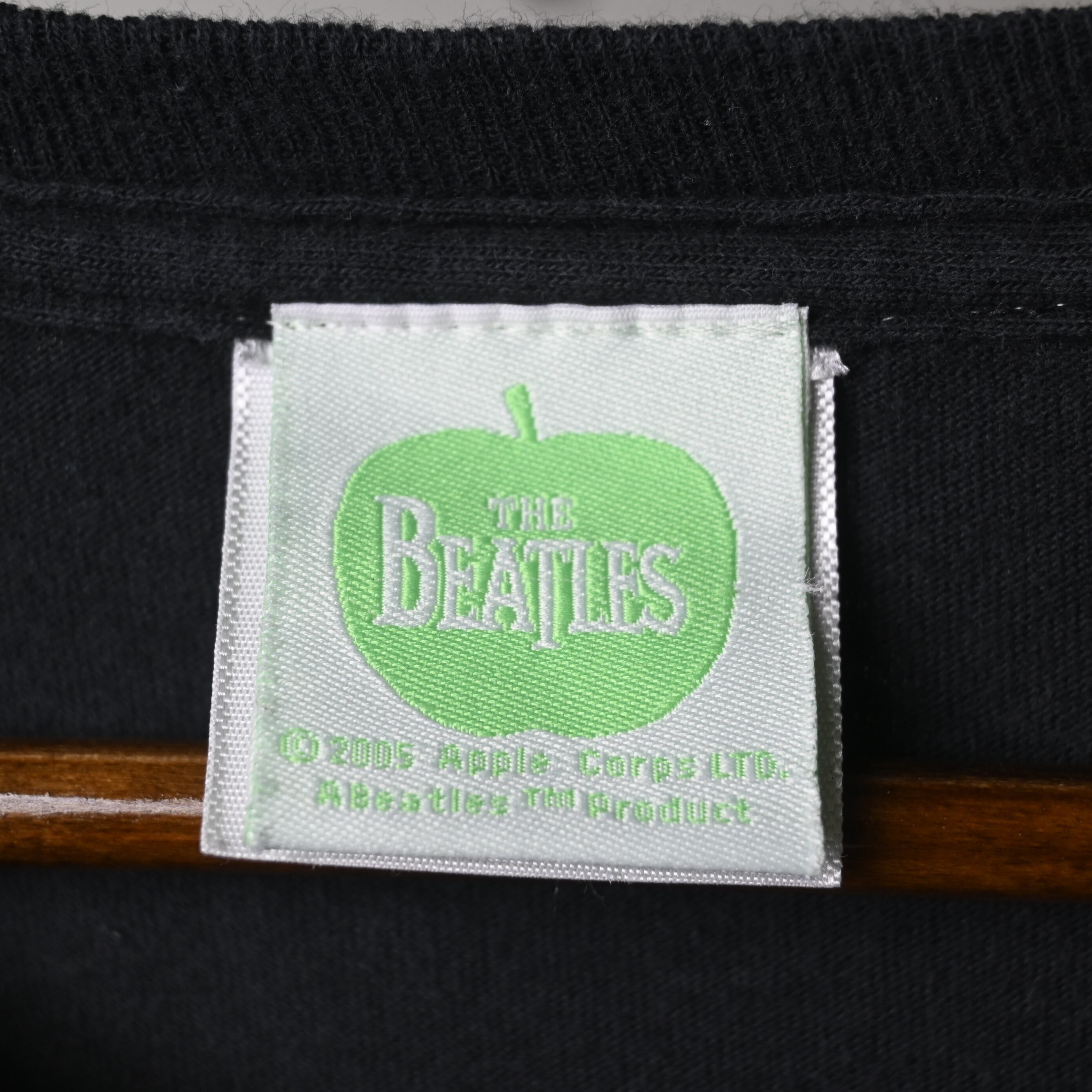 タグはアップルロゴ入りのオフィシャルタグ仕様で、©2009 Apple Corps表記入り。ボディはエルサルバドル製で、柔らかさのあるコットン素材と現代的なゆったりしたサイズ感が魅力です。