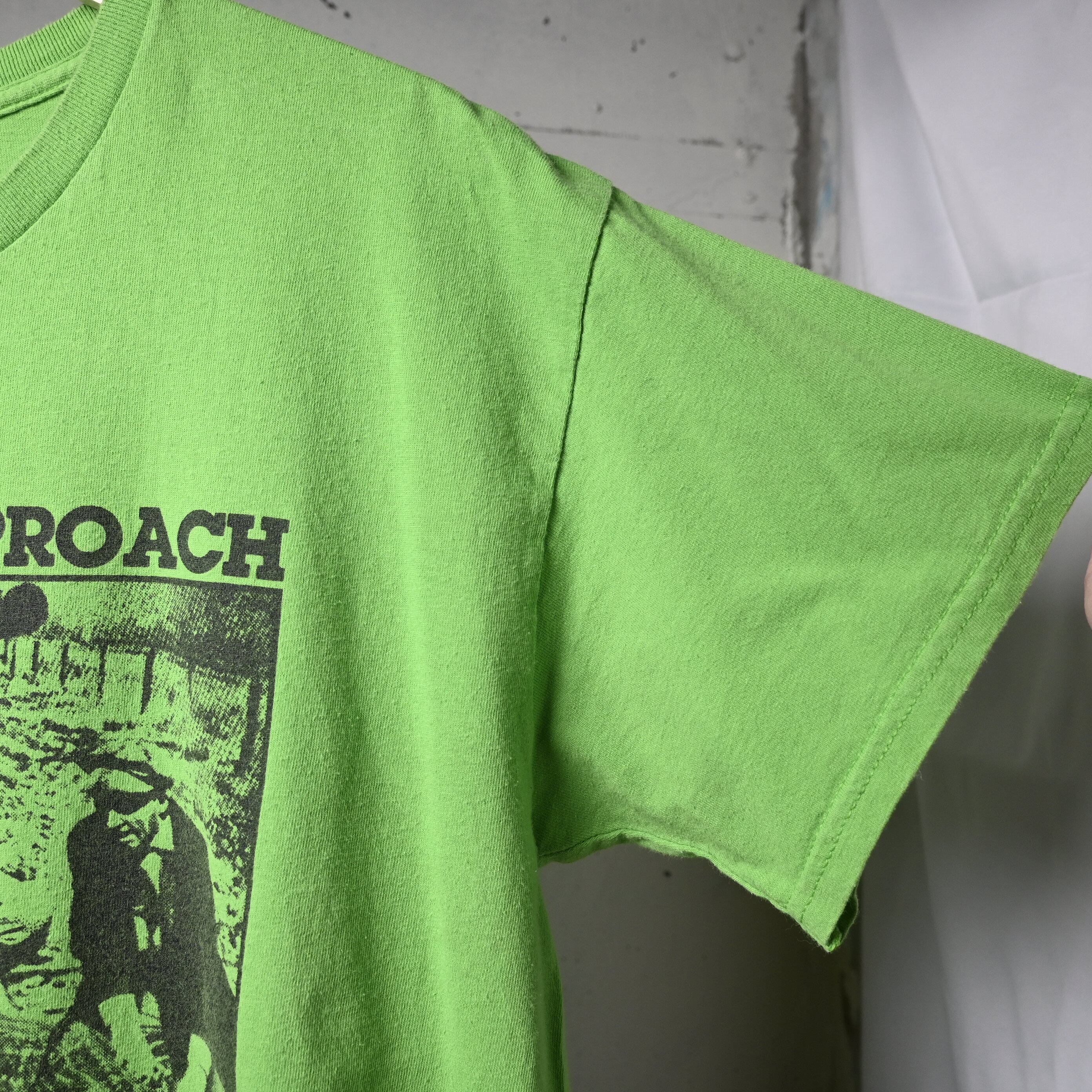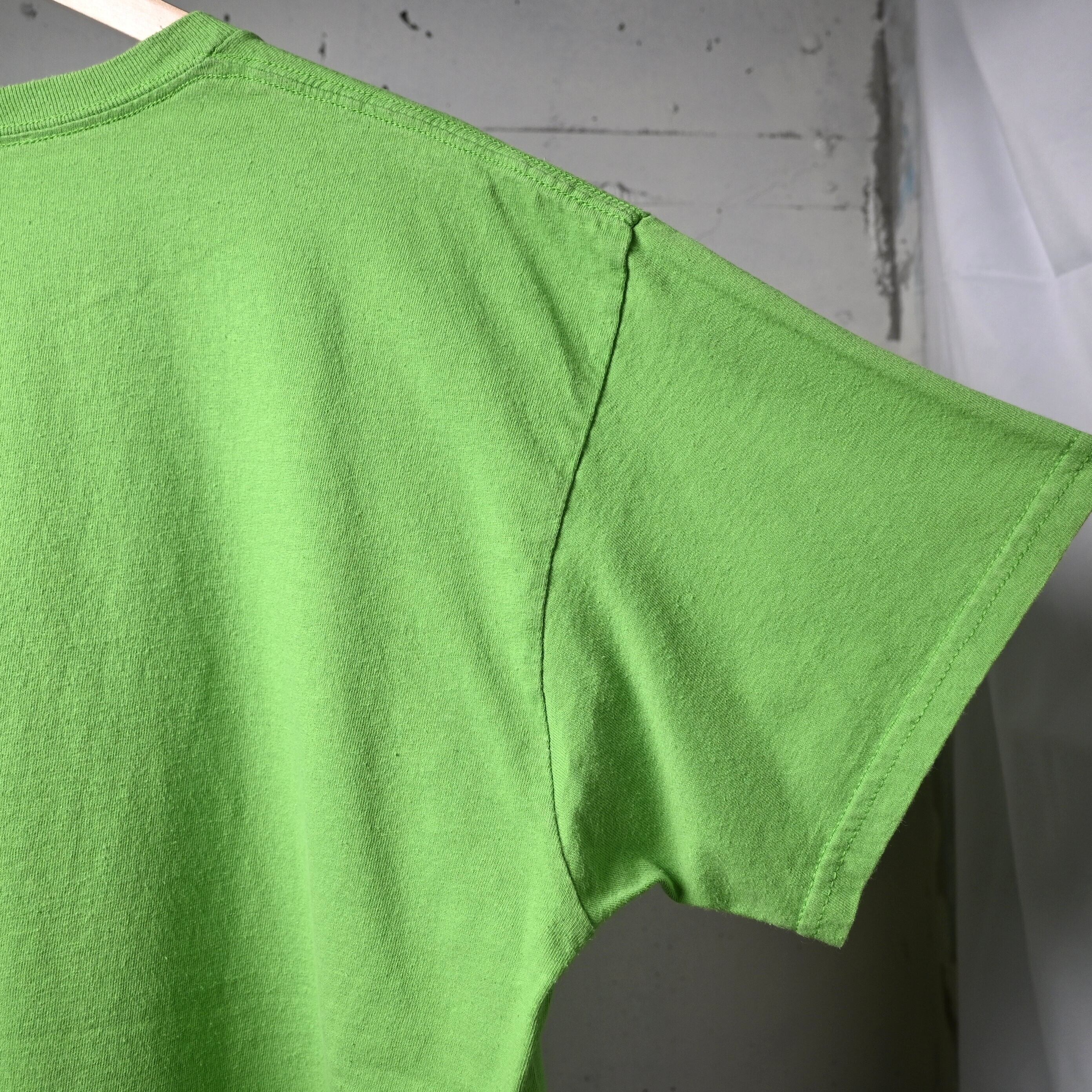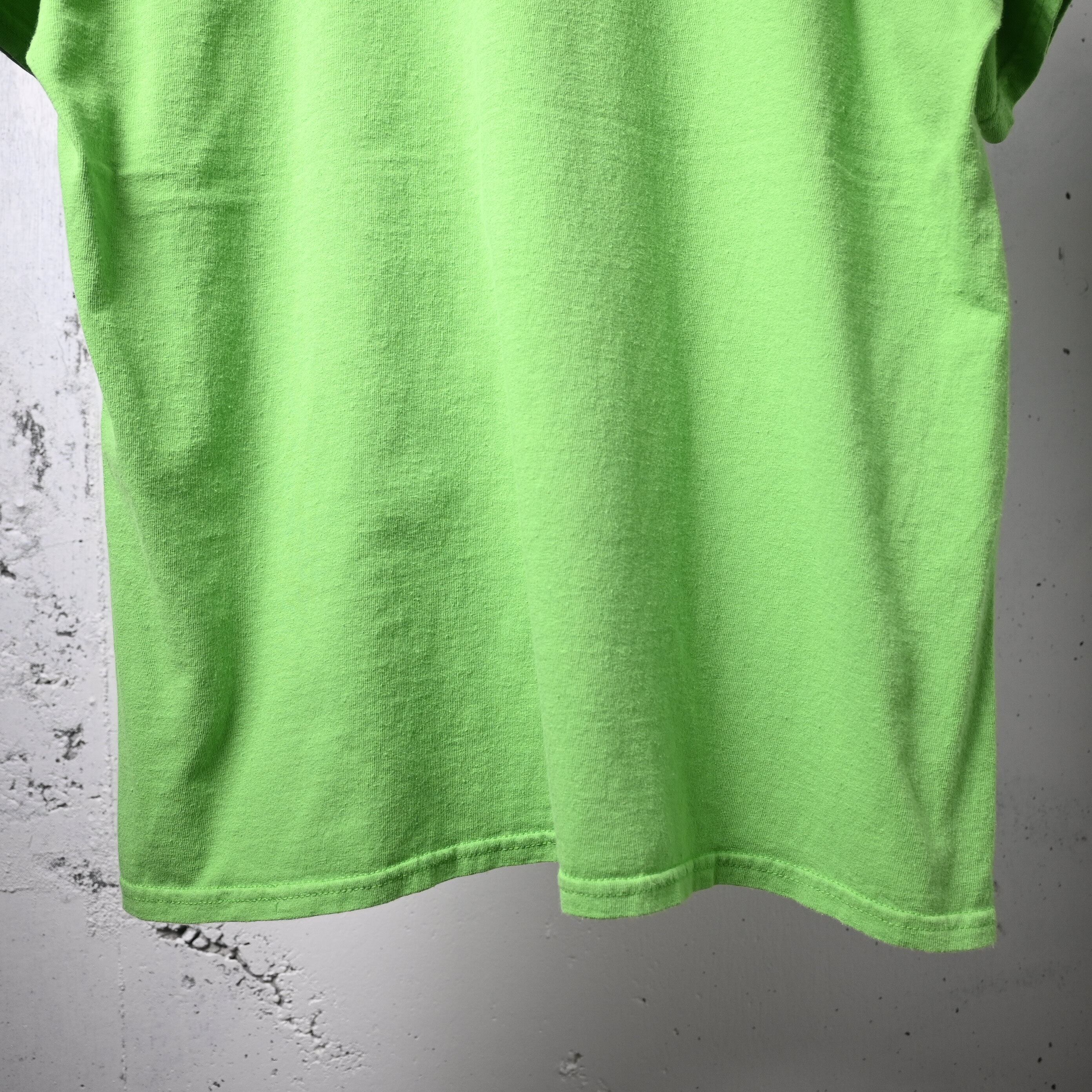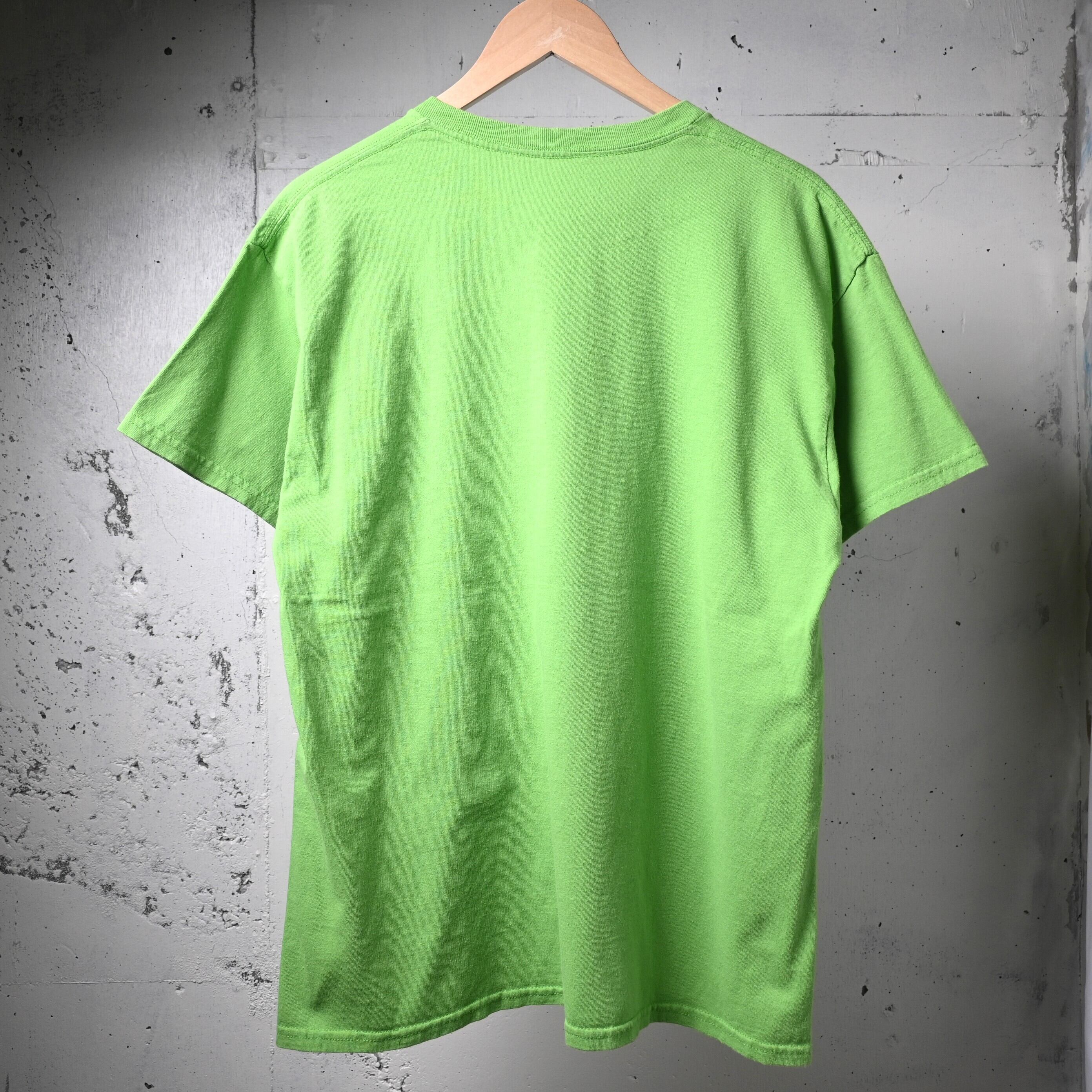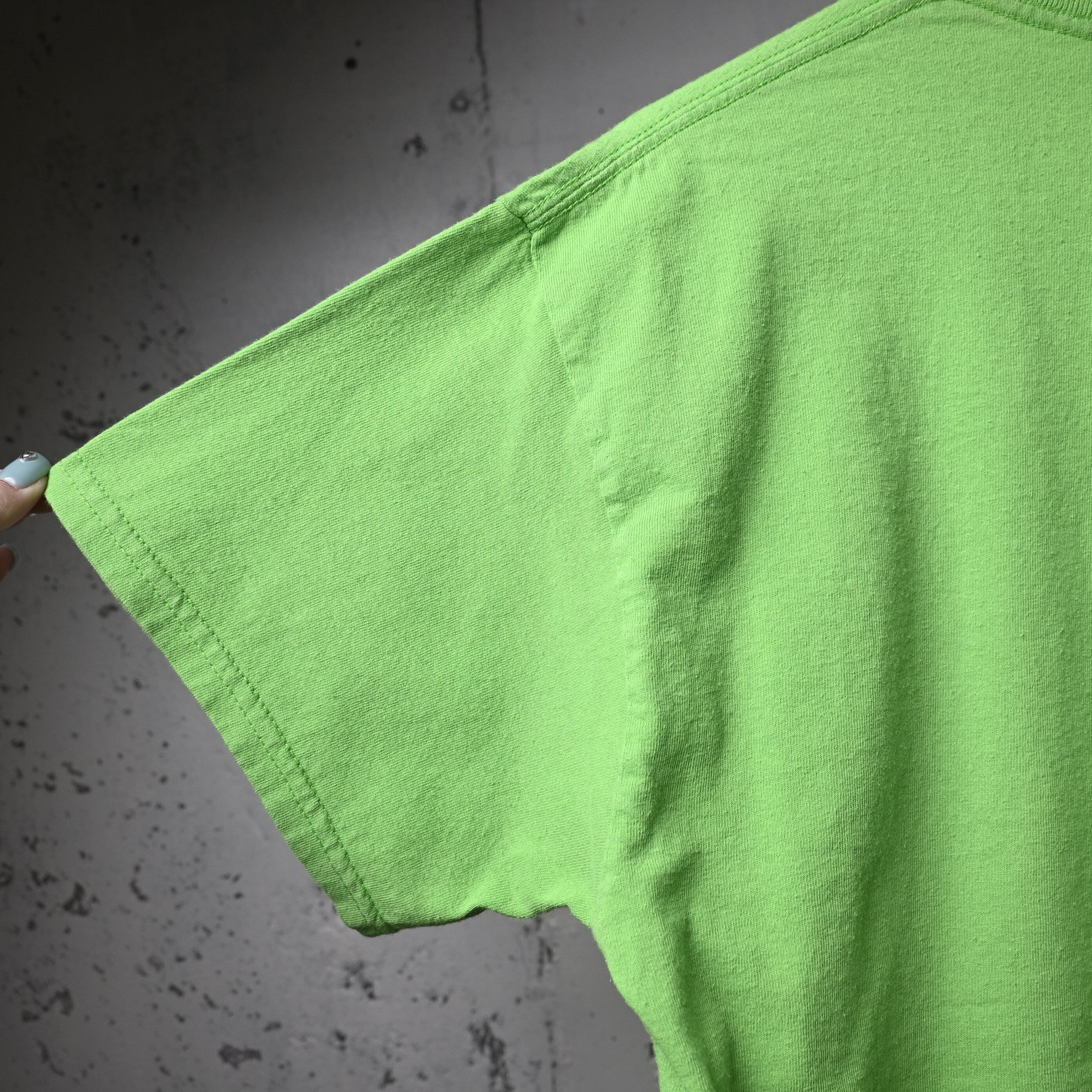 ボディは鮮やかなネオングリーン。一般的なブラックやホワイトのバンドTとは違い、強い色味がプリントの無骨さを引き立て、スタイリングの主役になる一枚です。ブラックデニムや軍パンと合わせるだけでも存在感があります。