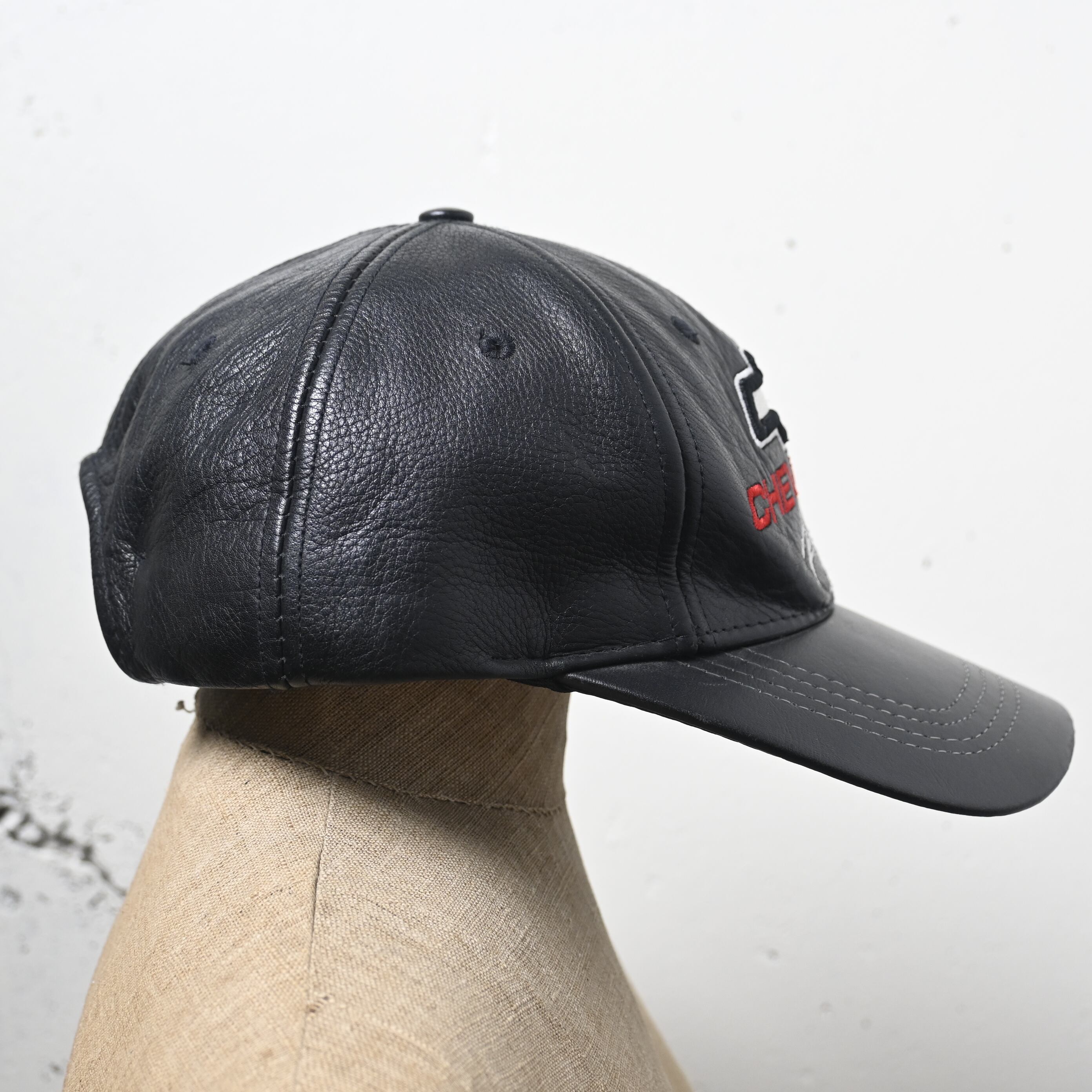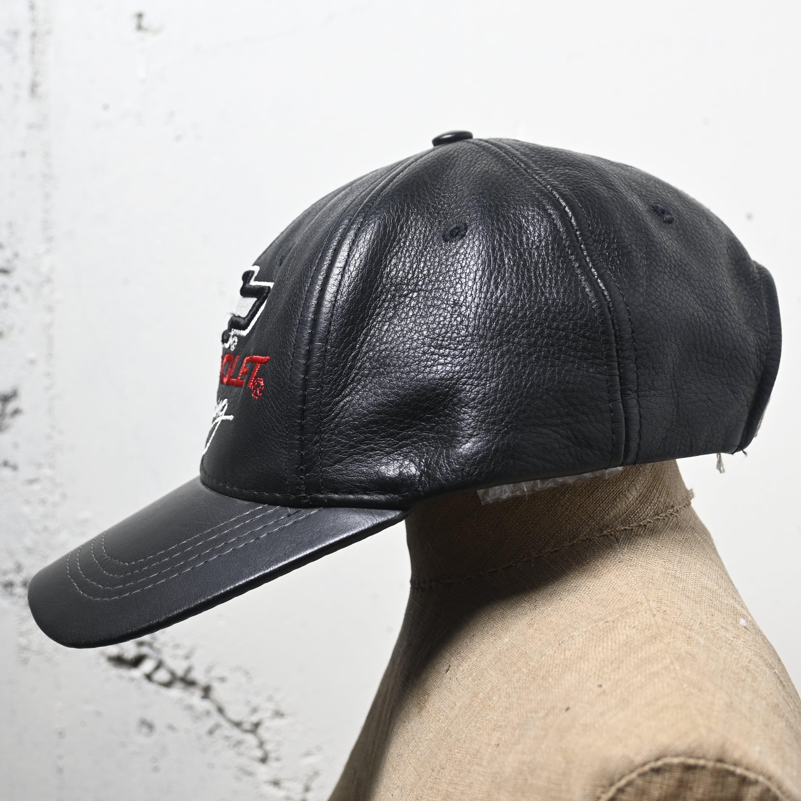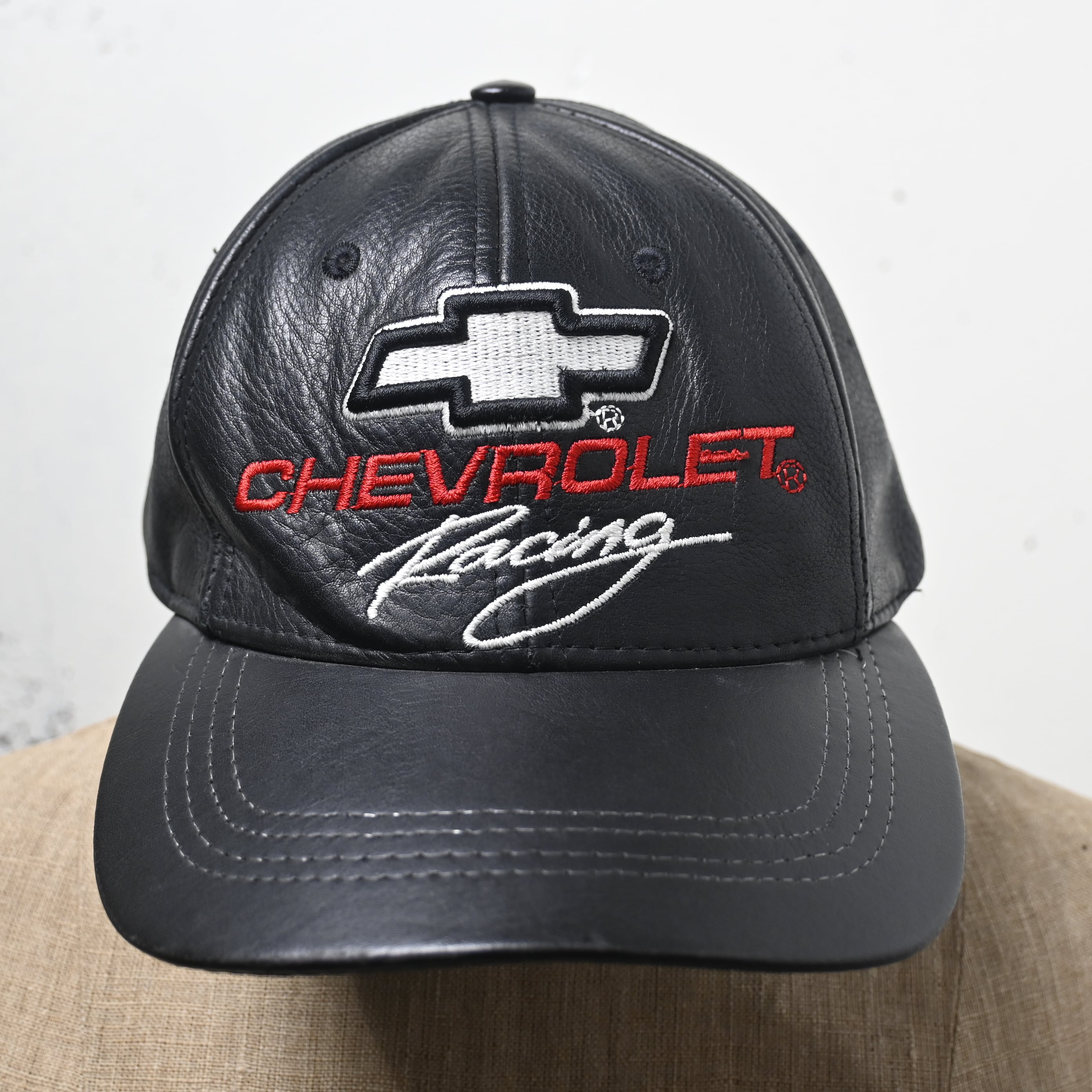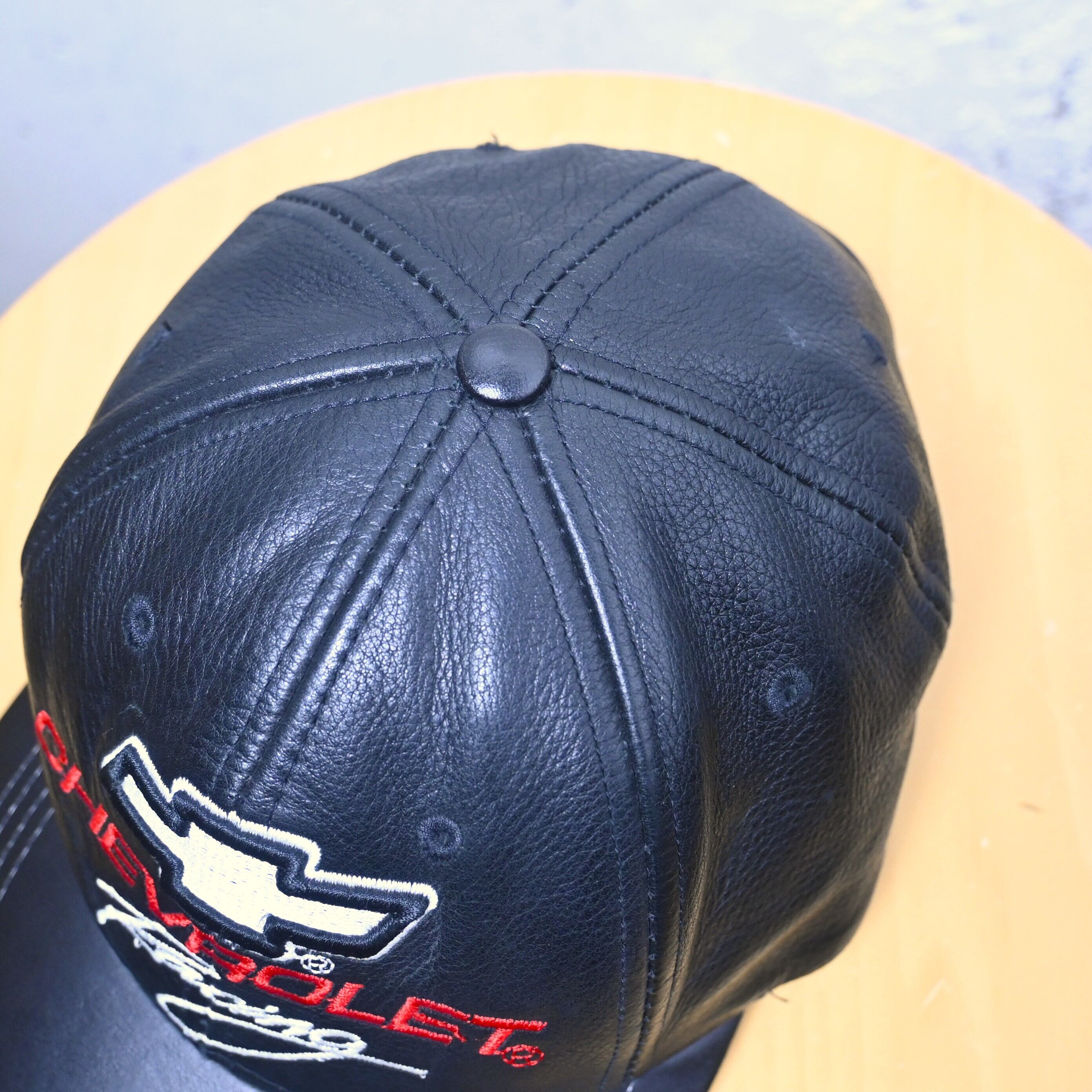 フロントにはシボレーの象徴的なボウタイロゴと "CHEVROLET Racing" 刺繍を大きく配置。ブラックレザーにホワイト・レッドの刺繍が映える、90〜00年代らしいモータースポーツカルチャー色の強いデザインです。
