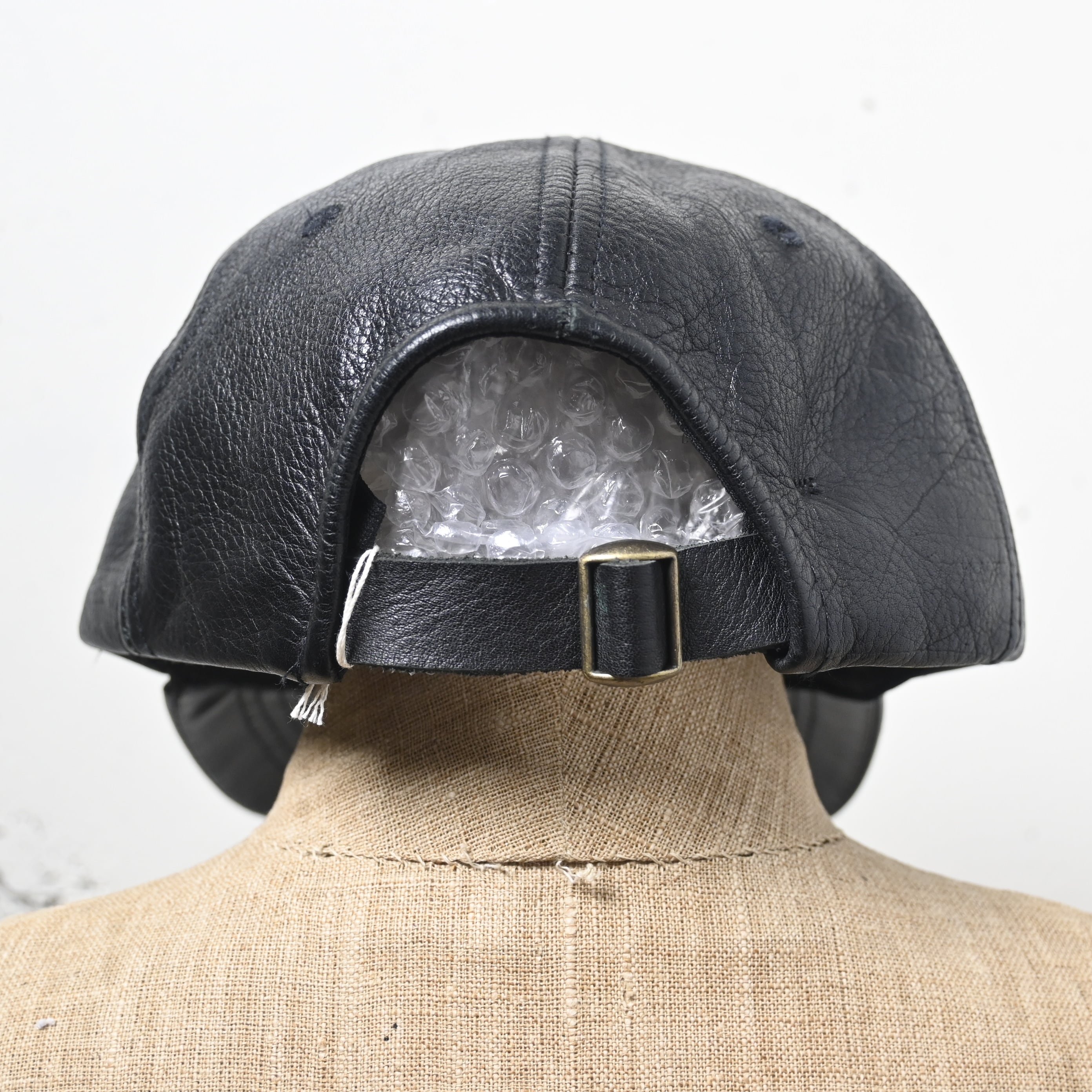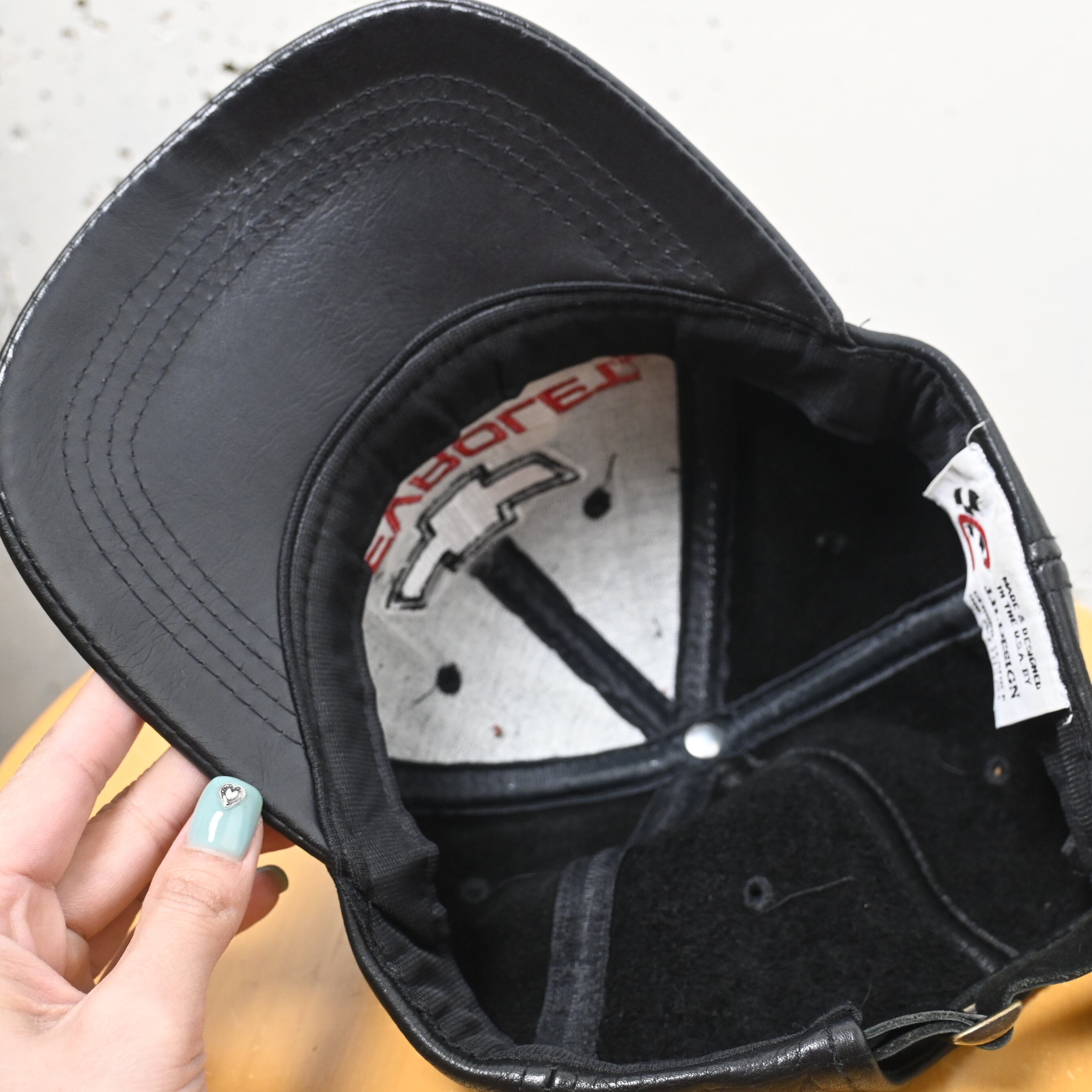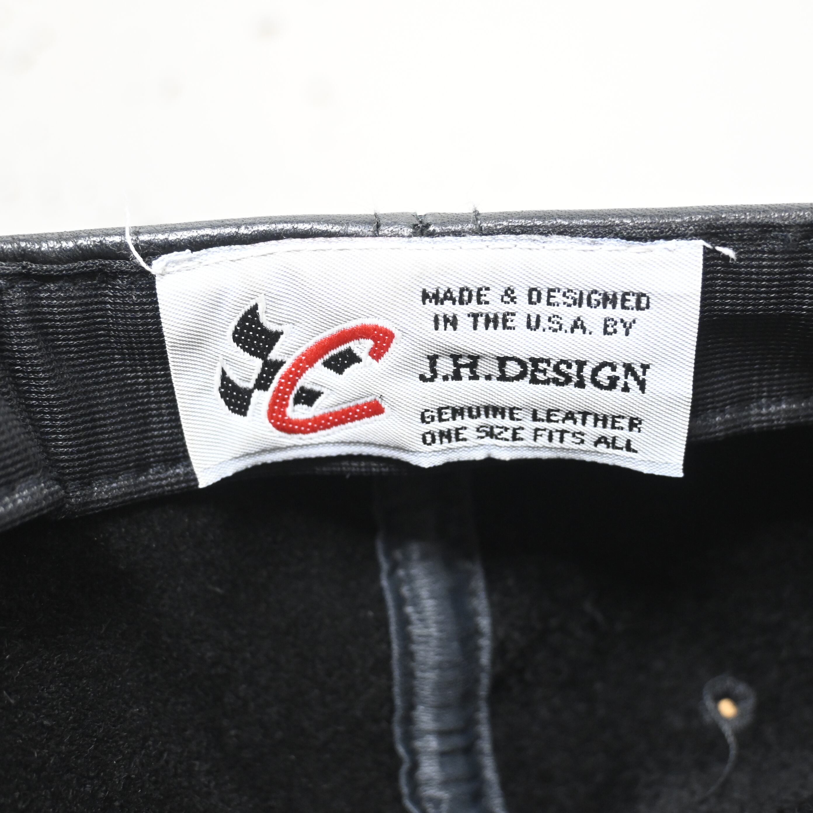 内側タグには "MADE & DESIGNED IN THE U.S.A." 表記入り。後部はレザーベルトでサイズ調整可能なフリーサイズ仕様です。