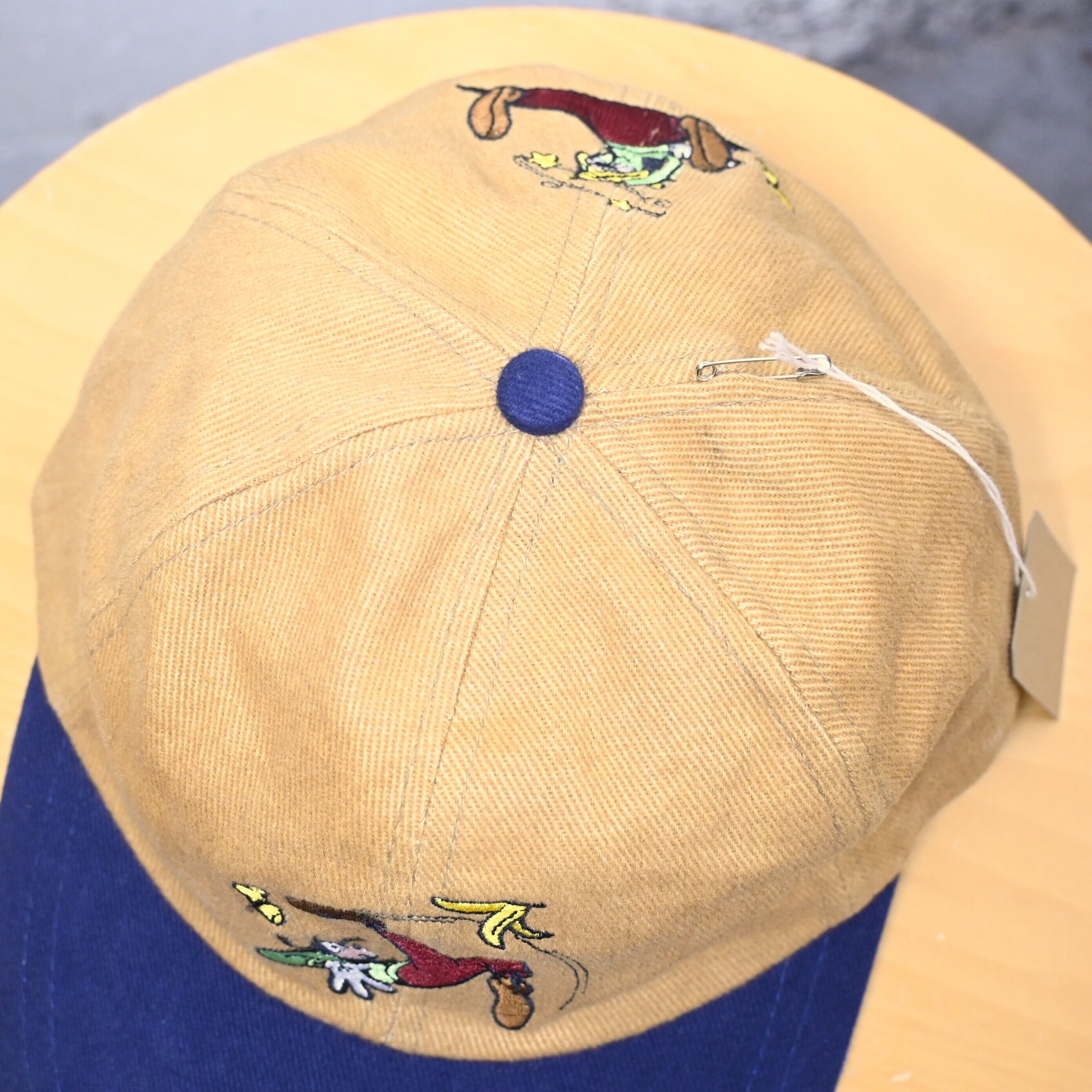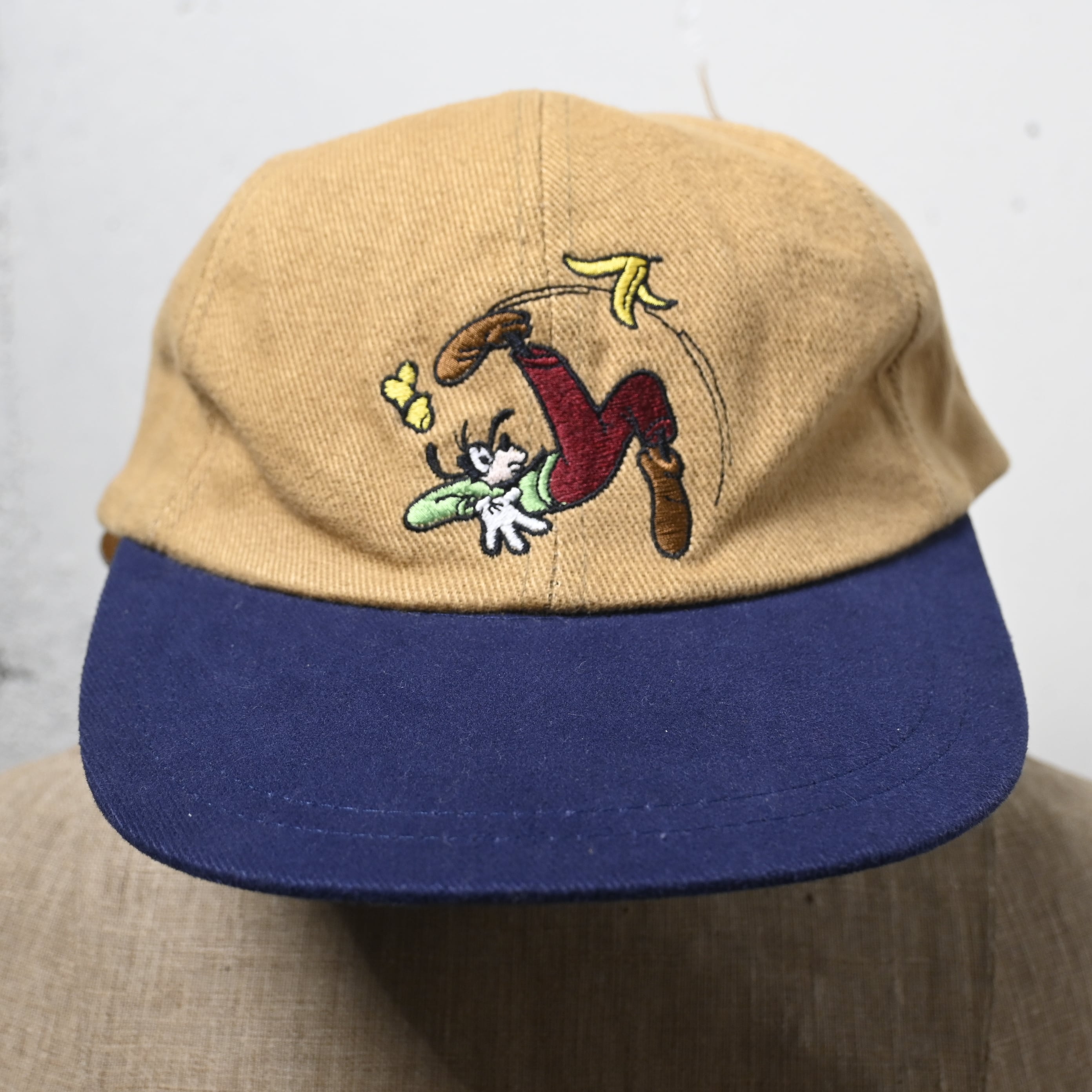 フロントには転びながらバナナの皮で滑るグーフィー、バックには頭上で星が回る別ポーズのグーフィー刺繍が入り、前後で異なるアートワークを楽しめるユニークなデザインです。キャラクターアイテムながら刺繍の色数が多く、90〜00年代らしいしっかりした作りが感じられます。