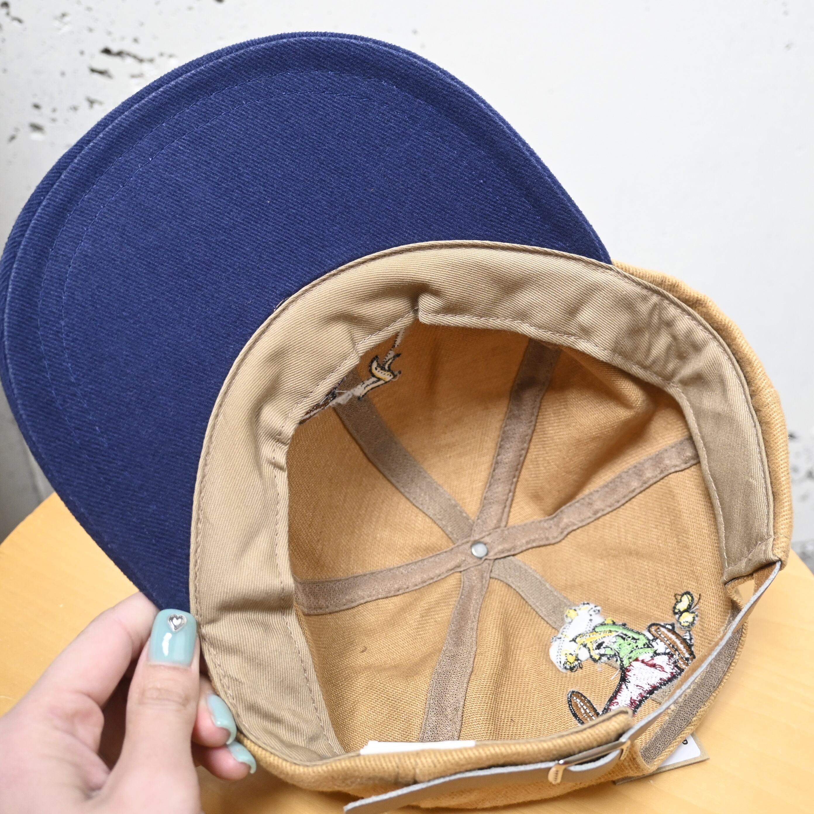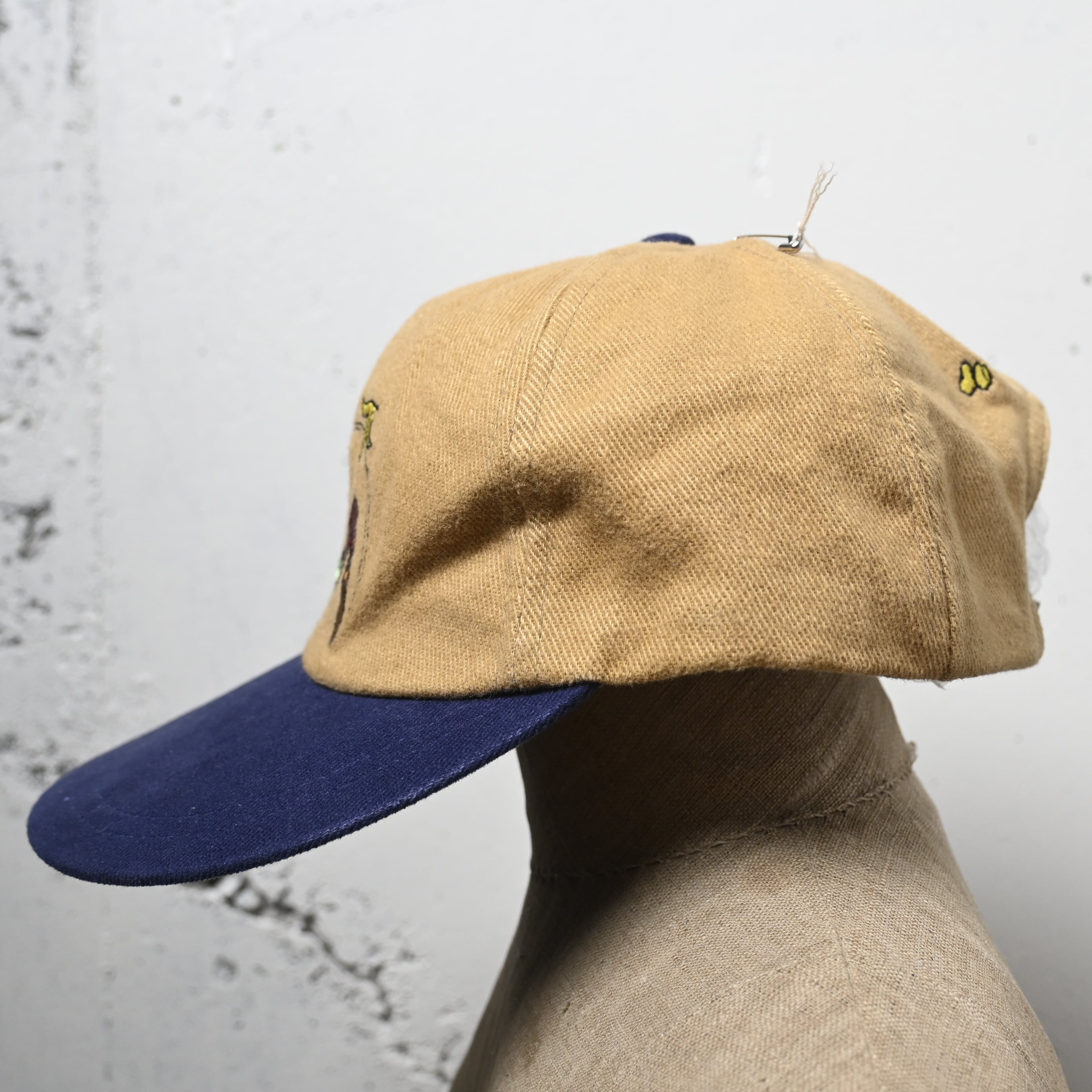 ベースはブラウン系ボディにネイビーツバの2トーン配色。落ち着いたカラーなのでキャラクター物でも派手になりすぎず、古着スタイルにも自然に取り入れやすいバランスです。
