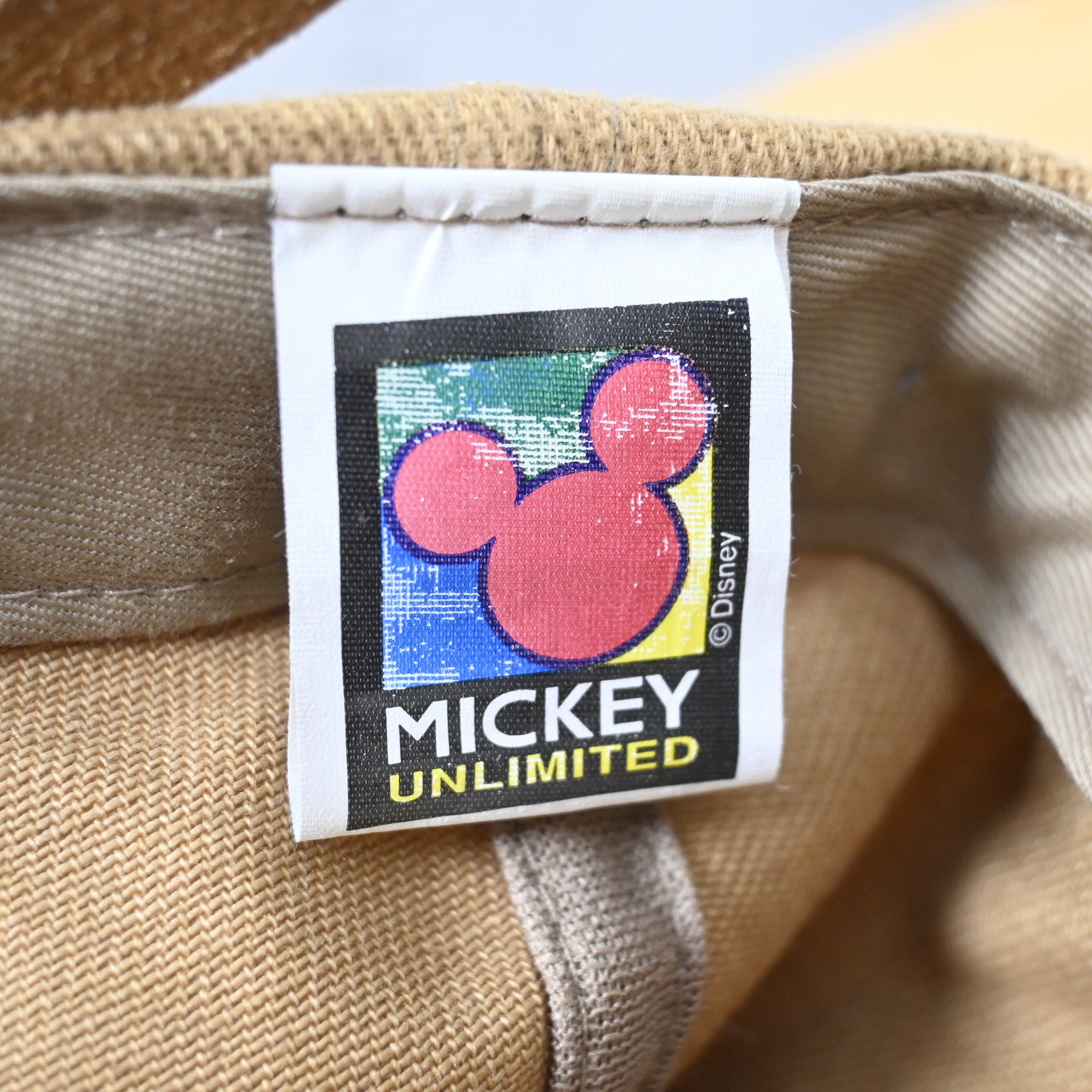 内タグには Disney ライセンス入り "MICKEY UNLIMITED" 表記。90年代後半〜00年代初頭に多く見られるオフィシャルラインで、当時らしい遊び心のあるグラフィックが魅力です。