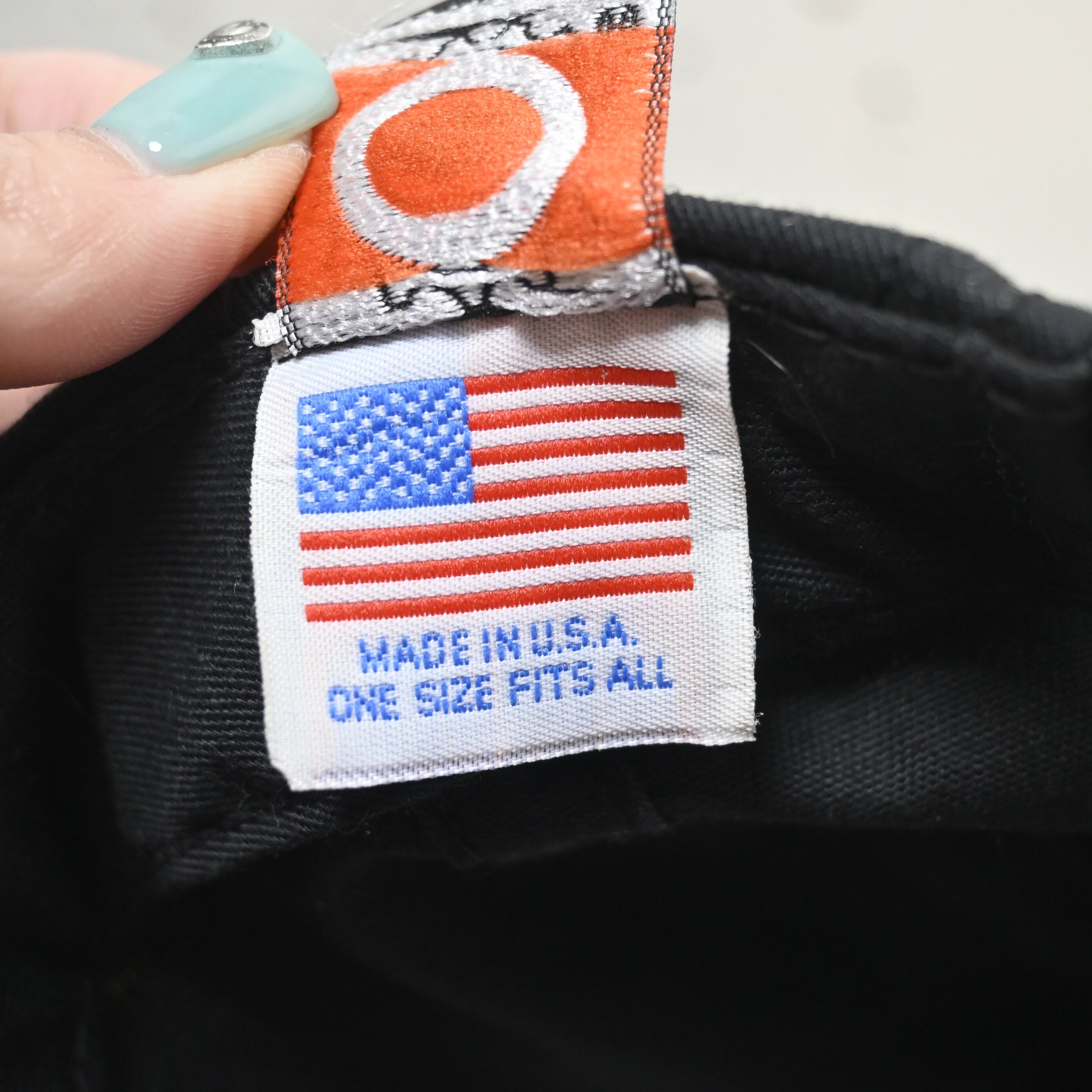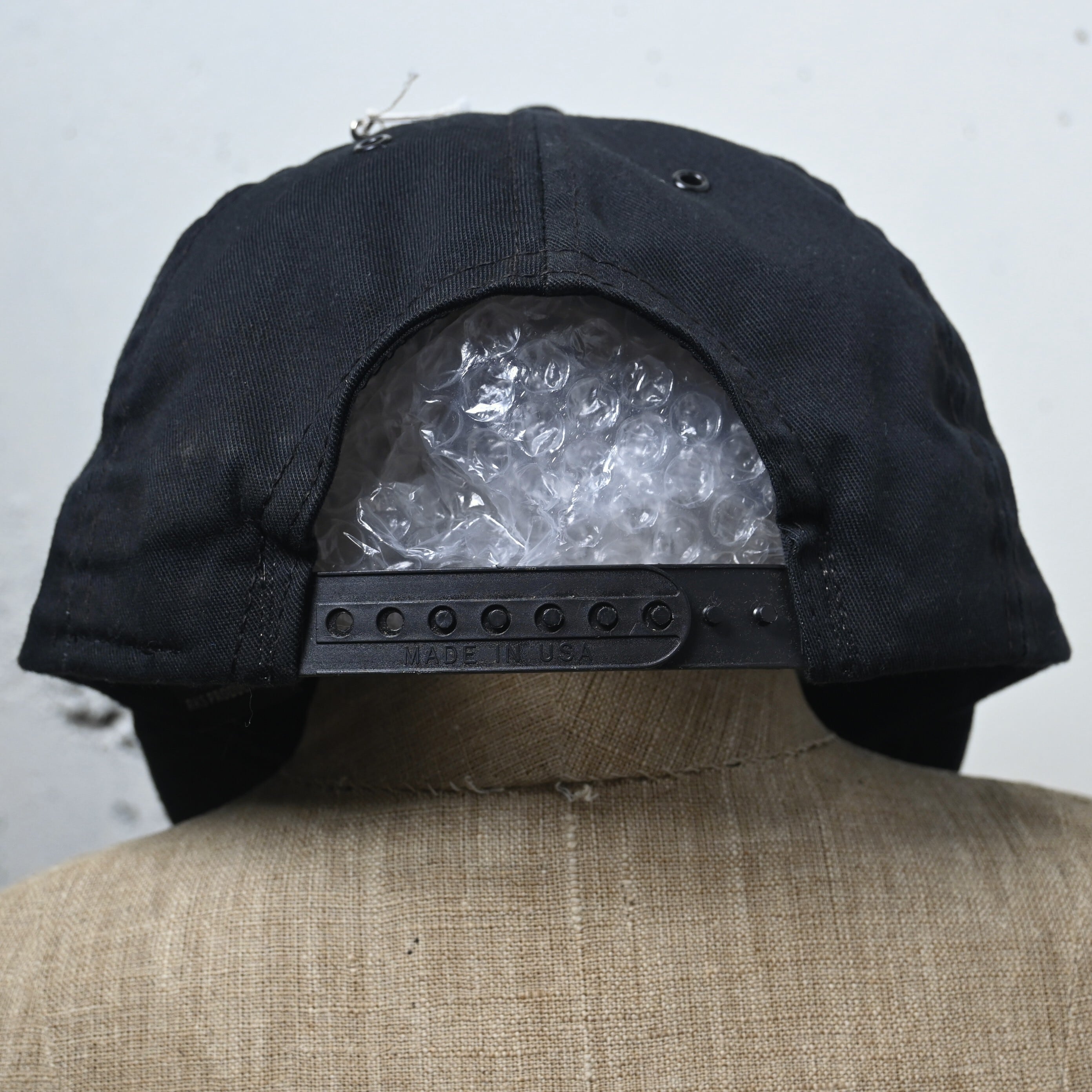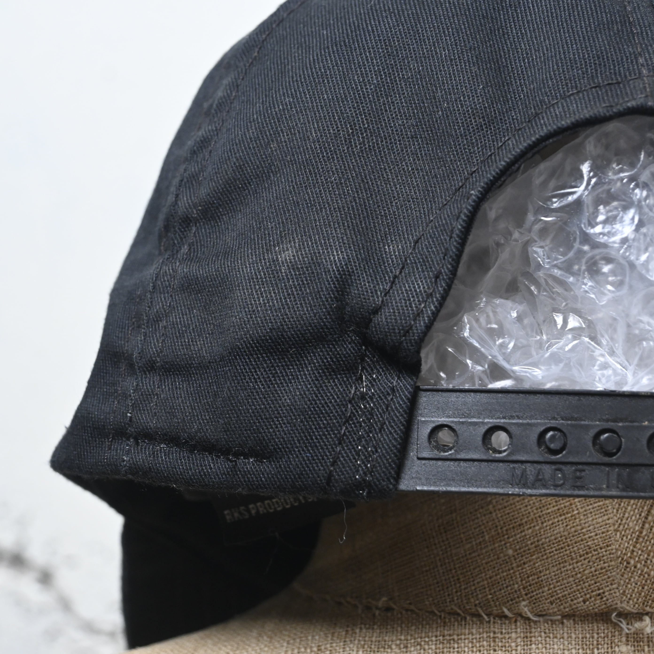 内タグはRS PRODUCTS INC製、さらに星条旗タグ付きのMADE IN U.S.A.表記。やや浅めでクラシックな6パネルシルエット、芯入りのフロントで形もきれいに保たれています。