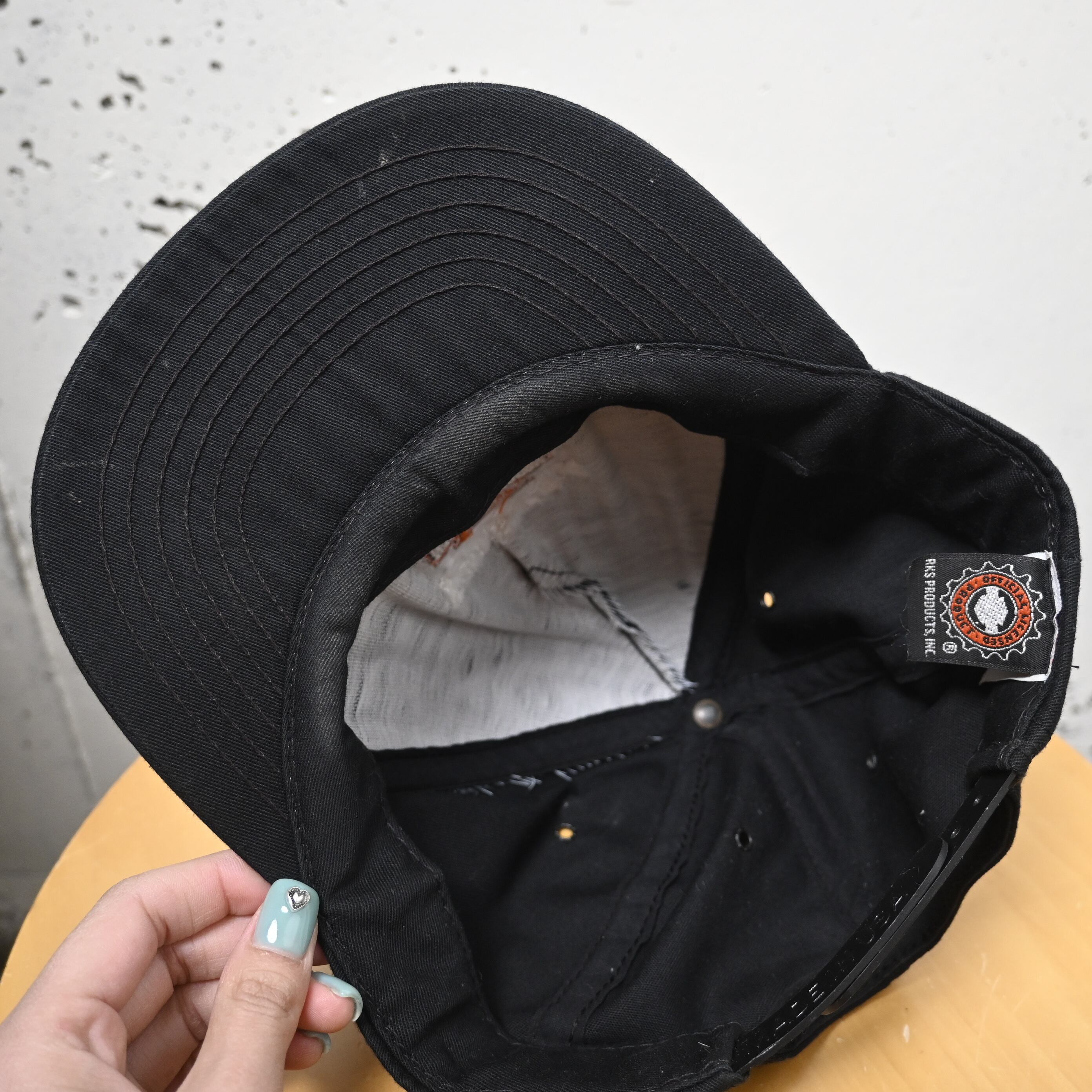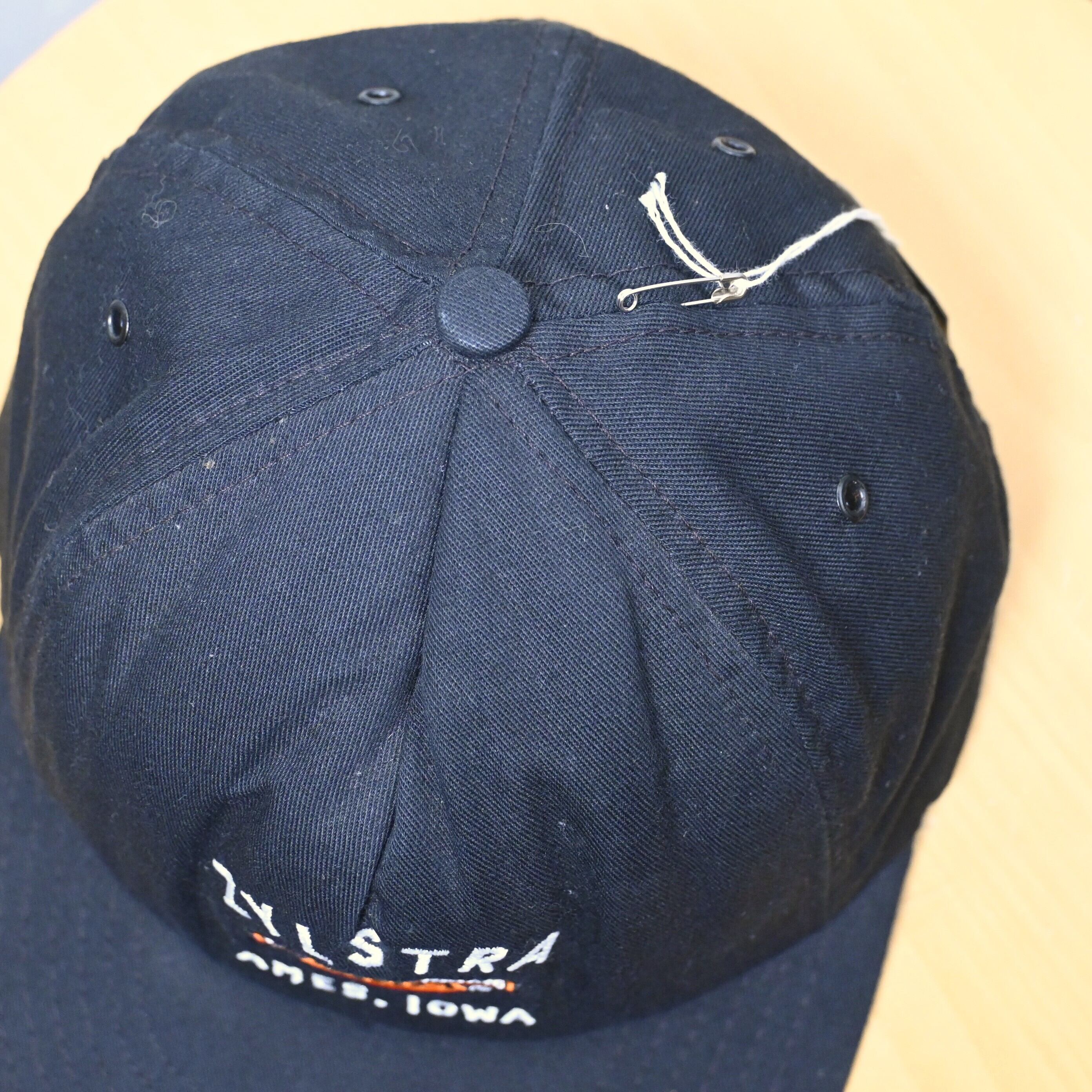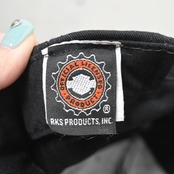"Ames, Iowa" はAmesに所在する販売拠点を示しており、ローカルディーラー販促品やショップオリジナルとして流通していた個体と思われます。シンプルなブラックボディにオレンジ×ホワイト刺繍の組み合わせで、ハーレーらしい無骨な配色にまとまっています。