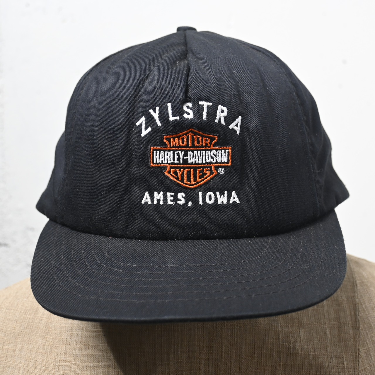 フロントにはブランドを象徴するバー&シールドロゴ刺繍、その上下に "ZYLSTRA" "AMES, IOWA" の文字が入るディーラー別注デザイン。アメリカ各地の正規ディーラー名入りアイテムは、現地流通らしい空気を持ち、同じハーレー物でも一点ごとの地域性が感じられるのが魅力です。