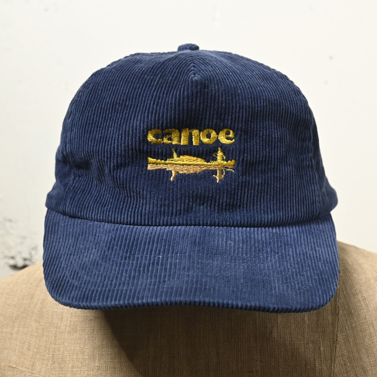 フロントには "canoe" ロゴと、水面に浮かぶカヌーの刺繍入り。ゴールド系の刺繍糸がネイビーの太畝コーデュロイに映え、シンプルながらクラシックなアウトドアテイストを感じるデザインです。