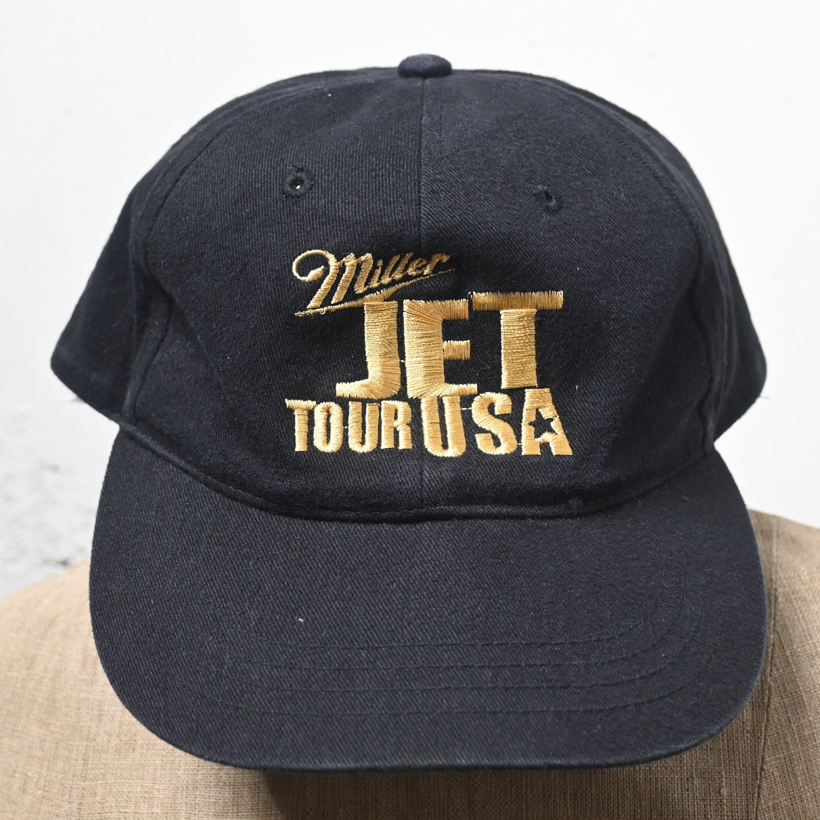 フロントには "Miller" ロゴと "JET TOUR USA" の大きな刺繍が入り、ブラックボディにゴールド刺繍が映える存在感のあるデザイン。イベントや販促用として制作された企業物らしい雰囲気があり、アメリカ企業カルチャーを感じられる一点です。