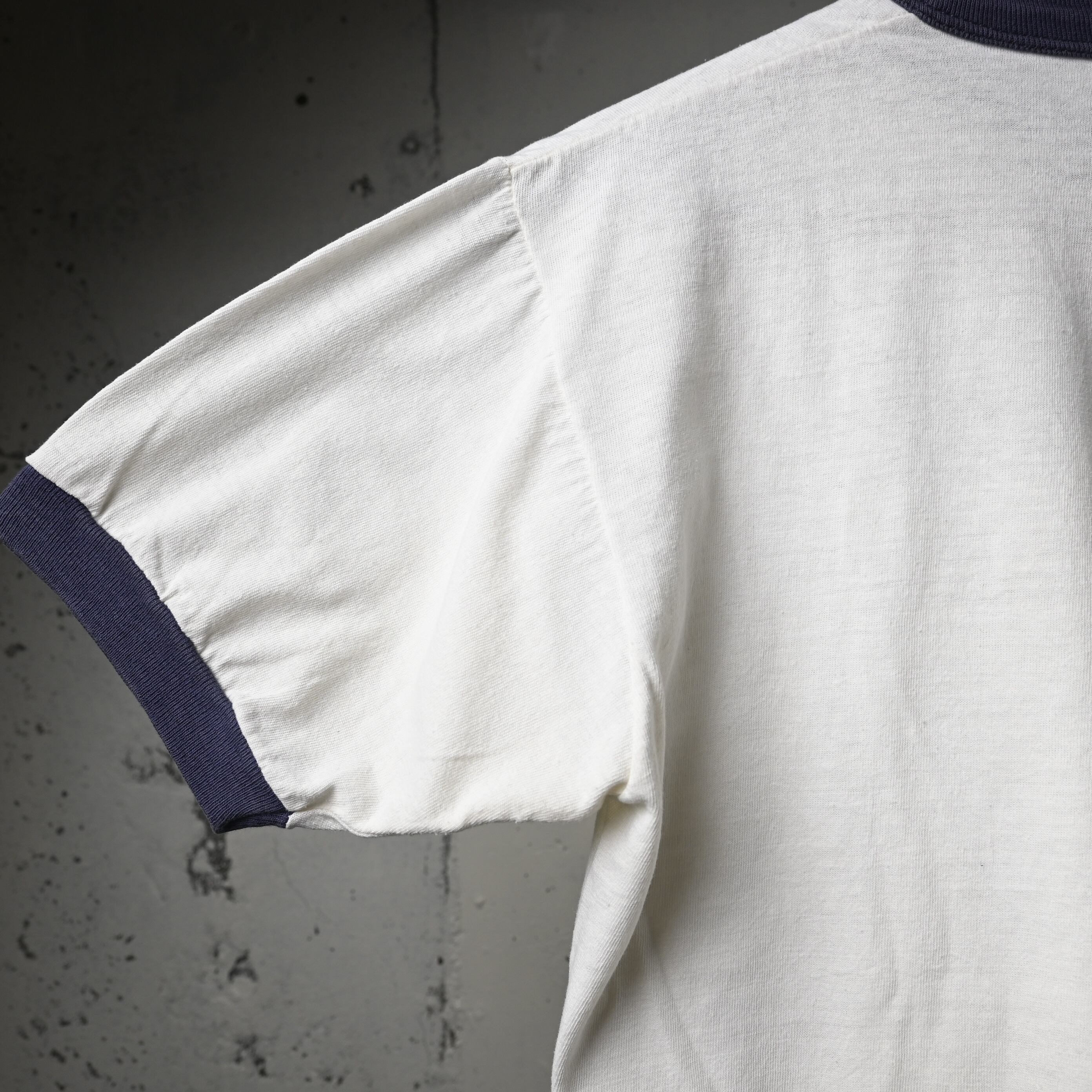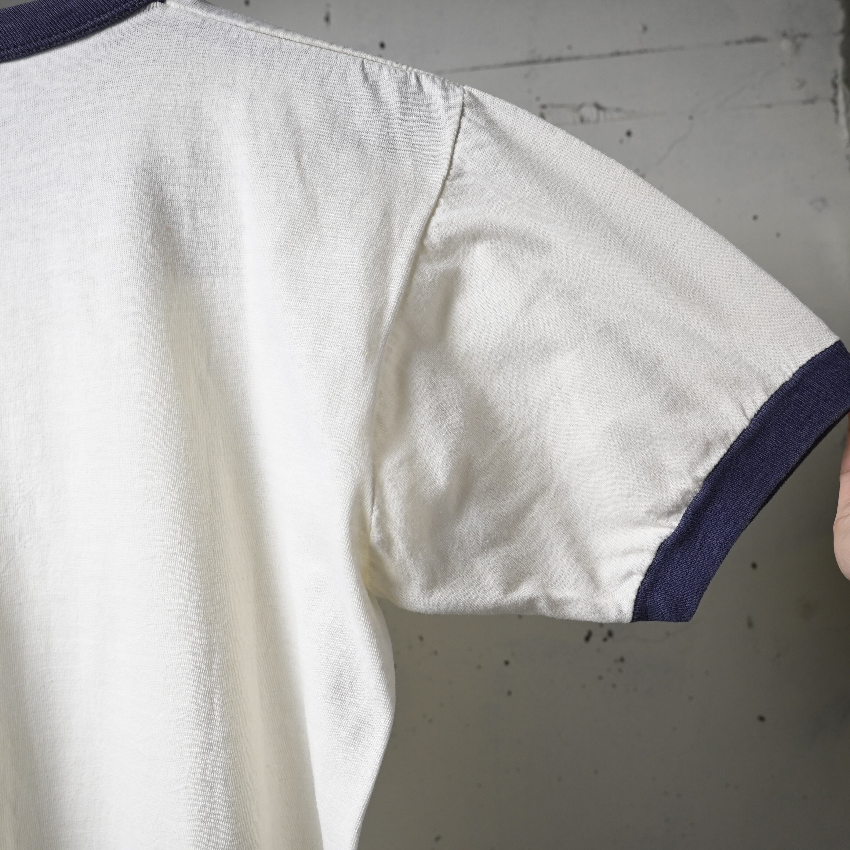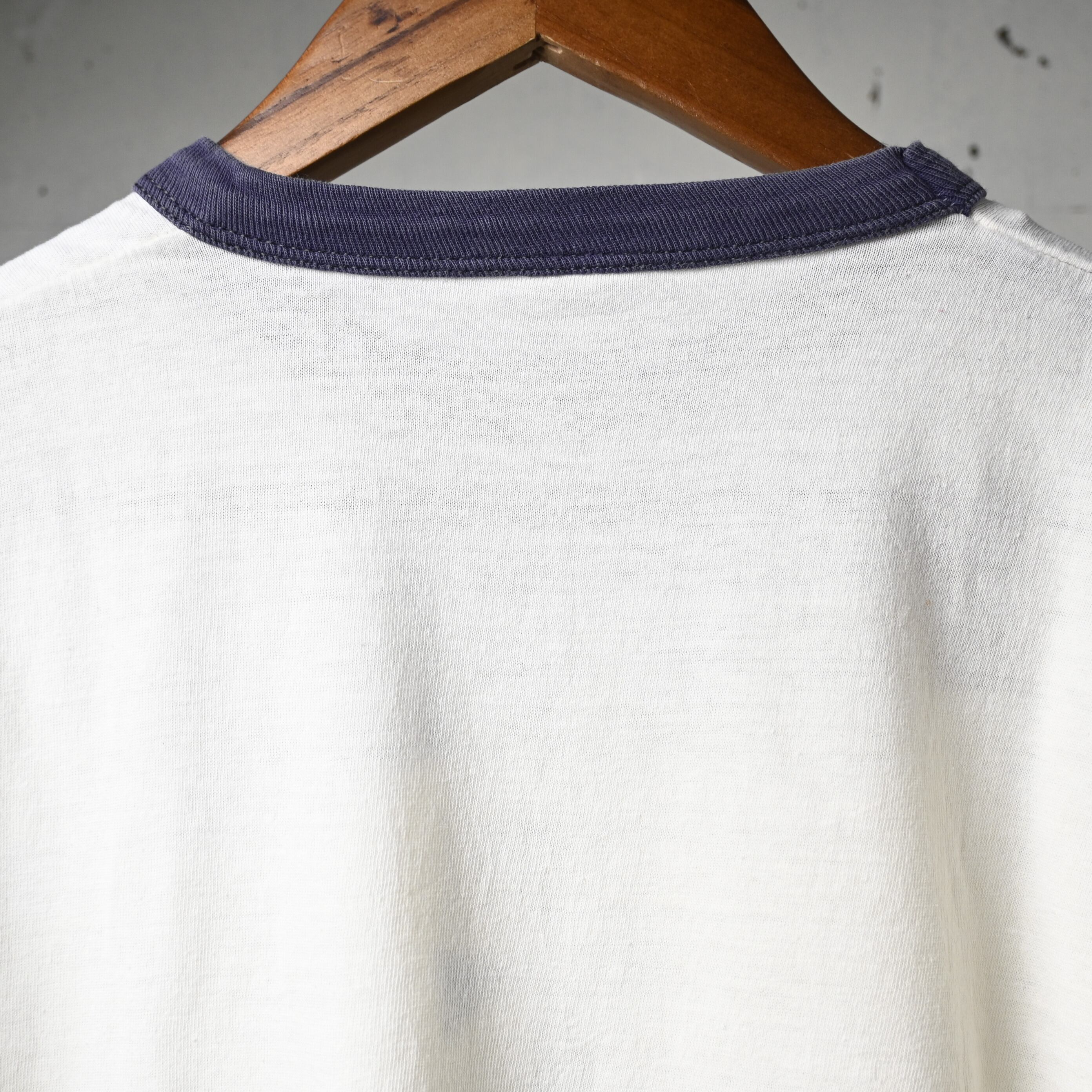 タグは欠損していますが、生地感や縫製、細めのバインダーネック仕様、ややコンパクトなシルエットからも70年代頃のリンガーTシャツらしいバランスです。コットン主体の柔らかなボディで着心地も良く、一枚で着てもインナー使いでも雰囲気が出る一着です。
