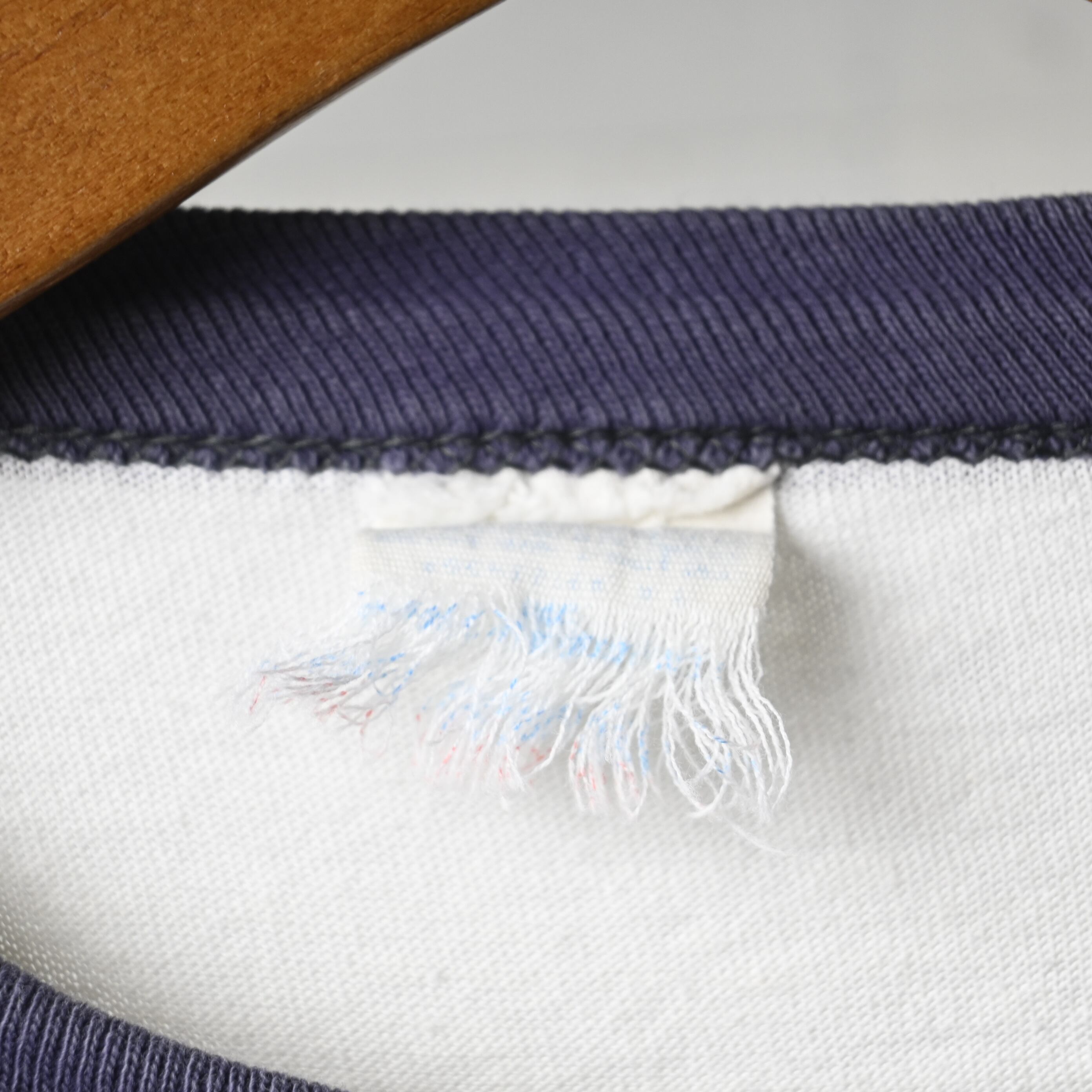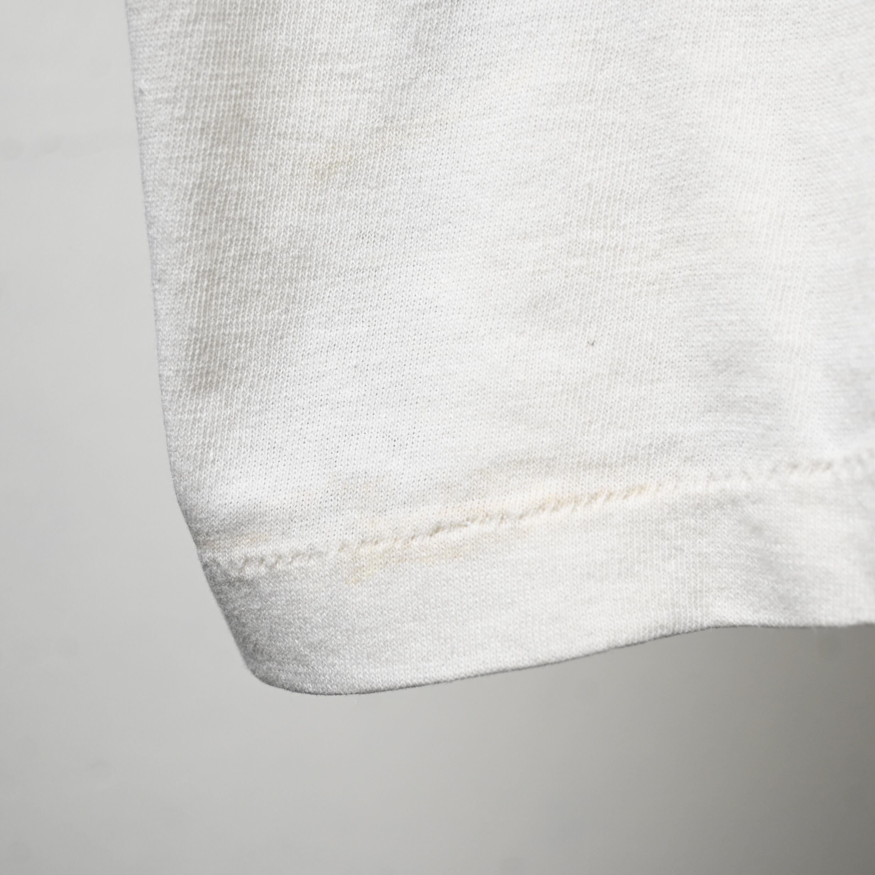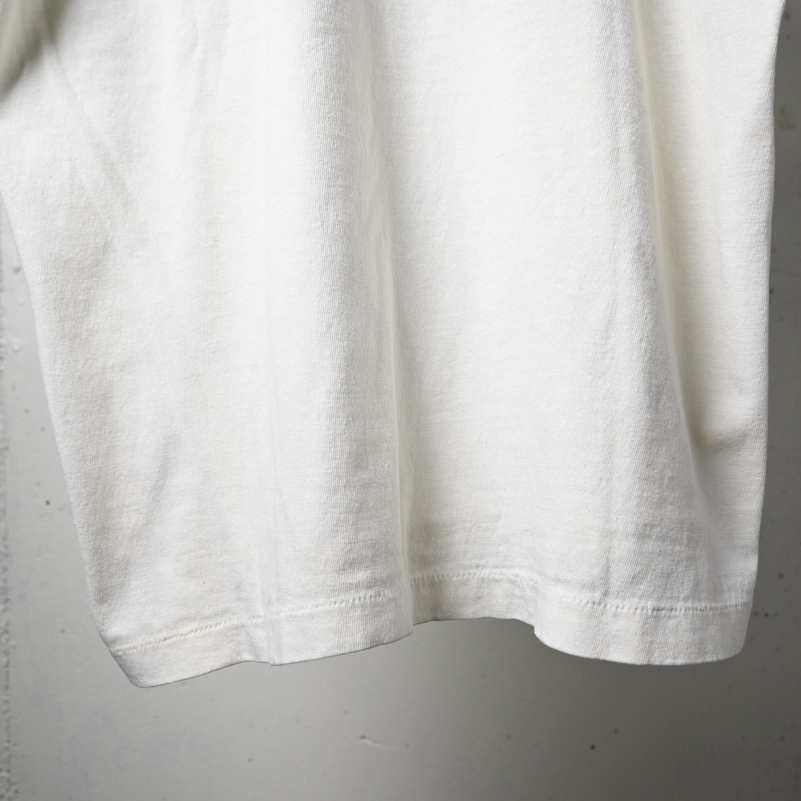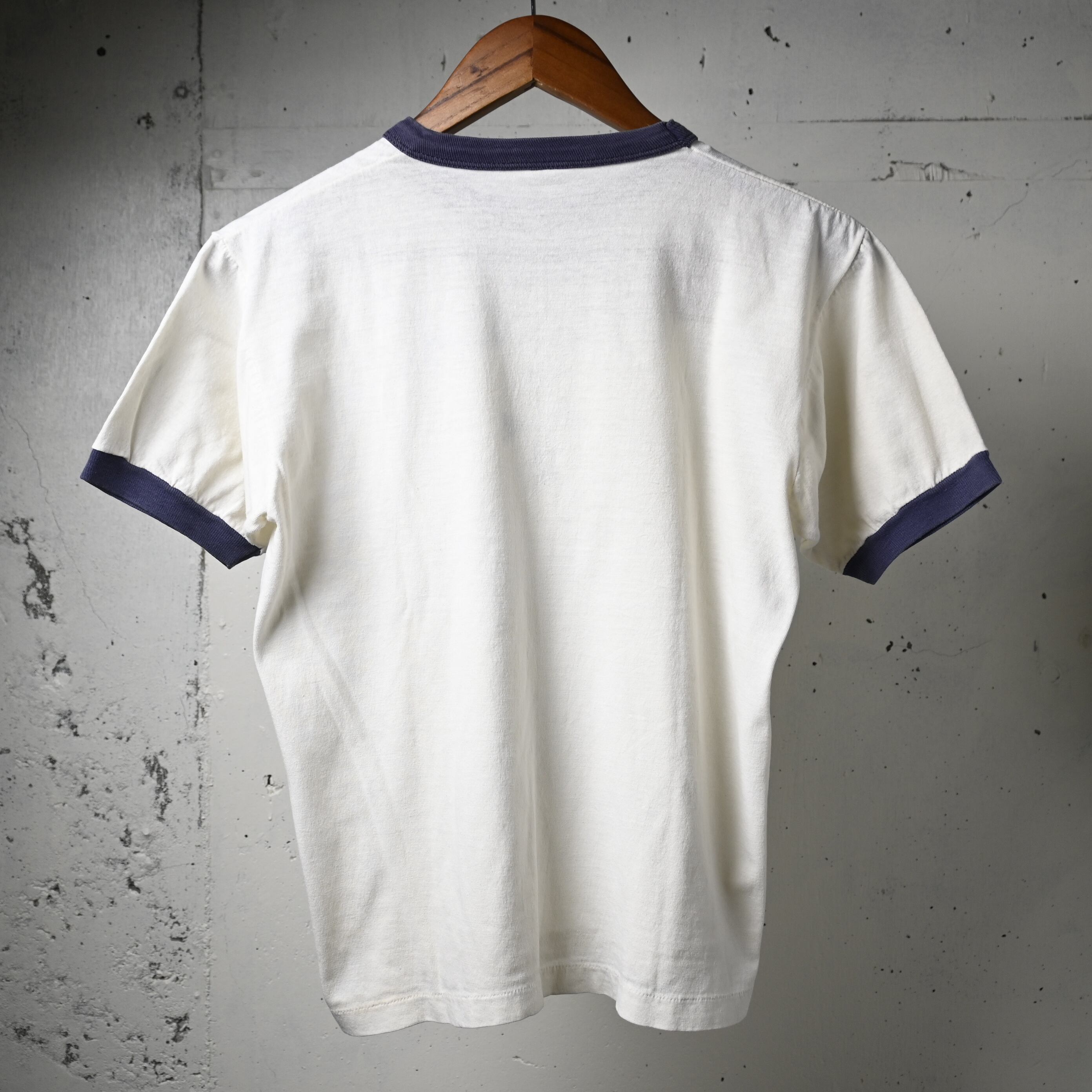 タグは欠損していますが、生地感や縫製、細めのバインダーネック仕様、ややコンパクトなシルエットからも70年代頃のリンガーTシャツらしいバランスです。コットン主体の柔らかなボディで着心地も良く、一枚で着てもインナー使いでも雰囲気が出る一着です。