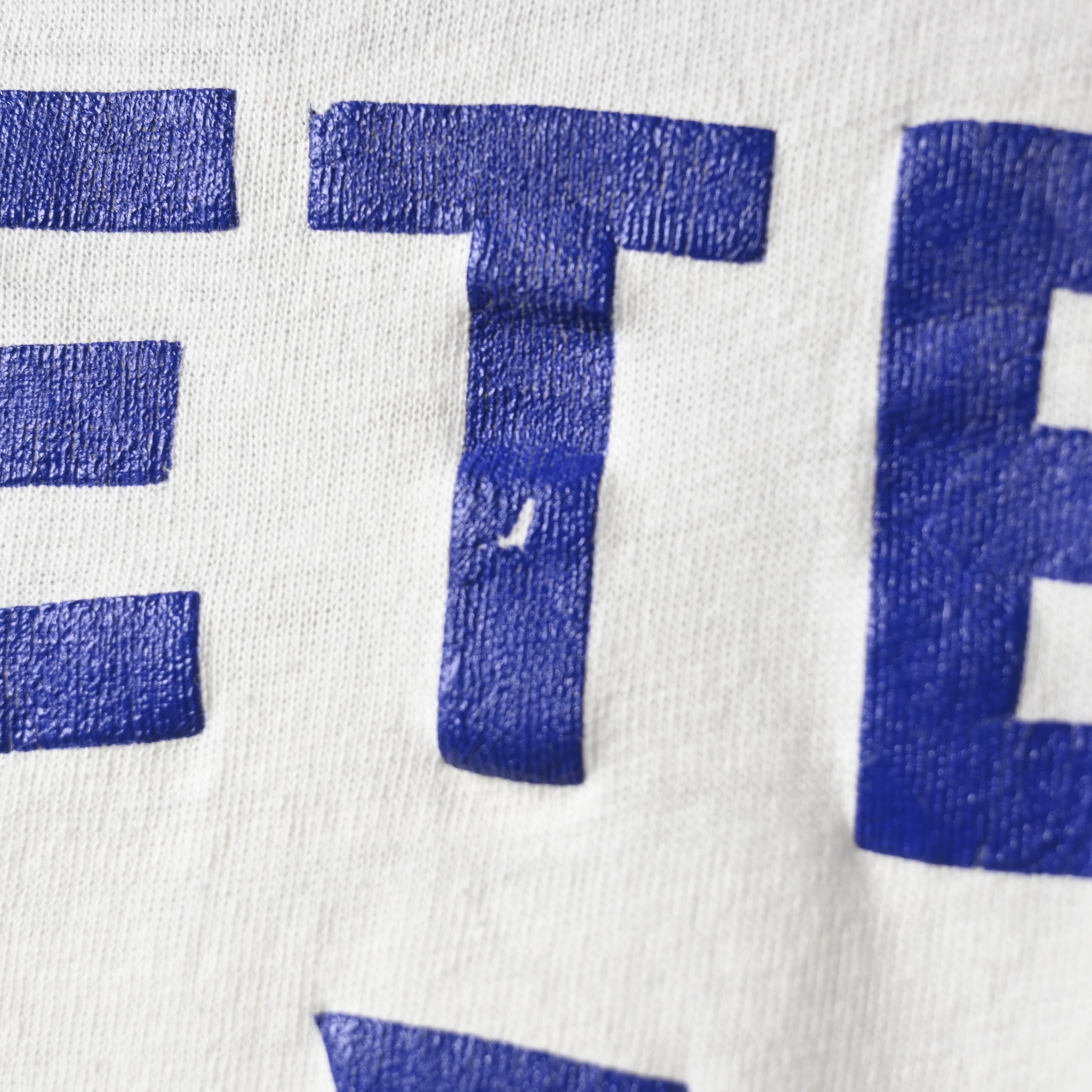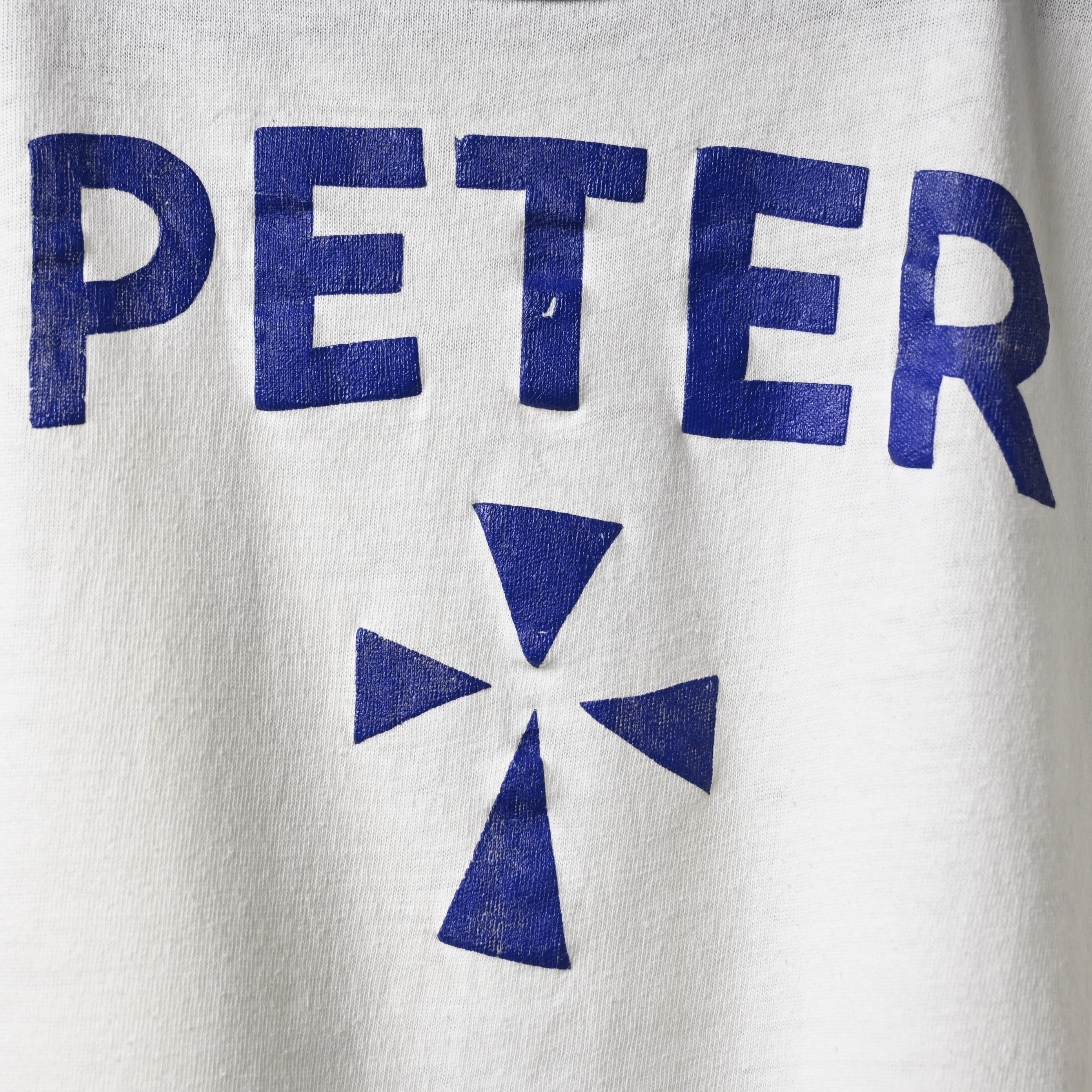 ホワイトボディにネイビーのネック・袖リブを合わせた王道の配色に、フロントには「PETER」のネームプリントとクロスモチーフを配置。古いラバープリント特有の少しひび割れた質感や擦れ感が、ヴィンテージらしい空気をしっかり感じさせてくれます。