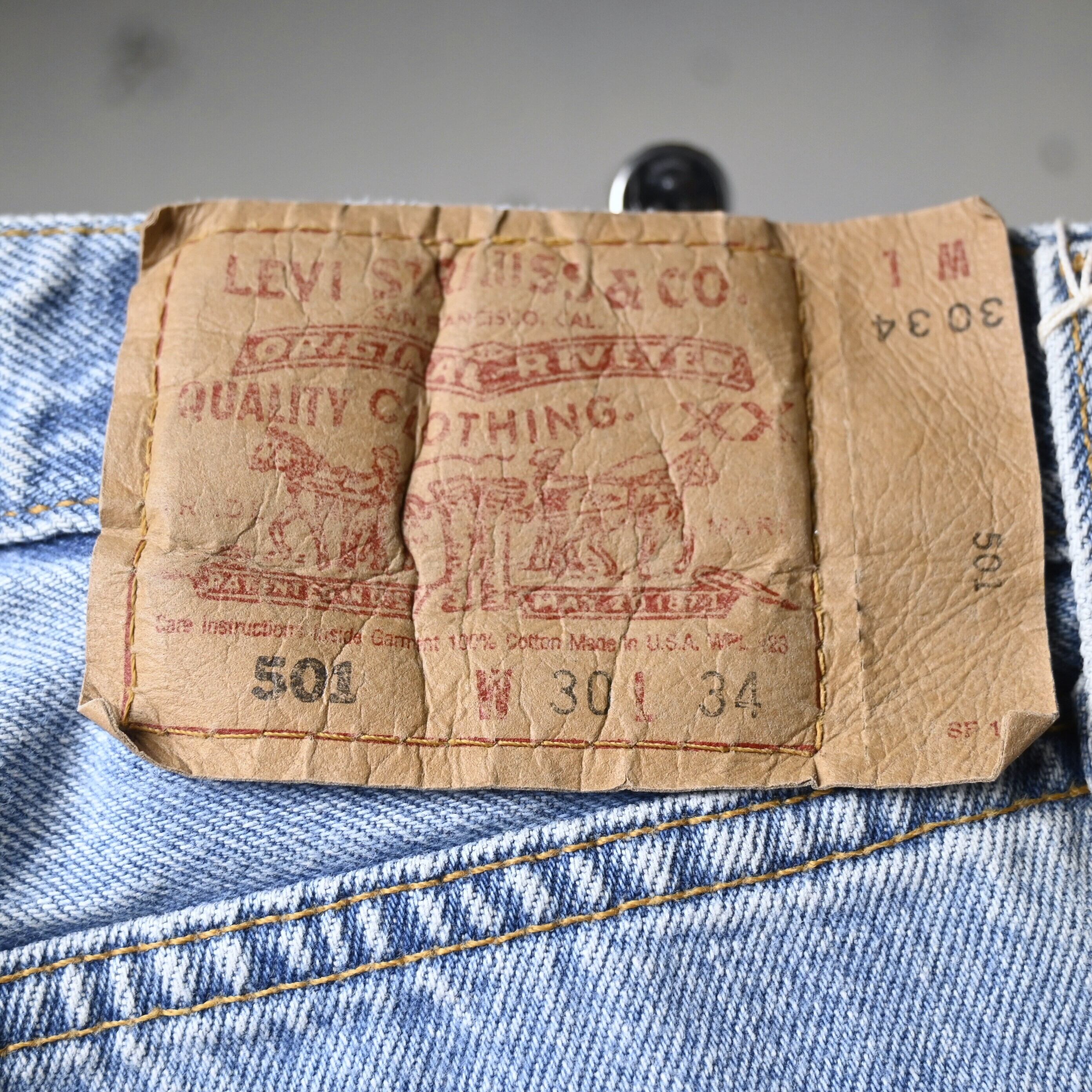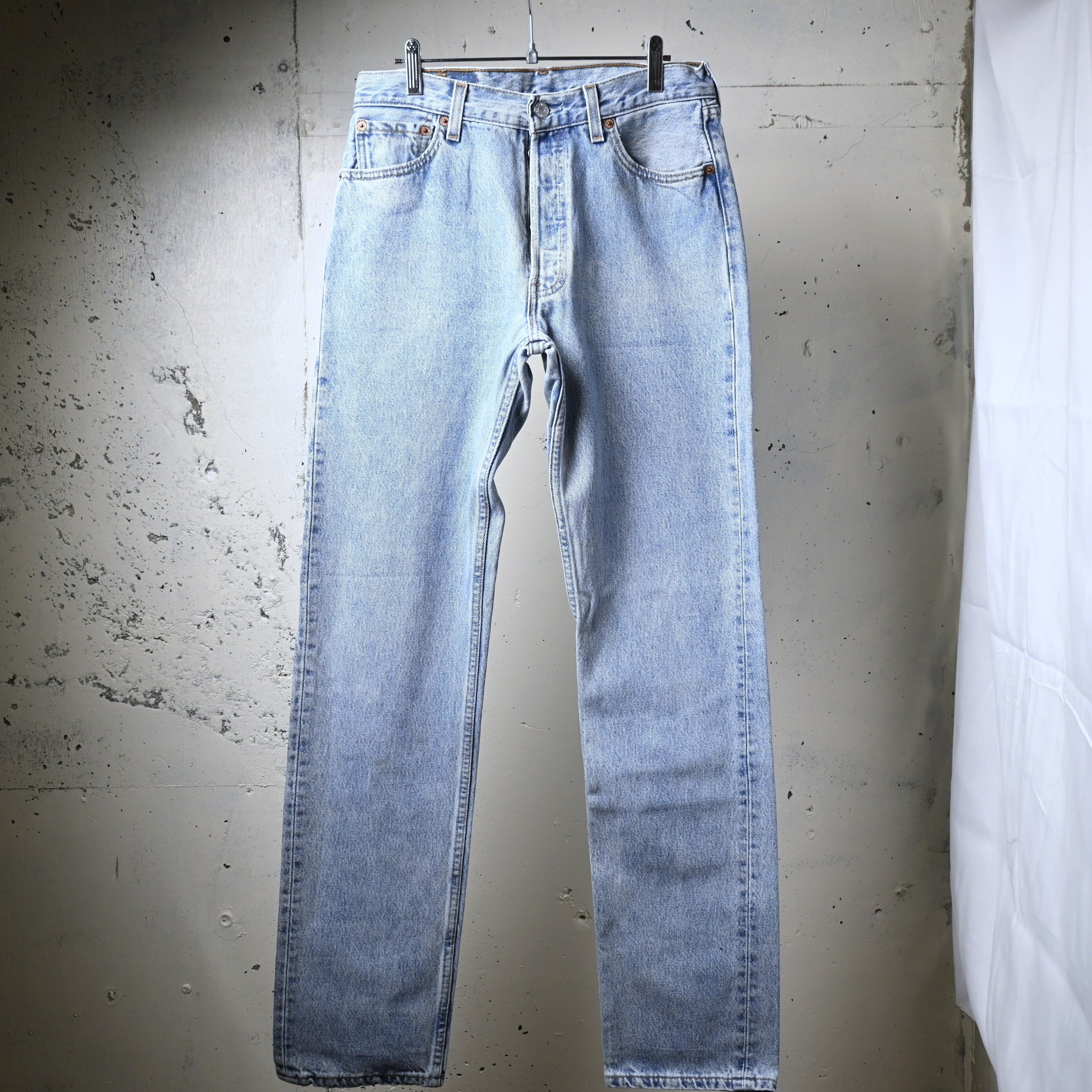 表記はW30L34ですが、実寸はW28L35程度。腰まわりはすっきりとしながら、501らしいストレートラインが綺麗に出るシルエットで、細身のトップスからゆるめのシャツまで幅広く合わせやすいバランスです。長めのレングスを活かして裾にワンクッションつけても雰囲気よくまとまります。