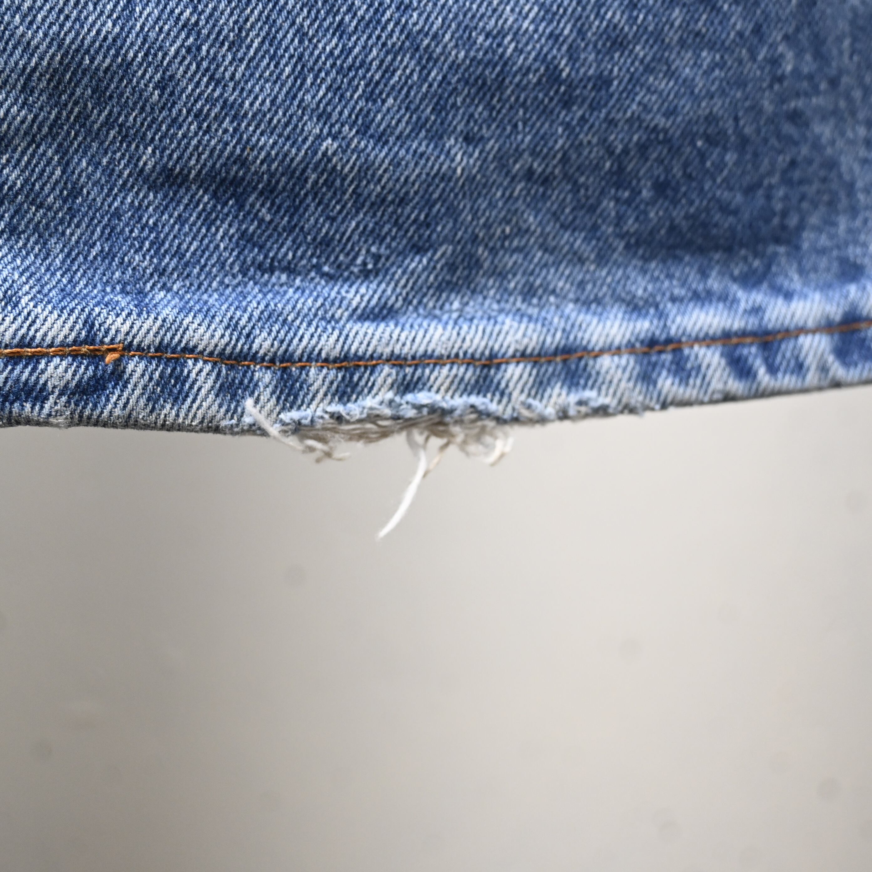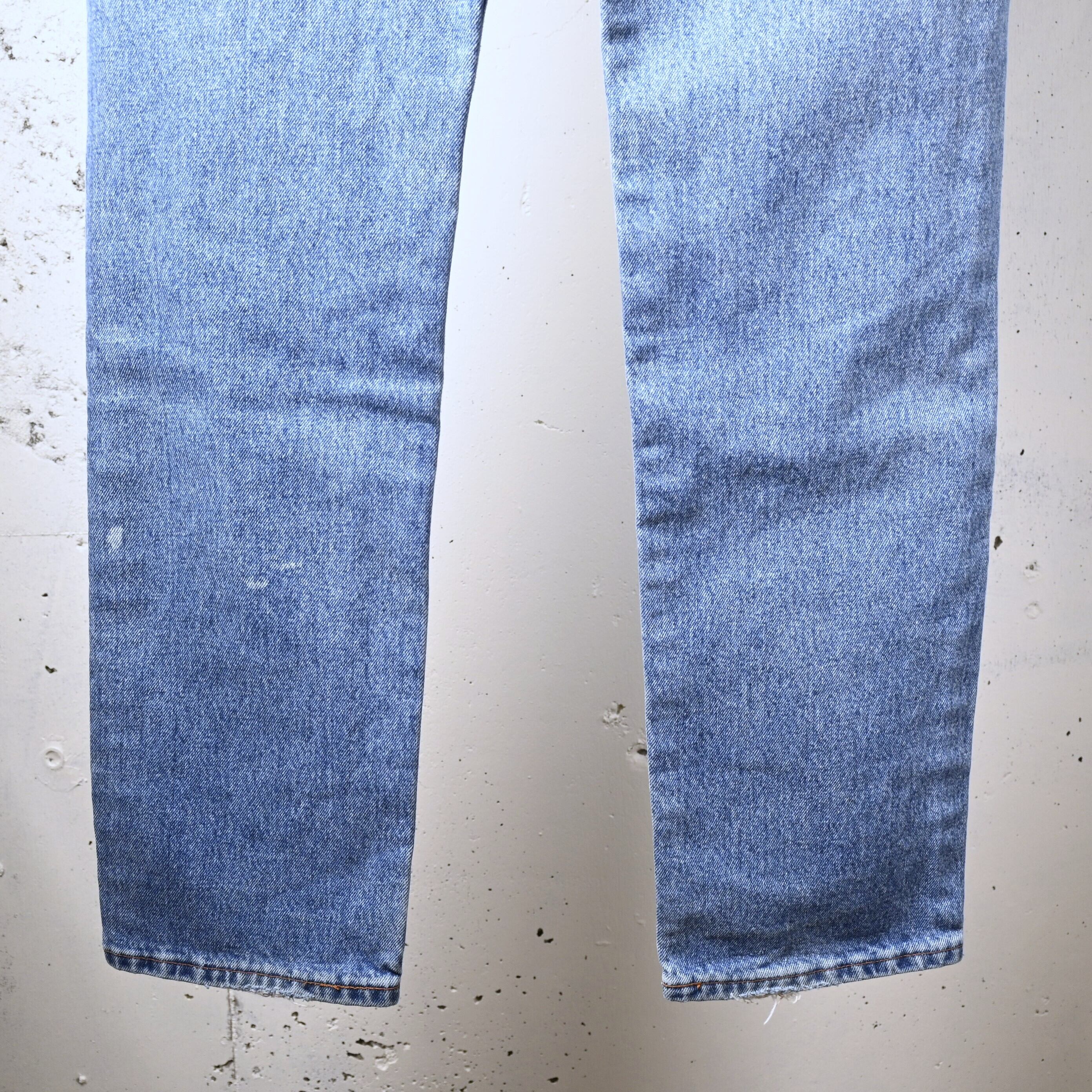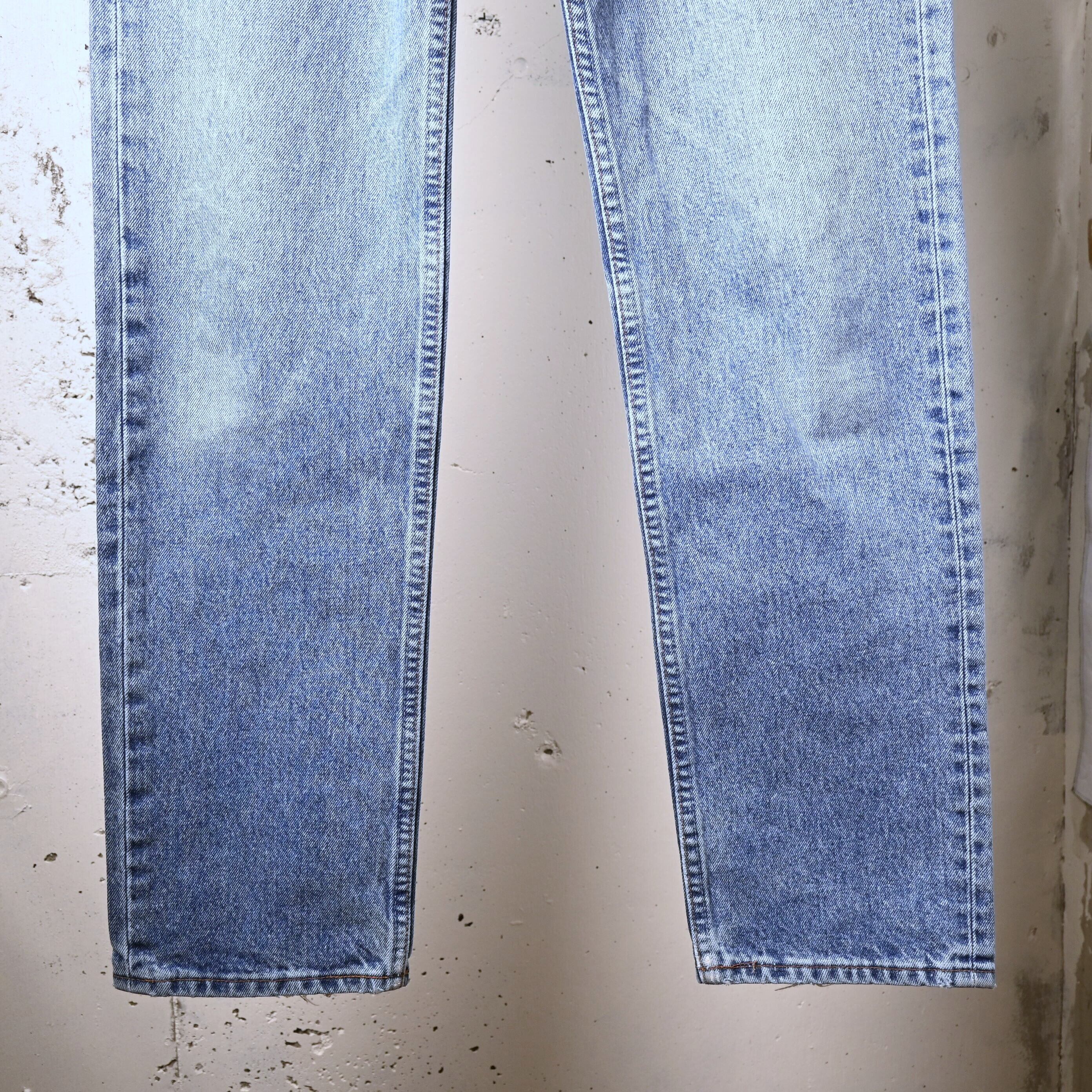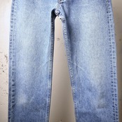 こちらは1997年USA製の一本。アメリカ生産終了前の90年代後半らしい個体で、現行とは異なるしっかりした生地感と、穿き込まれたことで生まれる自然なフェードが魅力です。全体は淡いブルーへと色落ちし、腿から裾にかけて柔らかく入った色のグラデーションが非常に雰囲気良くまとまっています。