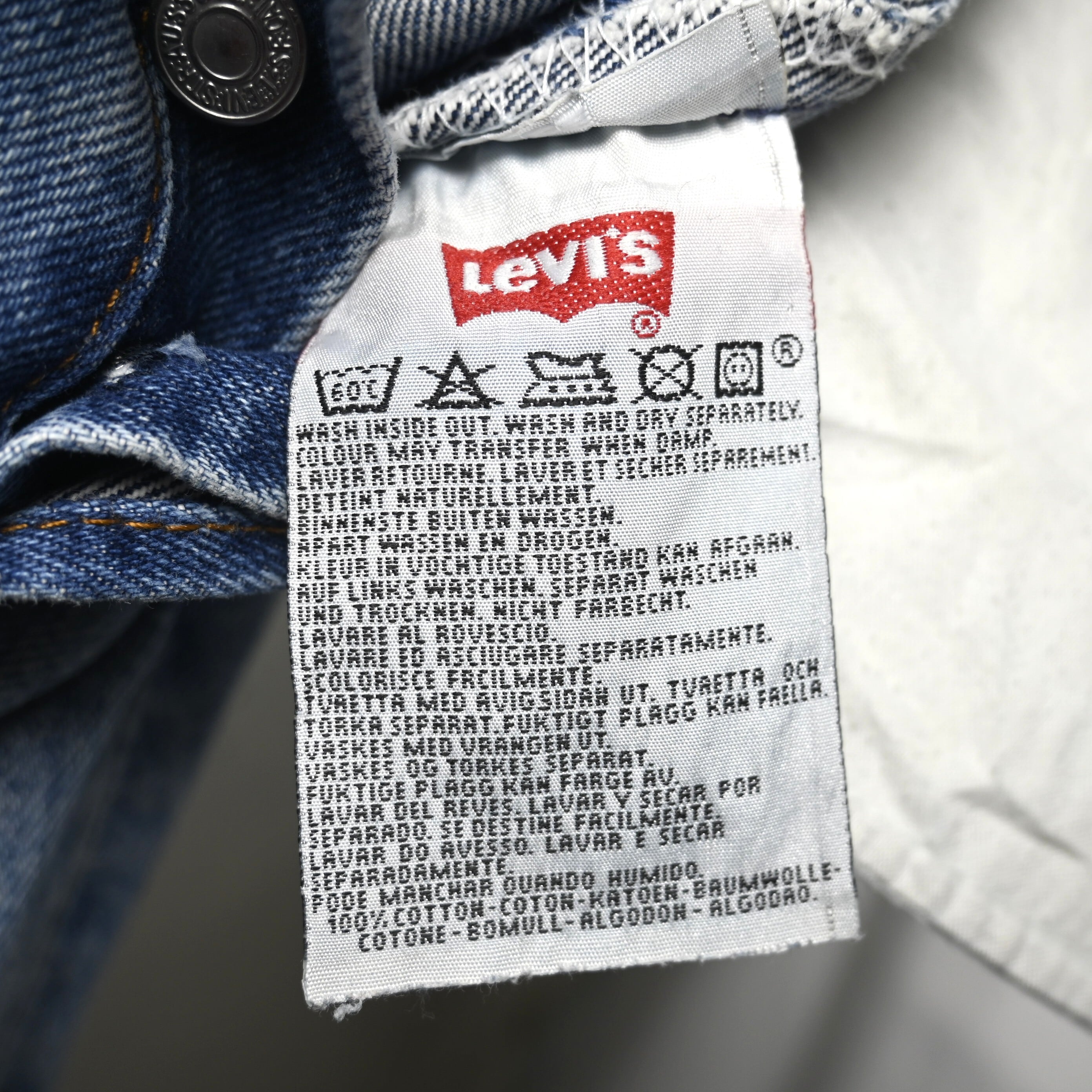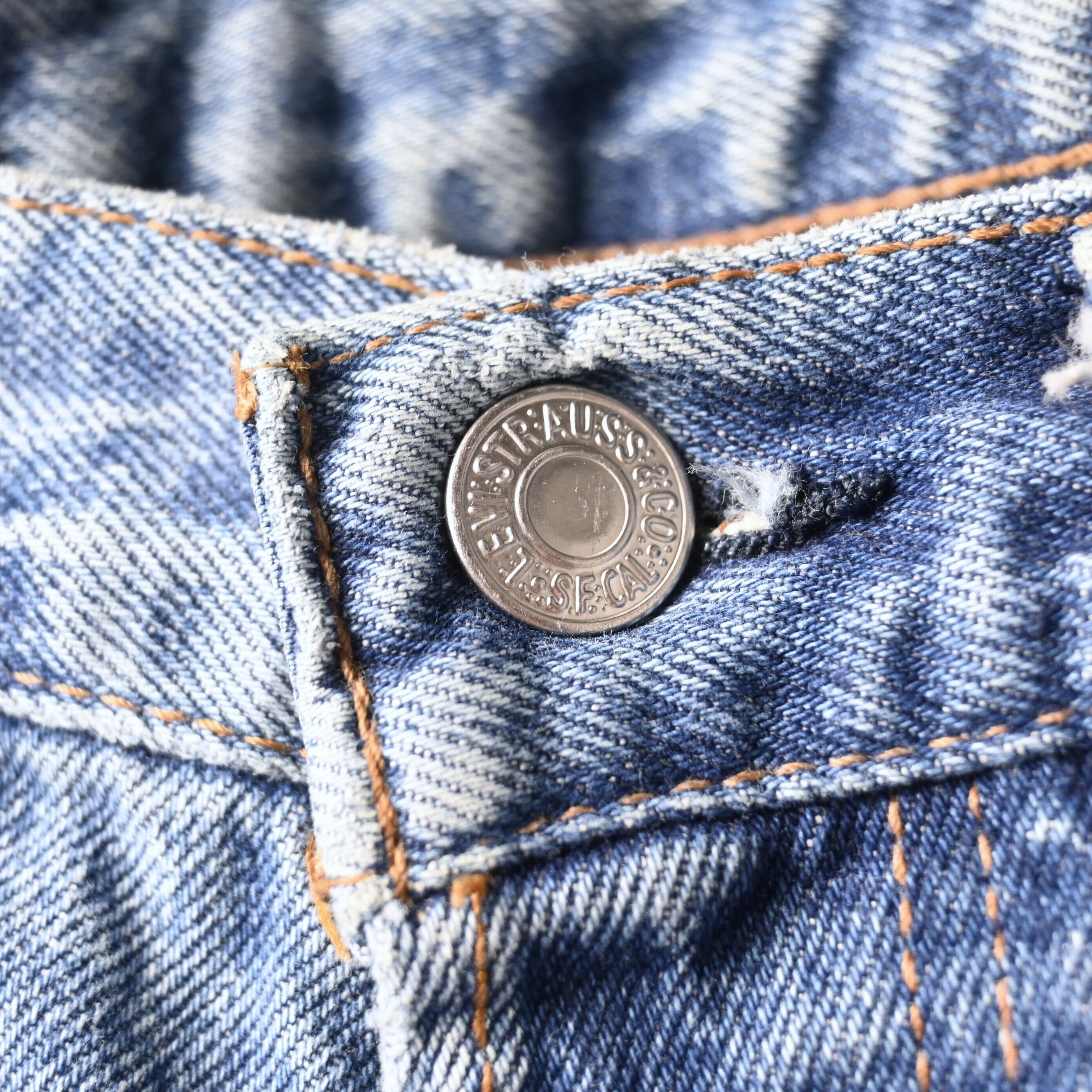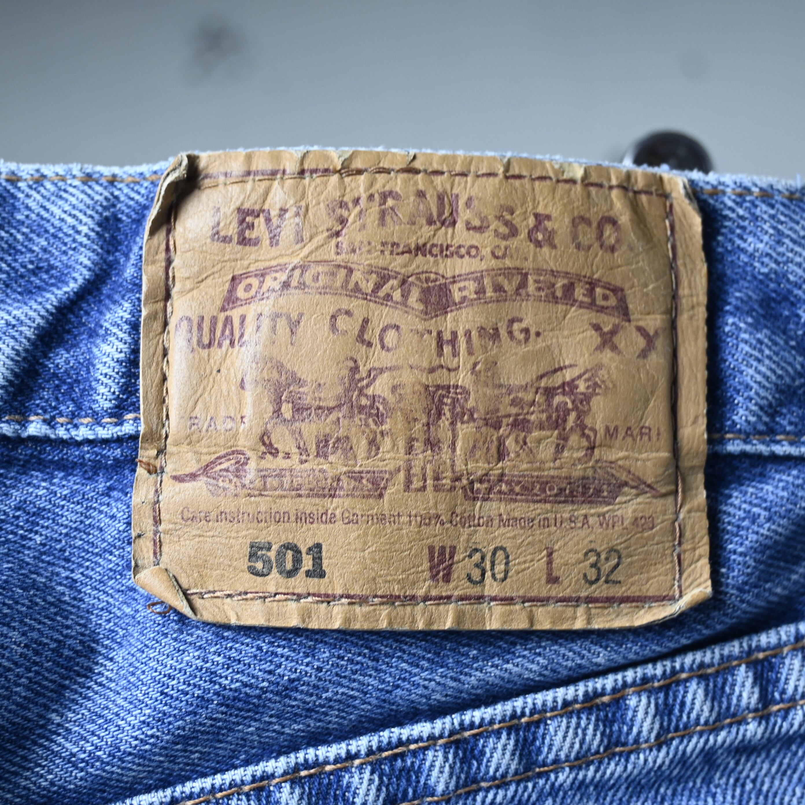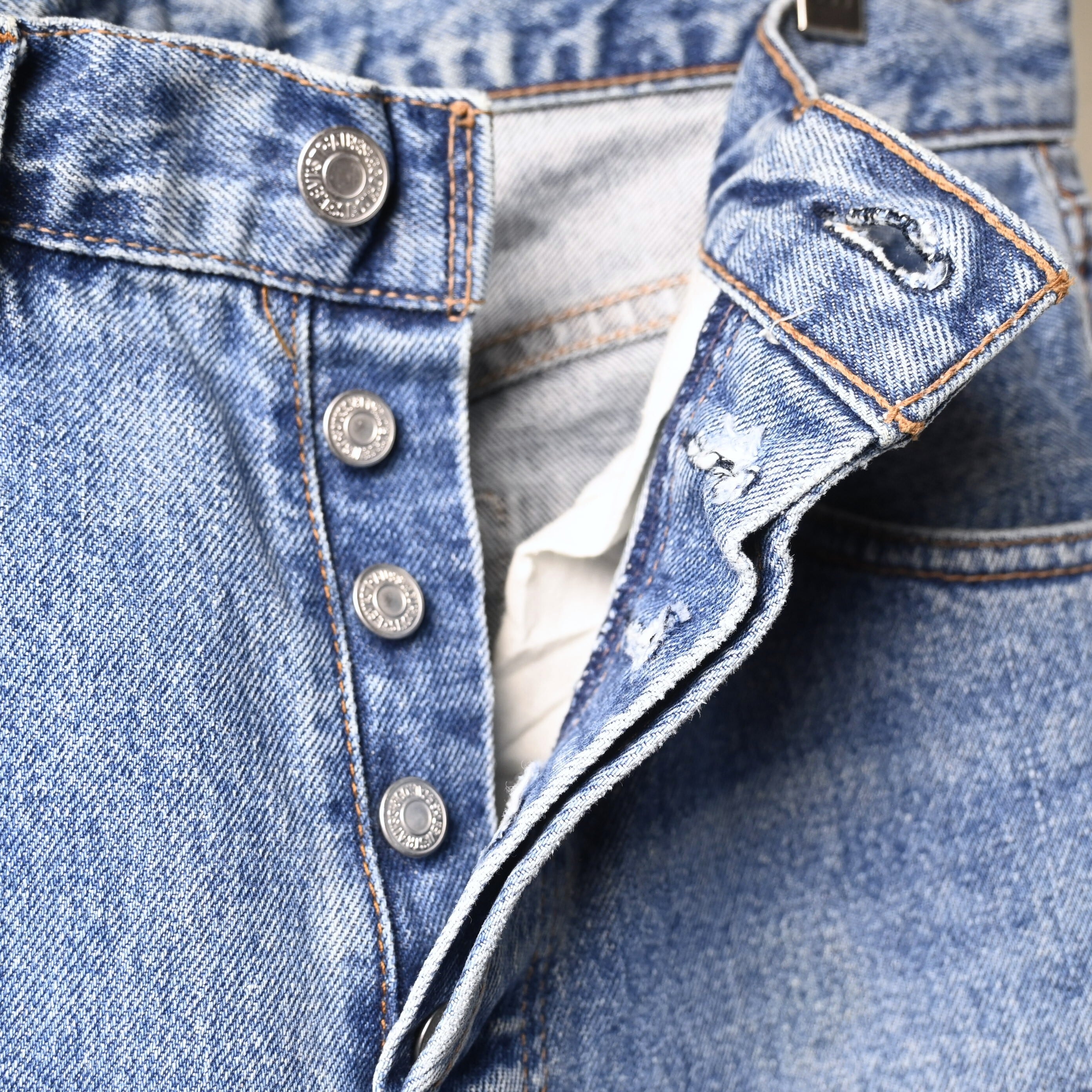 こちらは1997年USA製の一本。アメリカ生産終了前の90年代後半らしい個体で、現行とは異なるしっかりした生地感と、穿き込まれたことで生まれる自然なフェードが魅力です。全体は淡いブルーへと色落ちし、腿から裾にかけて柔らかく入った色のグラデーションが非常に雰囲気良くまとまっています。