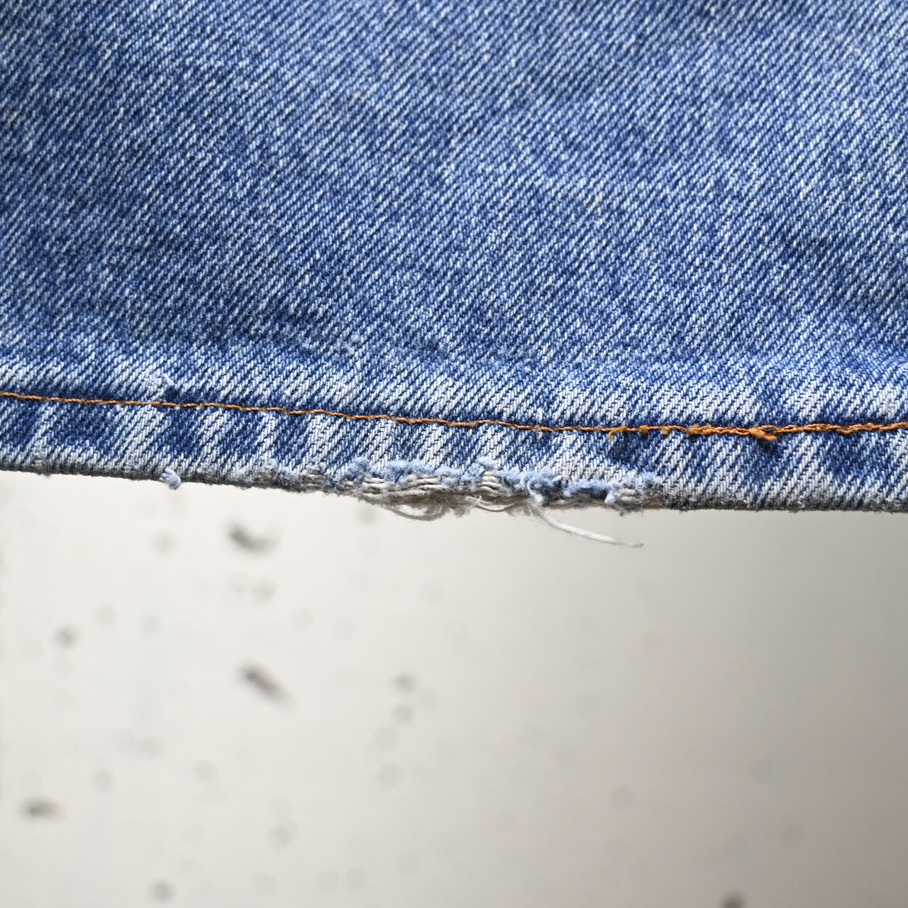 全体に色落ち・着用に伴う使用感があります。左後ろの裾付近にごく小さな薄汚れがありますが、目立つダメージはなく着用に問題のないコンディションです。