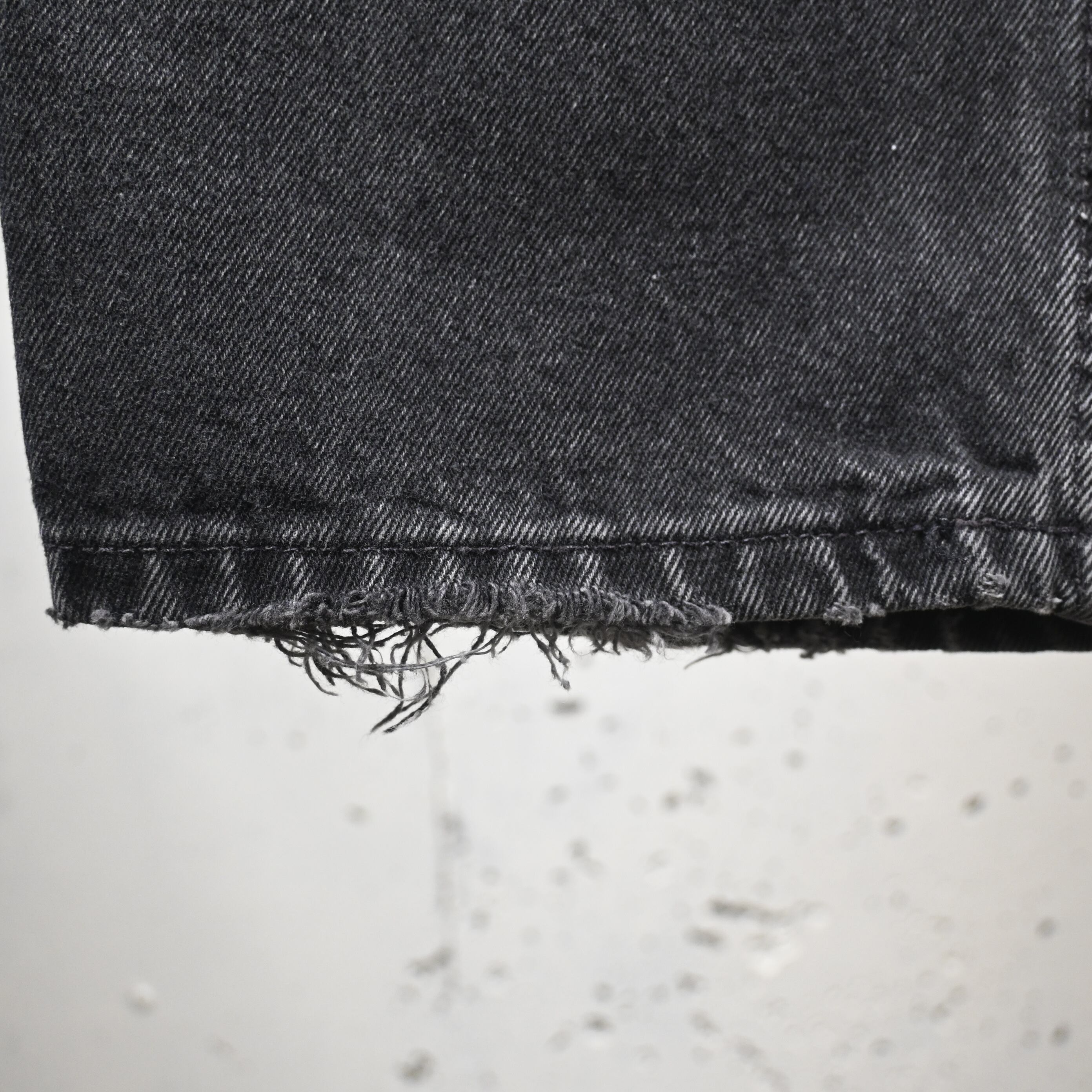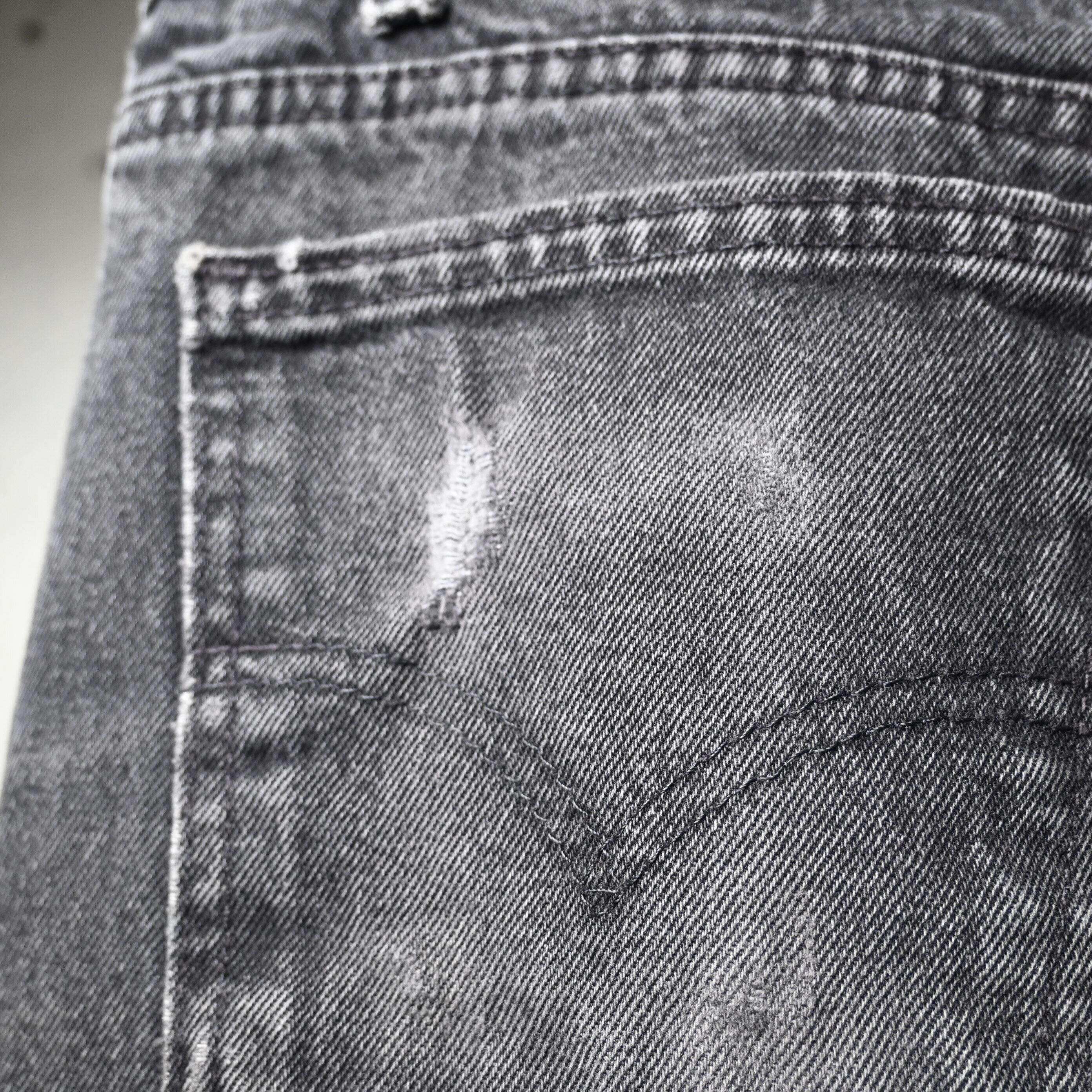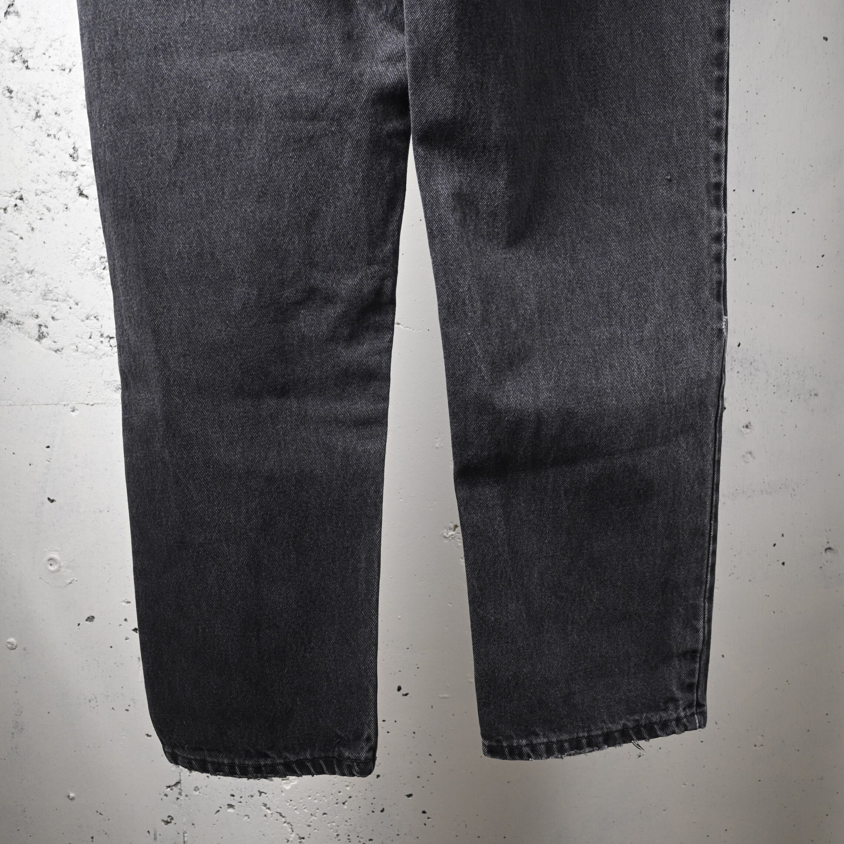 1990年代アメリカ製らしいしっかりしたコットン100%デニム生地を使用しており、履き込まれたことで生まれたアタリやポケット周辺の色落ちも自然で、古着ならではの表情が楽しめます。裾はカットオフに近いラフな仕上がりで、ブラックデニムの無骨さに軽さを加えたバランスも魅力です。