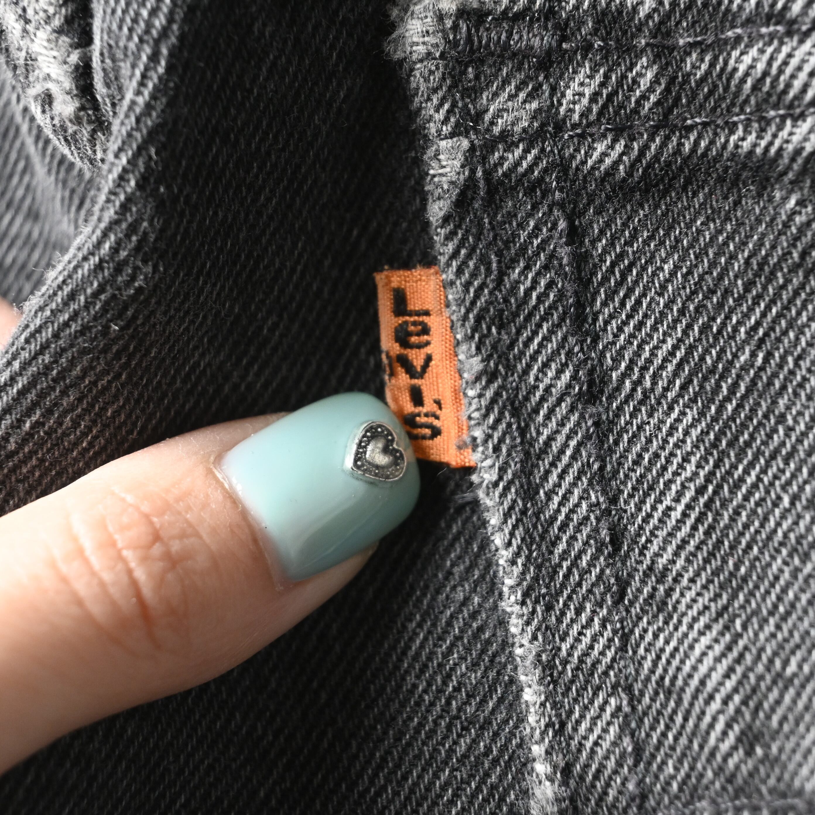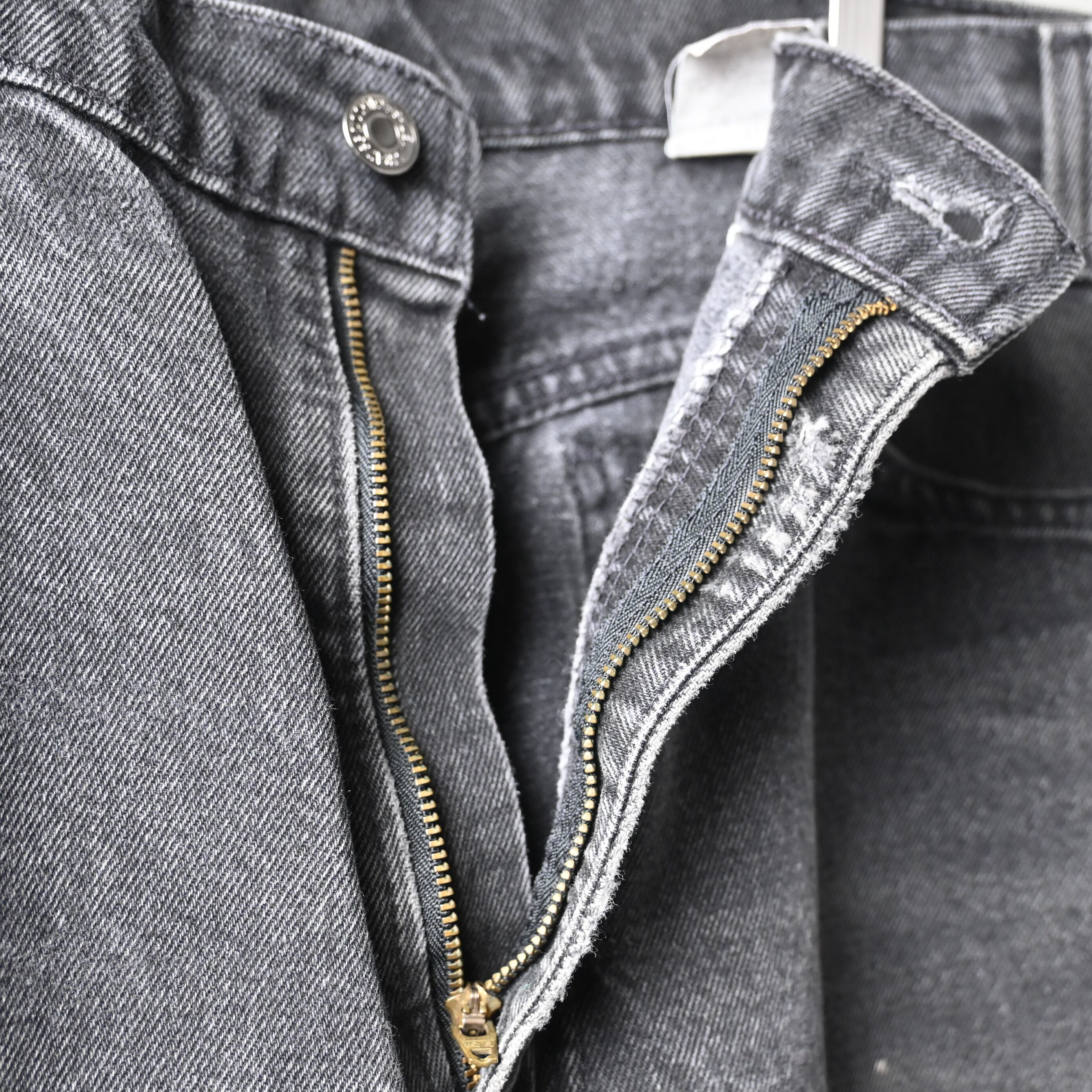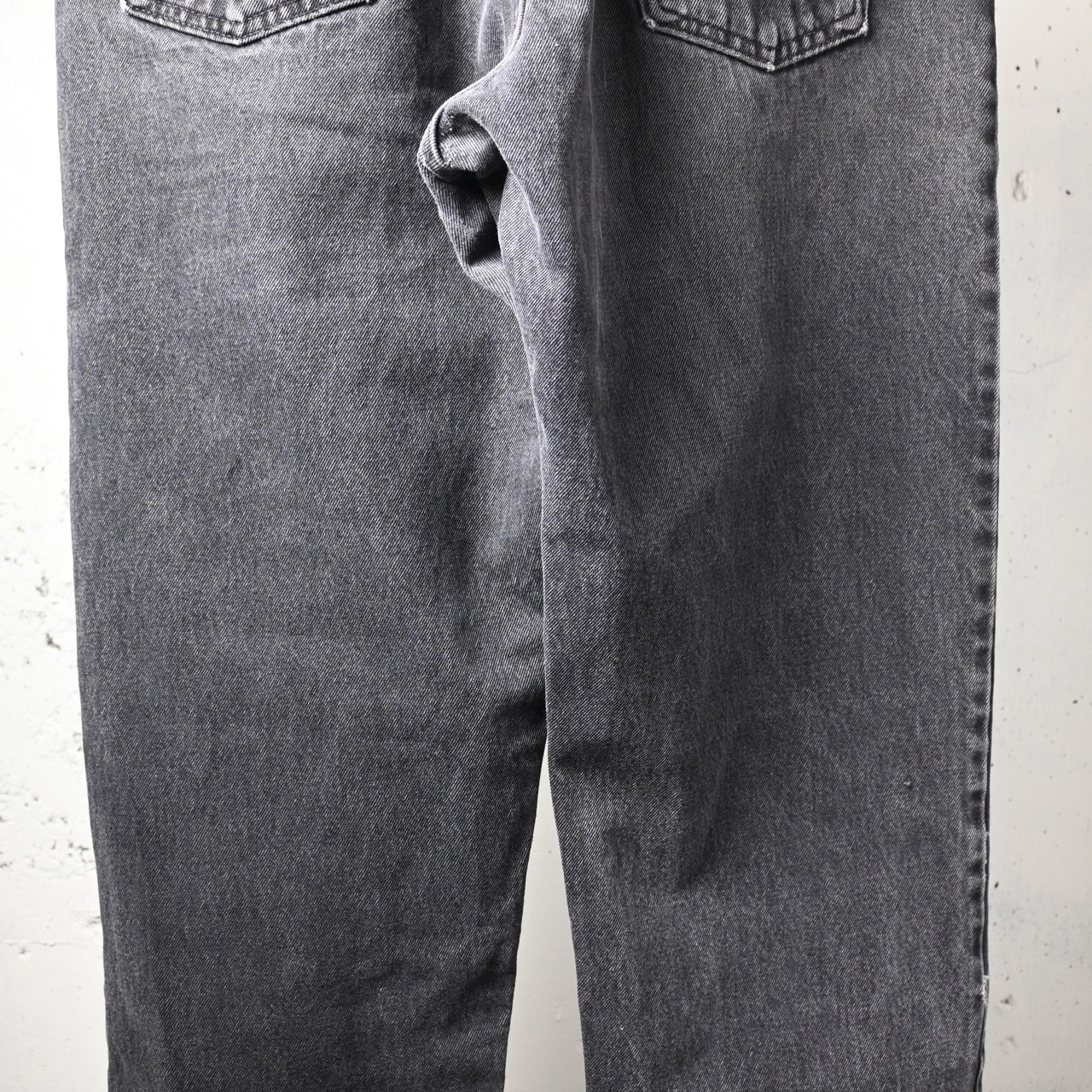 1990年代アメリカ製らしいしっかりしたコットン100%デニム生地を使用しており、履き込まれたことで生まれたアタリやポケット周辺の色落ちも自然で、古着ならではの表情が楽しめます。裾はカットオフに近いラフな仕上がりで、ブラックデニムの無骨さに軽さを加えたバランスも魅力です。