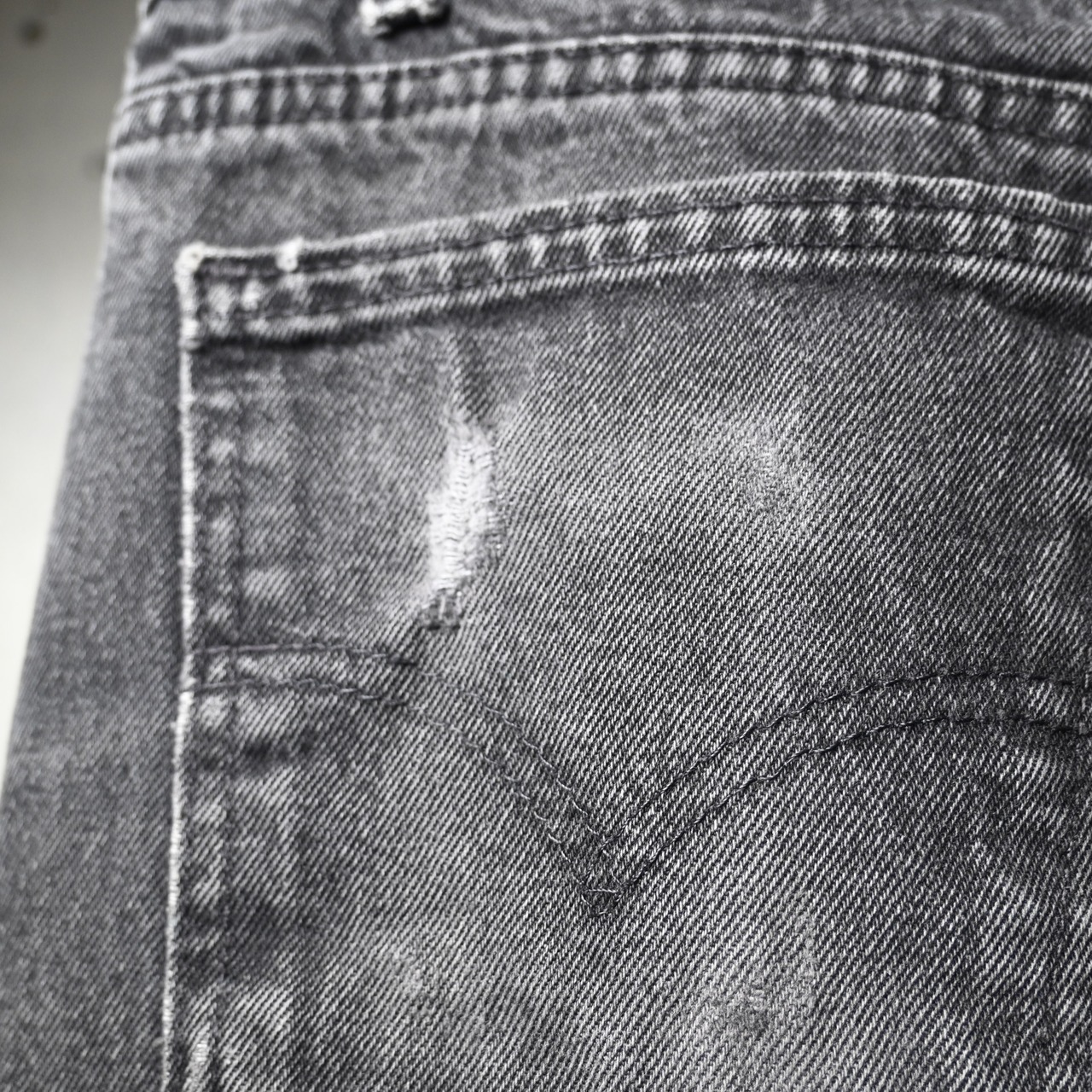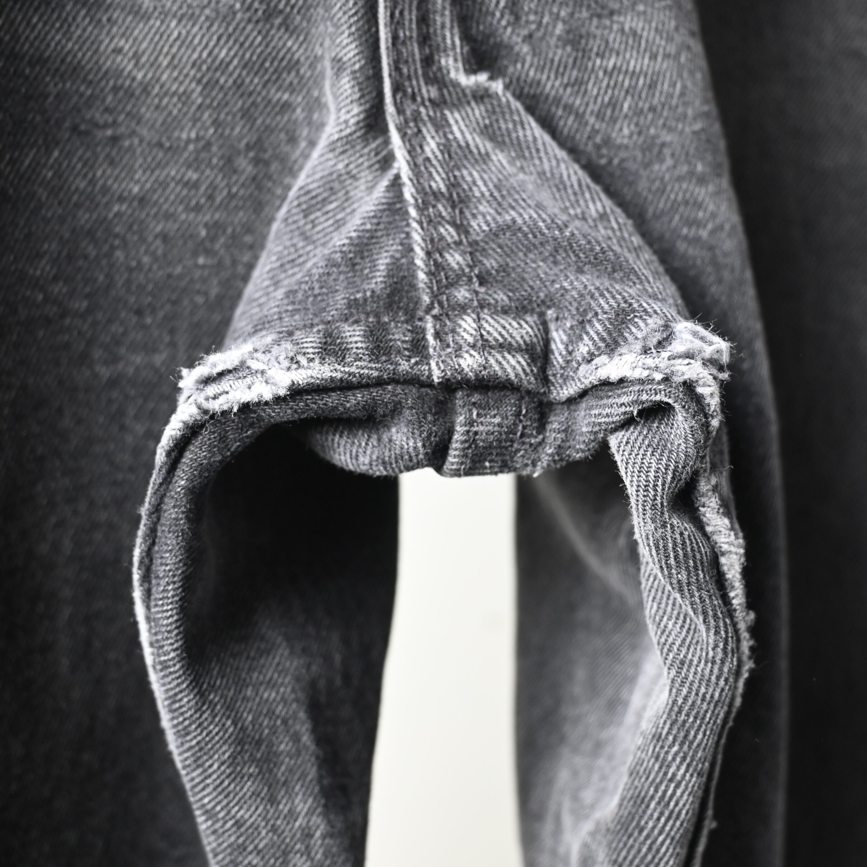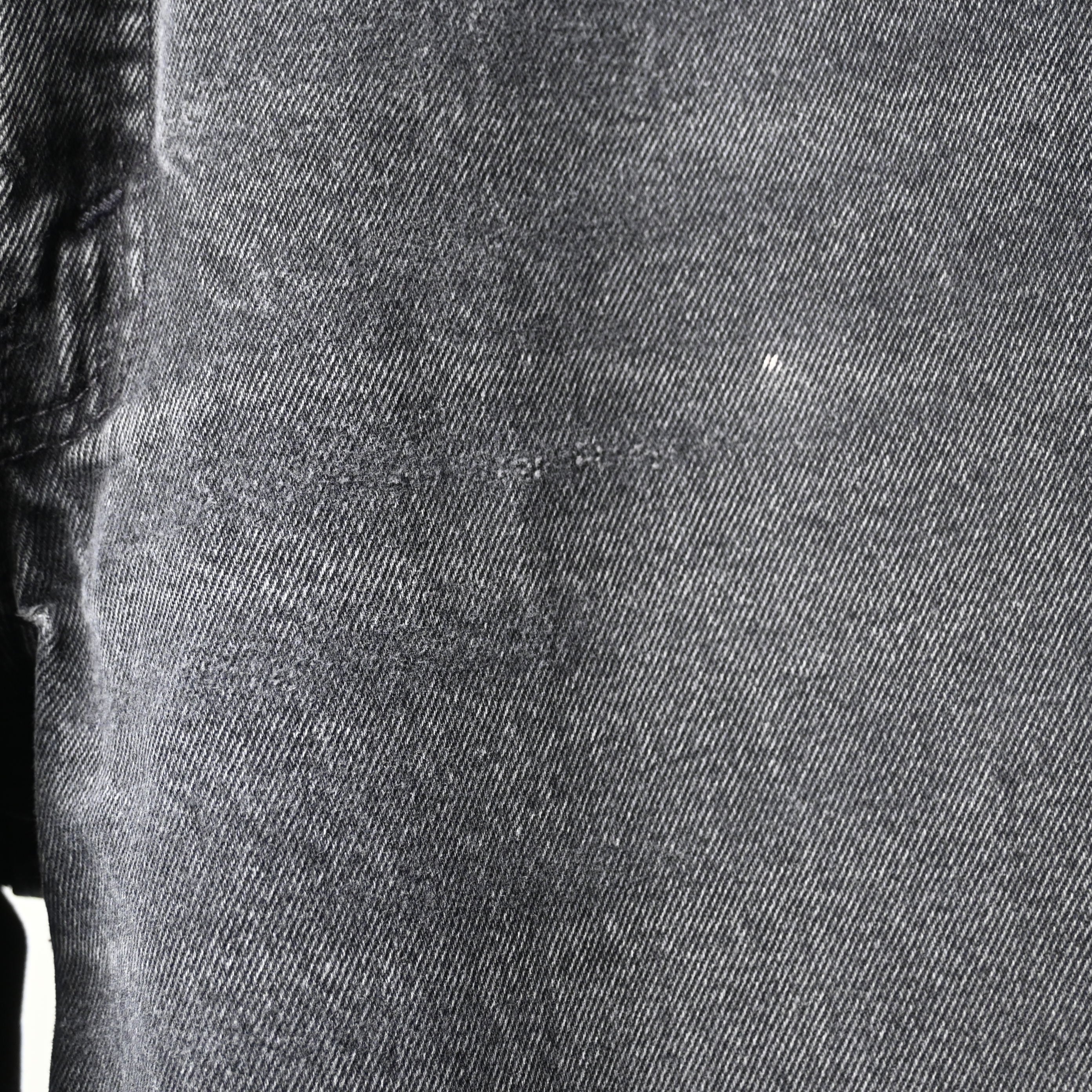 股内側に擦れ、裾に擦れ・ほつれあり。バックポケット付近に小さなダメージ、全体にフェードや着用感がありますが、ブラックデニム特有の経年変化として良い雰囲気に仕上がっています。