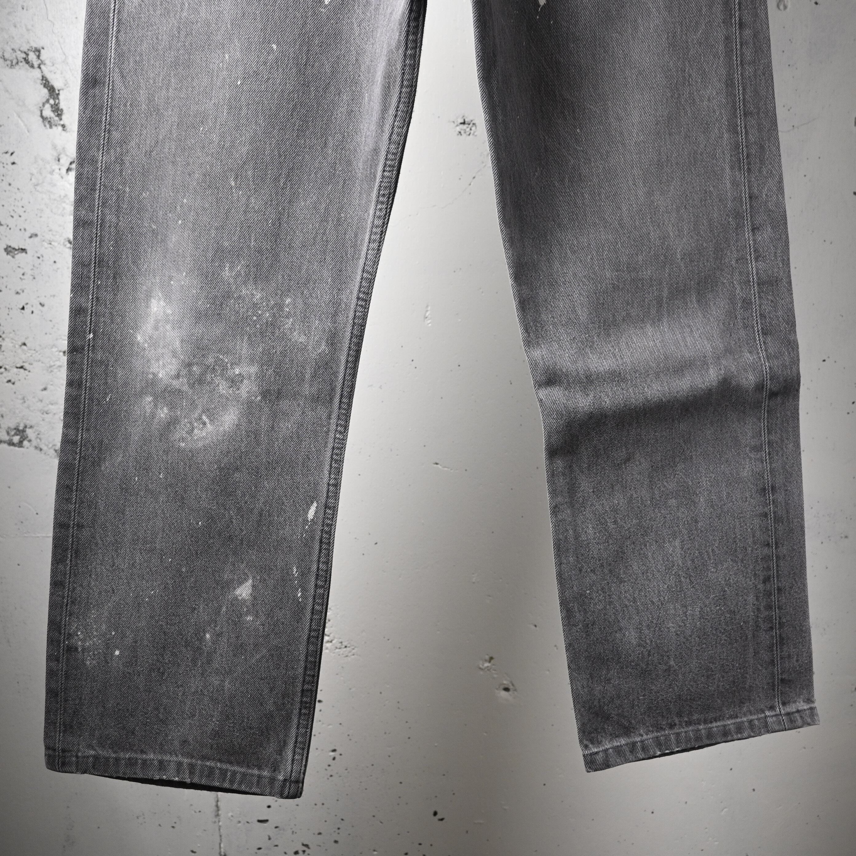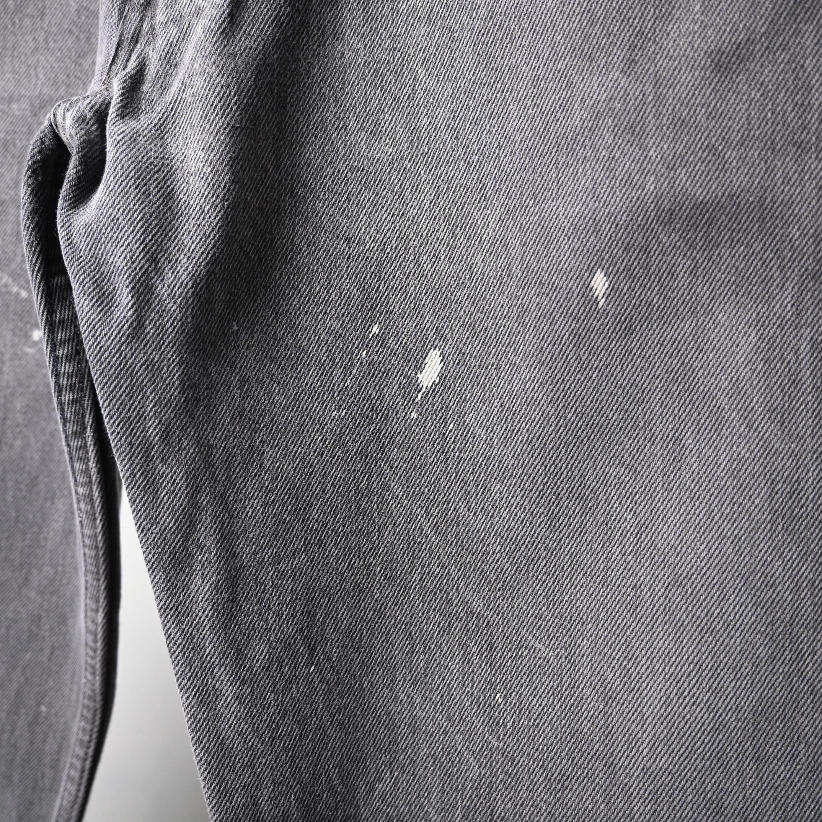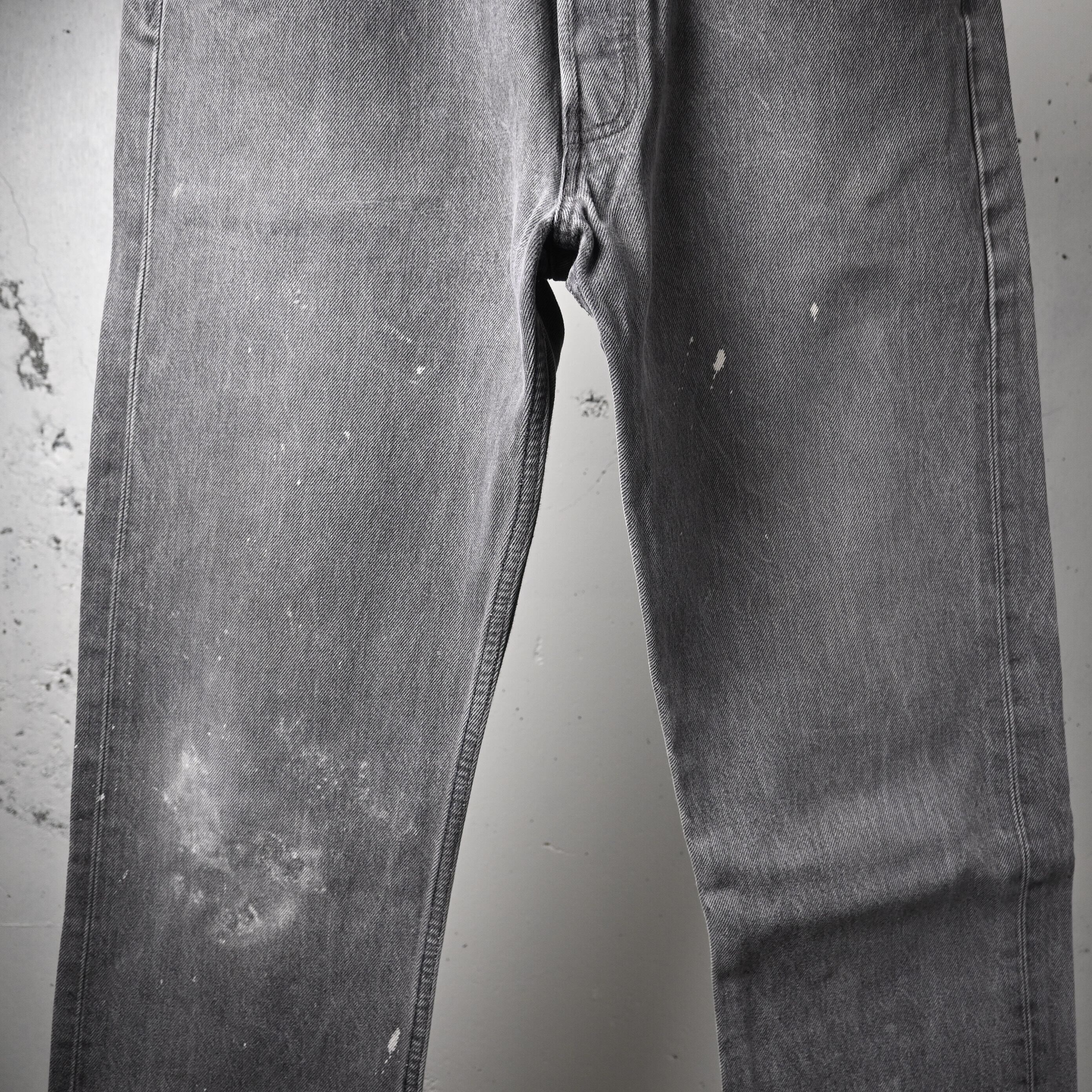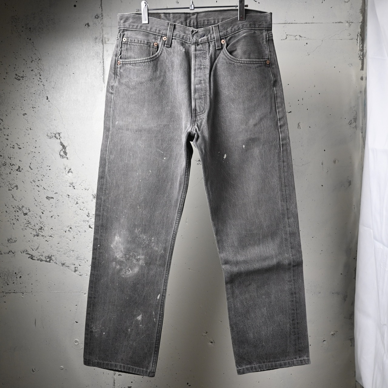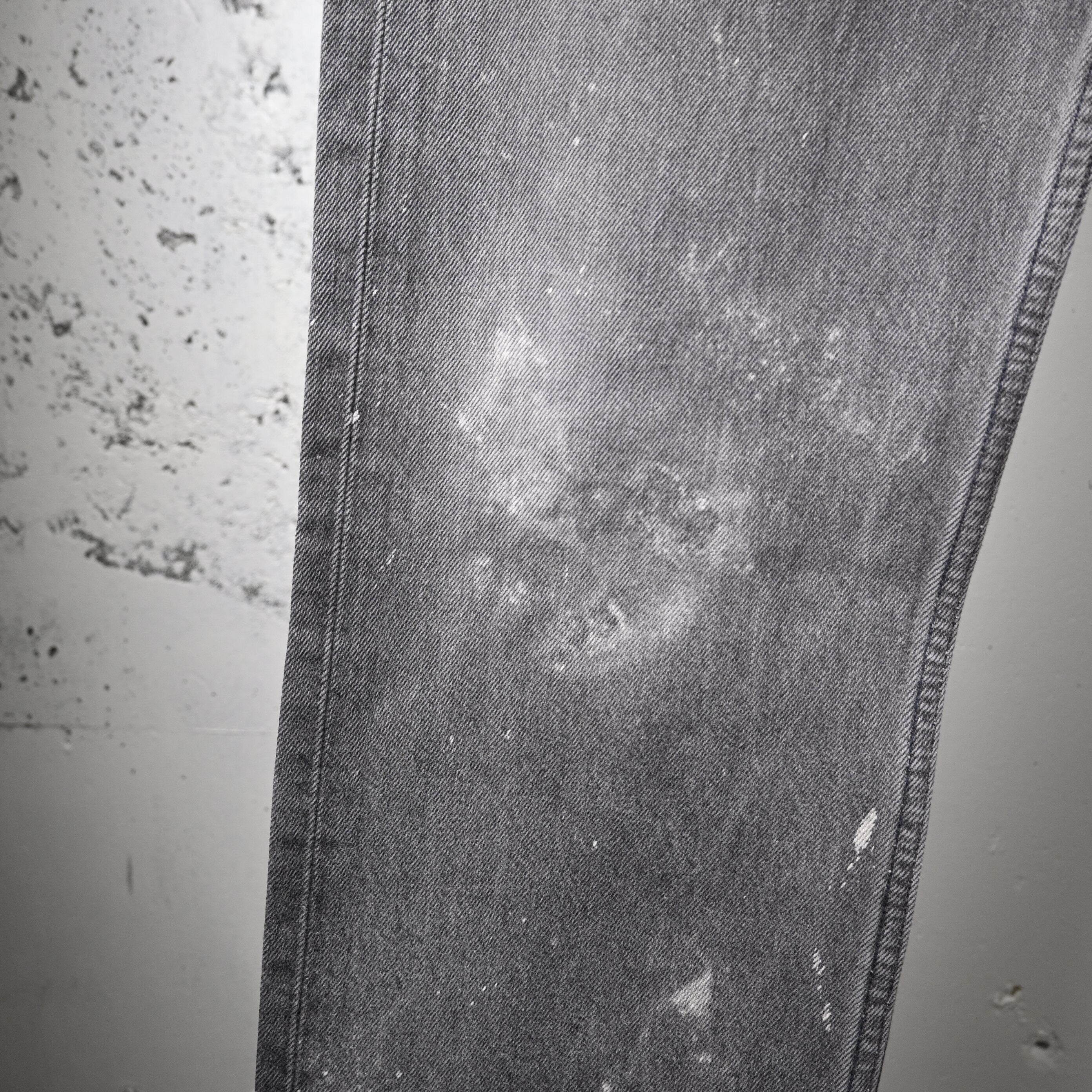 左腿を中心にペンキ跡が入り、ワークウェアのようなリアルな使用感が加わった個体。単なるダメージではなく、この年代のブラック501にしか出せない一点物の表情として楽しめるバランスです。