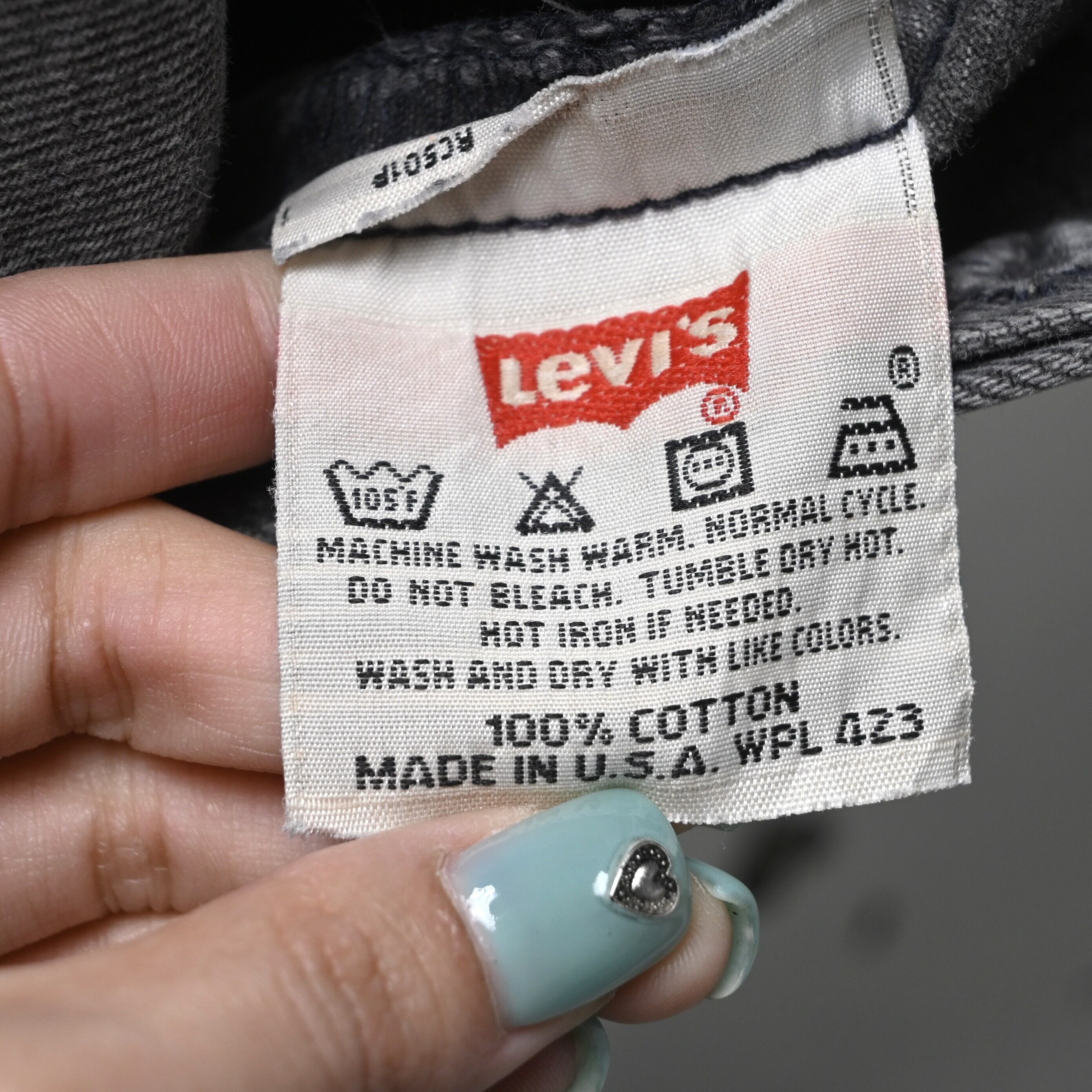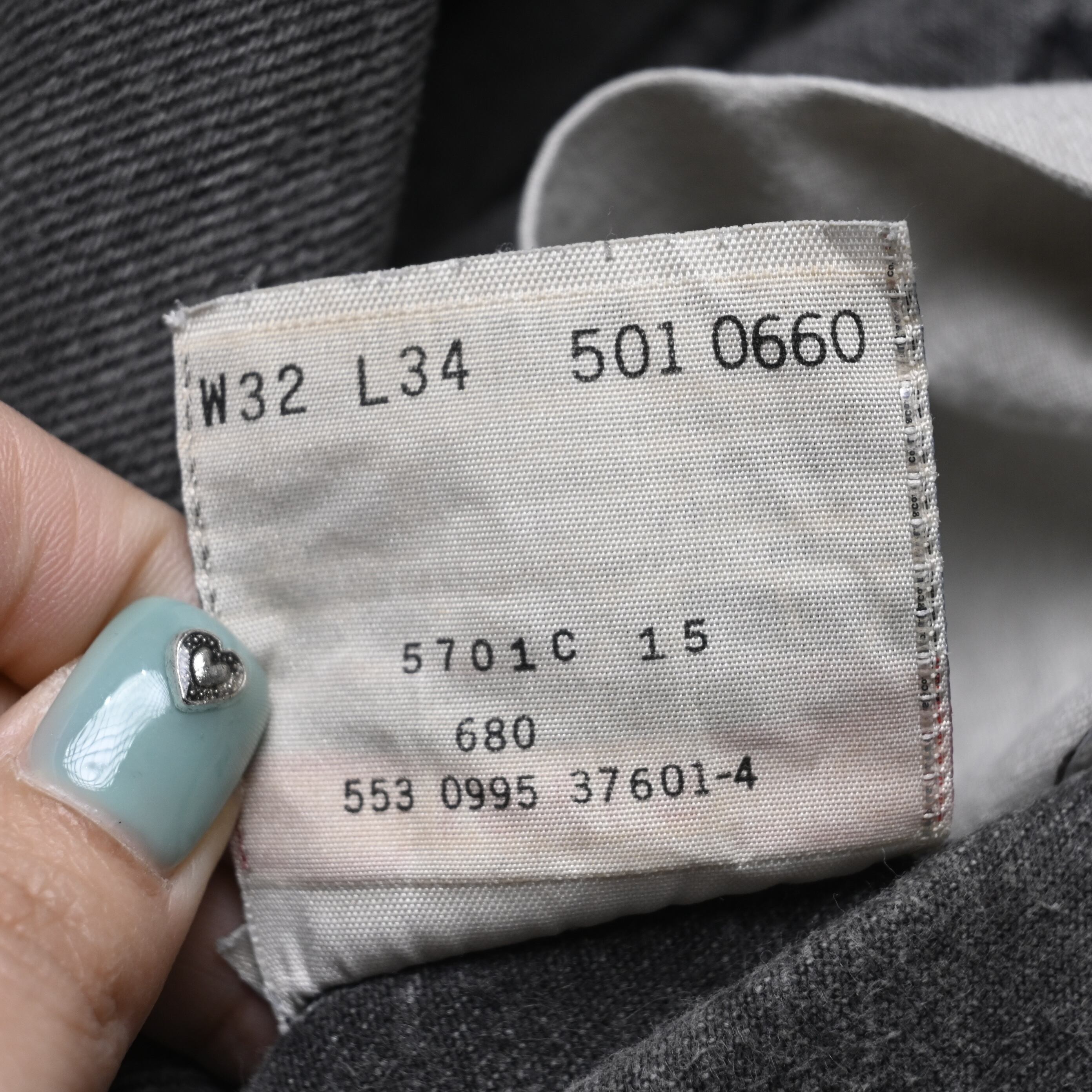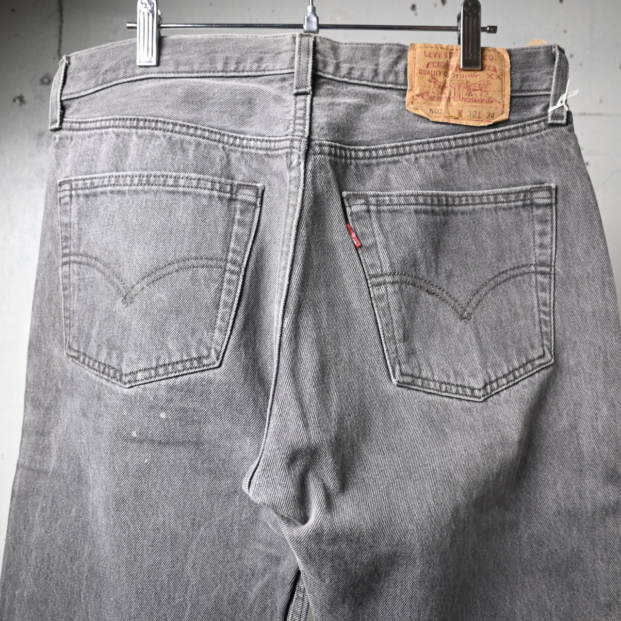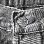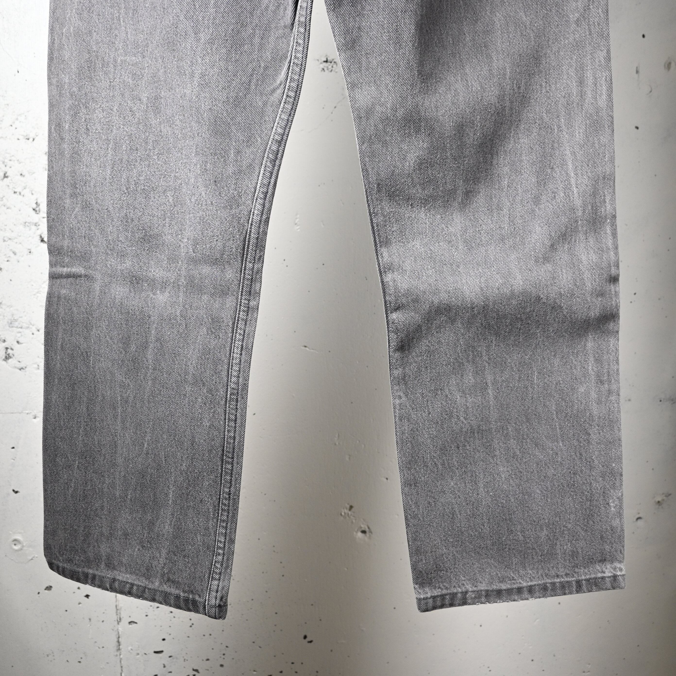 品番501-0660は、ブラック後染めデニムとして長く支持されている定番カラーで、こちらは全体にしっかりとフェードが進み、ブラックからグレーへと柔らかく変化した非常に雰囲気のある一本です。90年代USA製らしいコットン100%デニムのしっかりした生地感に、長年の着用で生まれた自然な色落ちが加わり、新品にはない立体感が出ています。